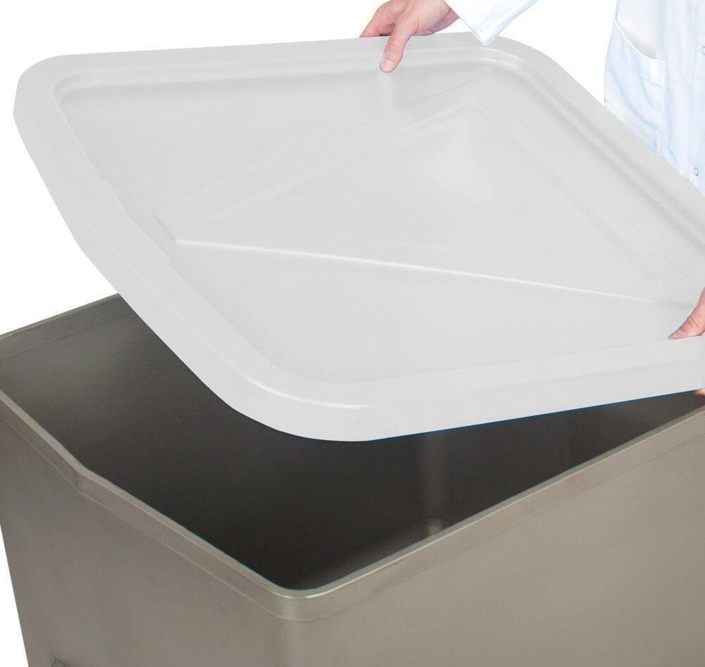 400# Stainless Steel Dump Buggy. Smooth, easy-to-clean interior, reinforced top rim, 14-gauge 304 stainless steel top portion and 11-gauge stainless steel bottom with cross braces for additional strength, (4) 6″ X 1-1/2″ poly wheels, stainless steel axles & nut. Dimensions: 26″ L x 26″ W x 20″ D.