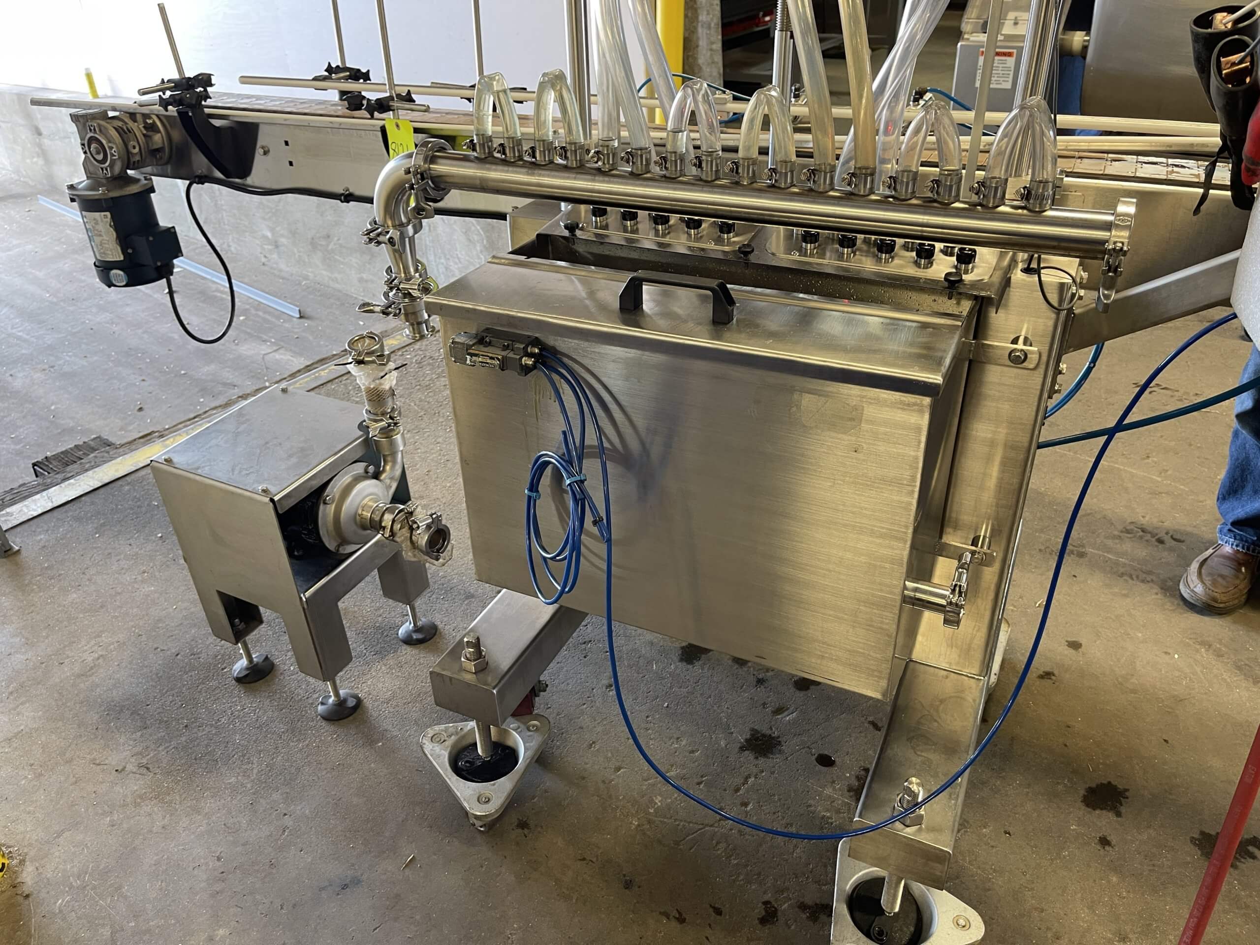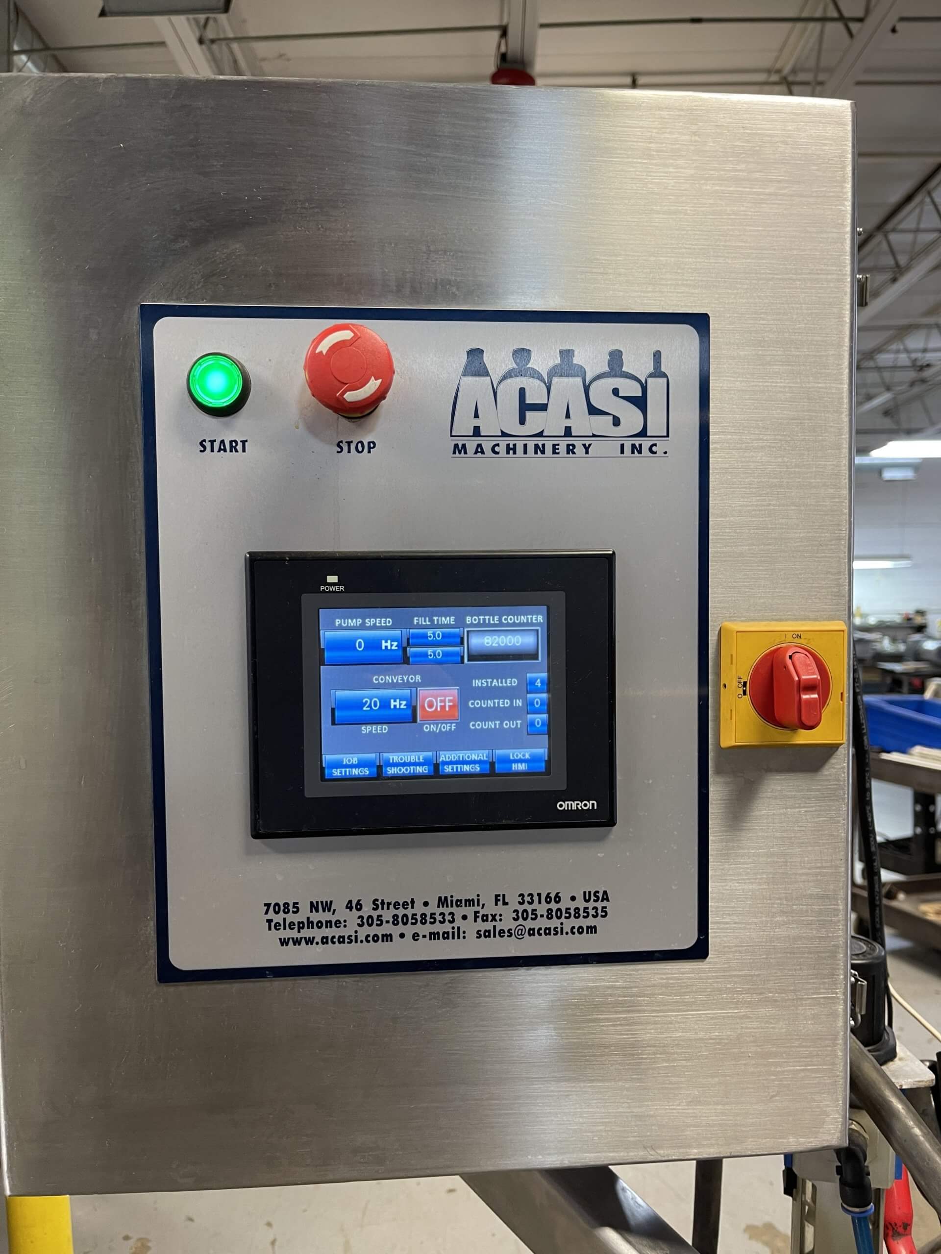 Acasi GI 3300 Pressure Overflow Bottle Filler. Set up as a 4-head machine with PLC-controlled pneumatic drip tray, 10′ conveyor (4.5 in. wide acetal chain) with speed control. 304 Stainless steel heavy duty stainless steel welded C frame. 20 Gallon stainless steel overflow tank, stainless steel feeding manifold.Calibrated guide for fast height changeovers. Filling machine mounted on 4 heavy duty casters. Omron PLC logic functions, Frequency control drive for pump speed, acceleration and deceleration.Front panel bottle filling time adjustment through Omron Timer. Front panel mounted bottle counter. Fiber optic sensors for container gating. No bottle no fill PLC controlled.96 Gallon per minute, 316 stainless steel centrifugal pump.10 inch stroke air cylinder with magnetic sensors for nozzle up and down movement. 316L Stainless steel sanitary check valve mounted on pump. Nozzle spacing fully adjustable through top screw. Container height adjustment from 1 to 16 inches high. Nozzle stroke adjustments from 0 to 10 inches. Entry and exit bottle gating cylinders adjustable, sideways, up and down and inside and outside.Will work with plastic or glass containers.1hp motor, 220V/3PH/60Hz,10 Amps. 5 CFM @ 80 p.s.i.