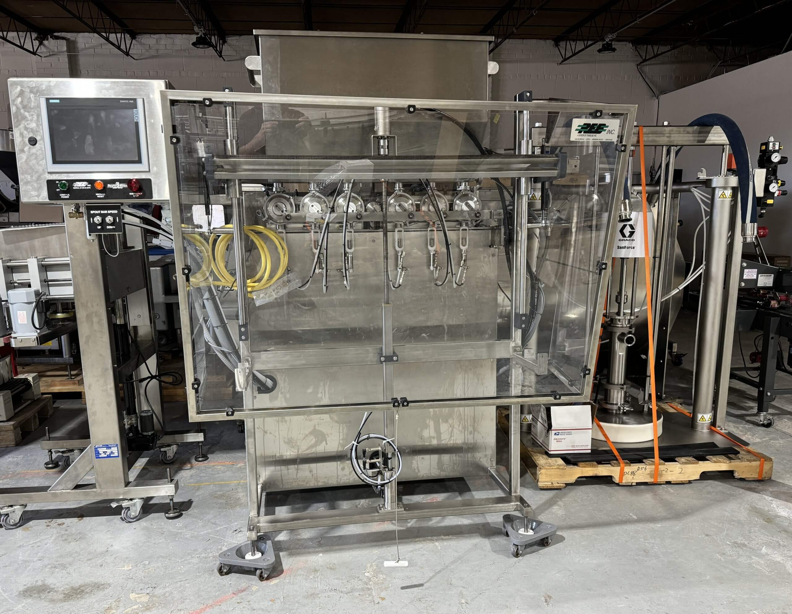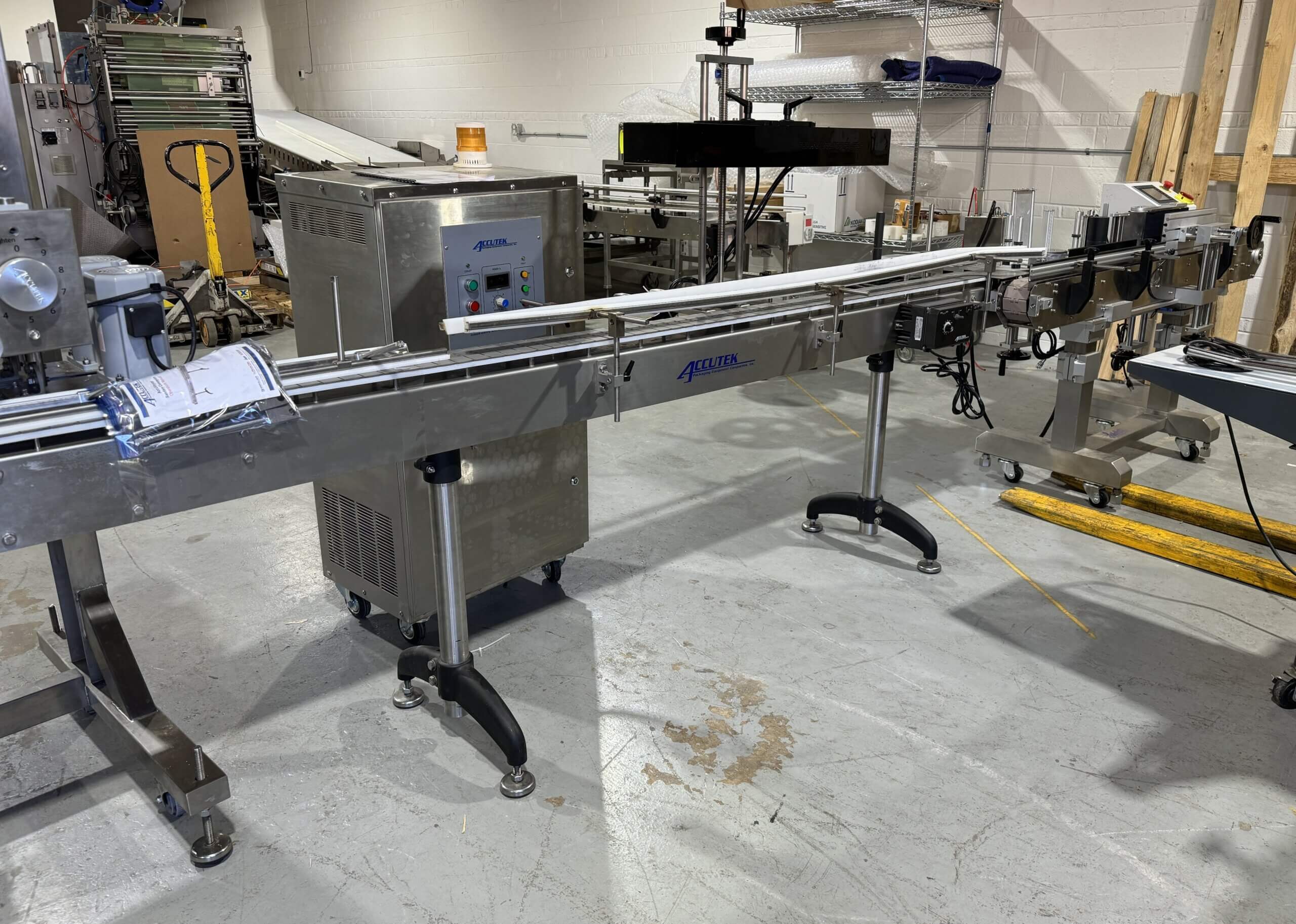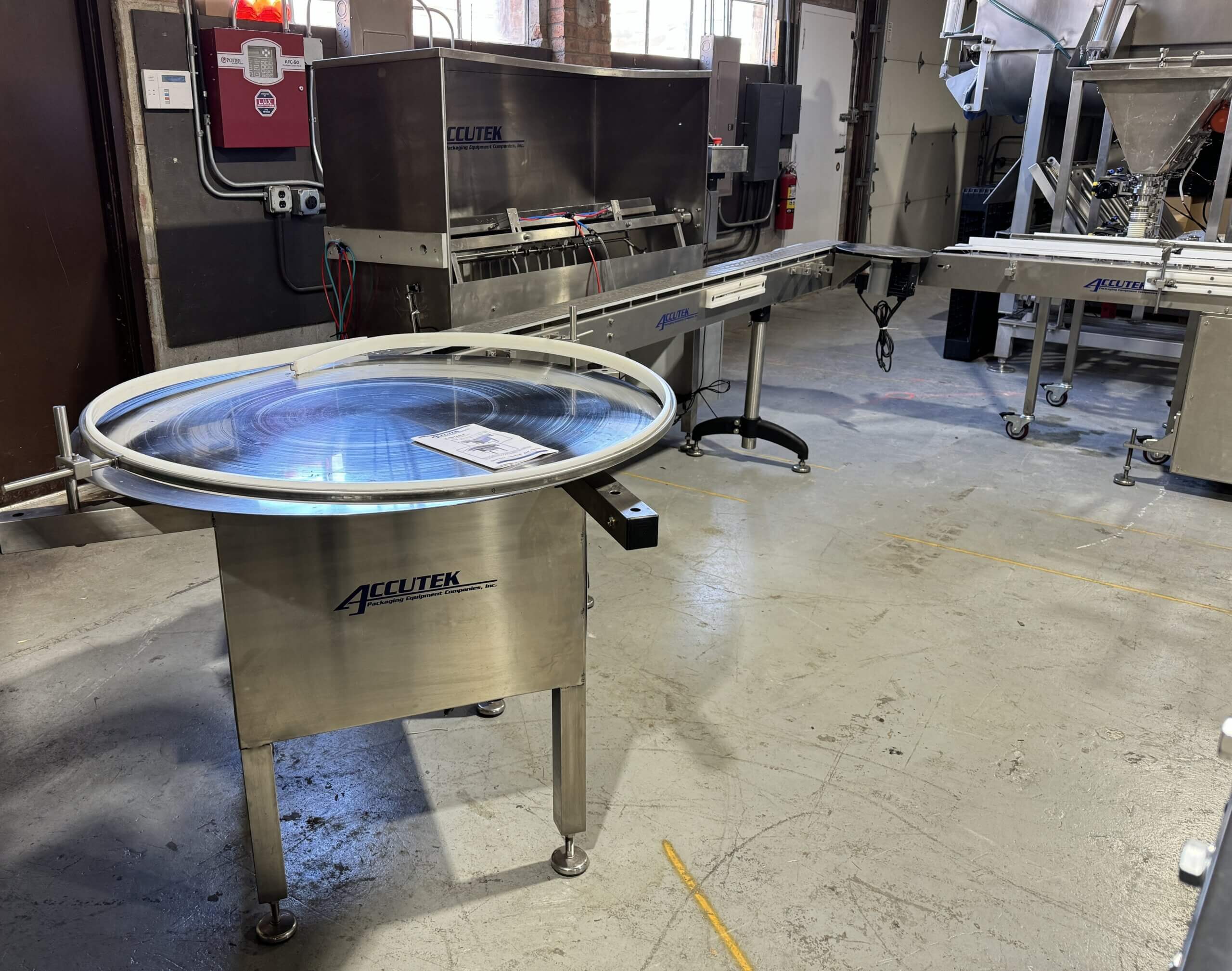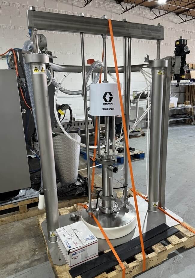 Includes Graco SaniForce Drum Unloader, REB, Mdl. IVS-6, SN 2070 Six head piston filler with Accutek sanitary conveyor, (2) Accutek, Mdl. 28.042 Unscrambling tables, Accutek, Mdl. 50.BP1.LO2 Jar Sanitizer with Accutek sanitary conveyor, Accutek, Mdl. 50.OOE.OH2 Cap Bulk Loader elevator and Orientator, Acuutek, Mdl. ASC-6 Automatic Spindle Capper, Acuutek Automatic Induction Cap Sealer with Accutek sanitary conveyor, Accutek, Mdl. 2A.APS.106 Label applicator with code dater.