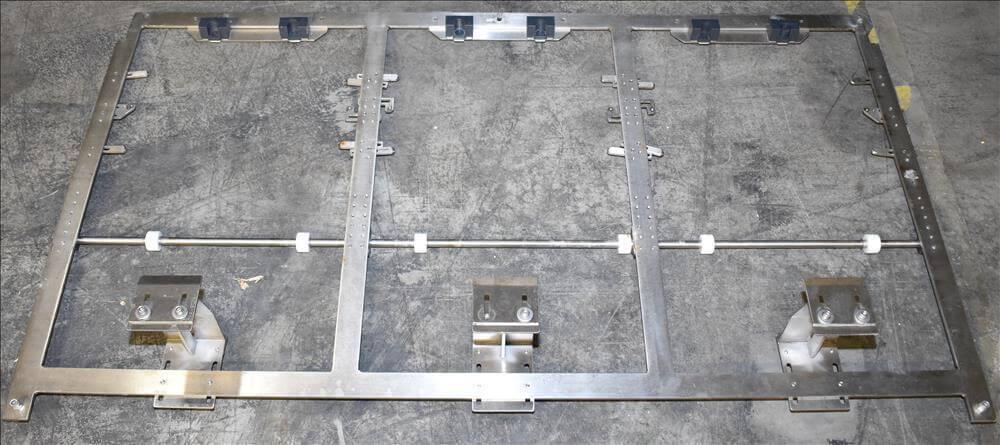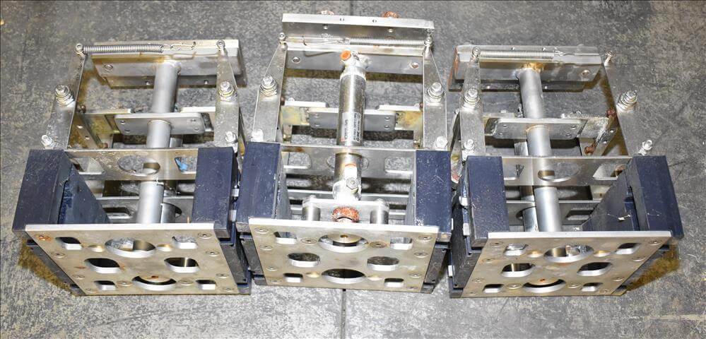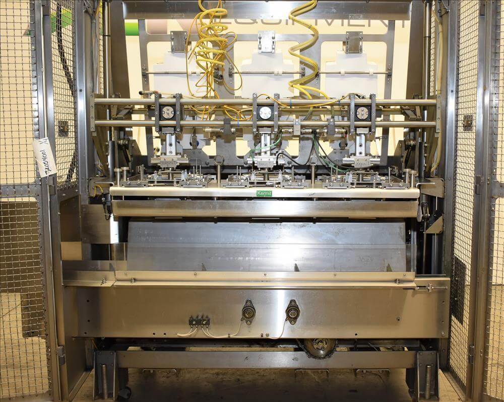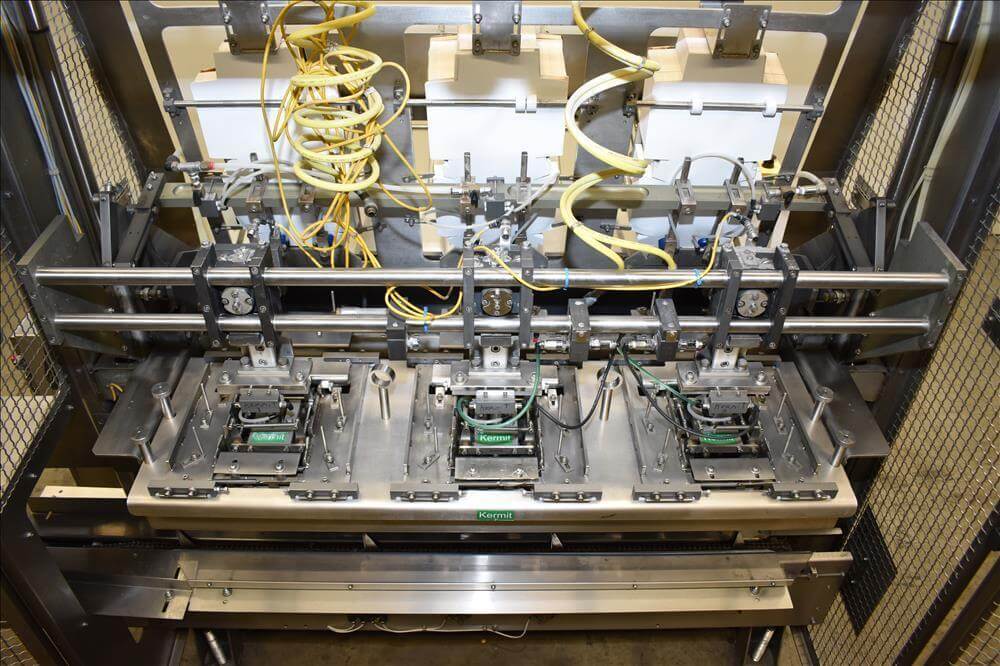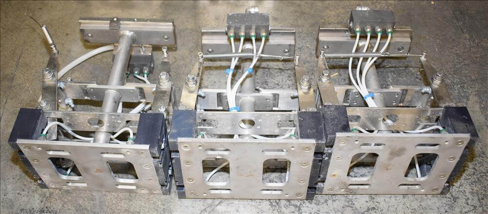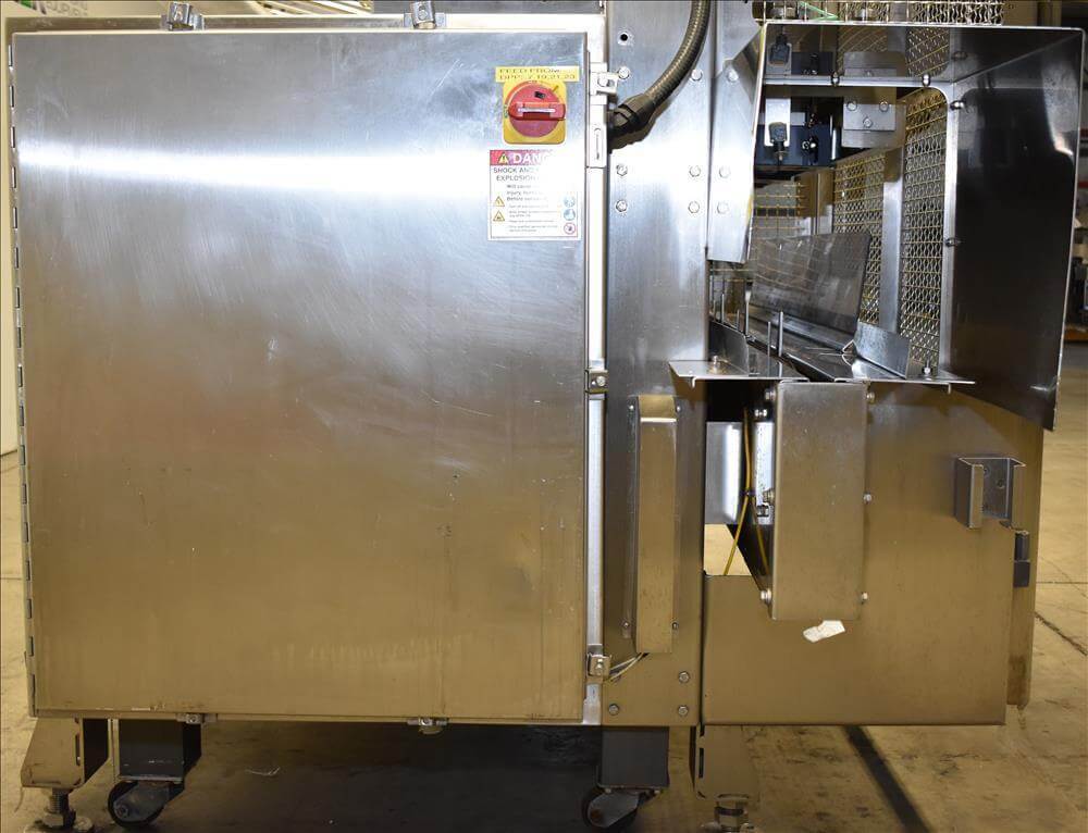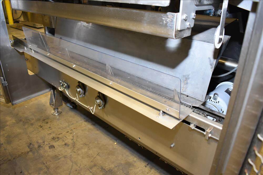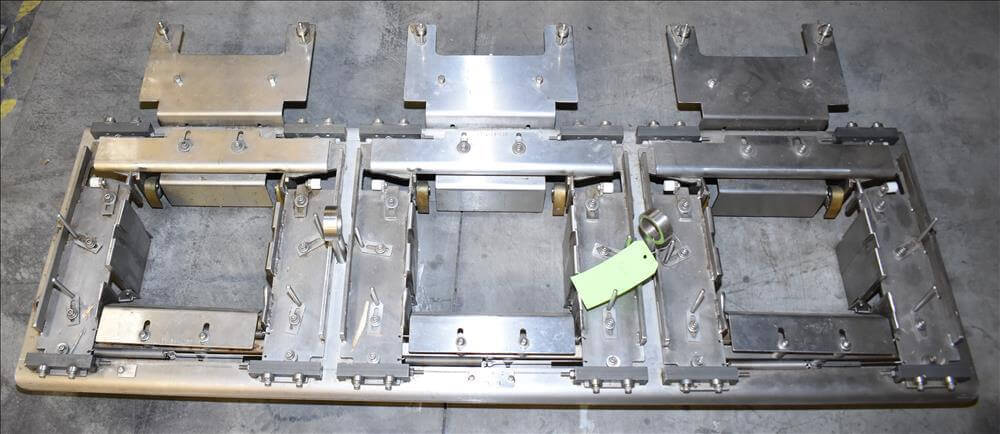 ADCO AFHXX-40-3-WD Triseal Carton Former. Three head former for tab-lock style hooded trays. All Stainless Steel construction Washdown Nema 4X. Top load carton / hooded tray size range: Length 3″ to 17″; Width 3″ to 8″; Depth 0.75″ to 4″ subject to tooling configuration. Now tooled for 3 trays: 6-7/8″ x 6-1/4″ x 2-1/4″. Additional tooling is available, contact AEK for more information. Equipped with vacuum generator blank pick and place. Controls are Allen-Bradley CompactLogix L32E PLC, an AB PanelView 600 HMI. 230V.-3PH.-60Hz.-20 AMPS. Comp air 90 psi, cfm.