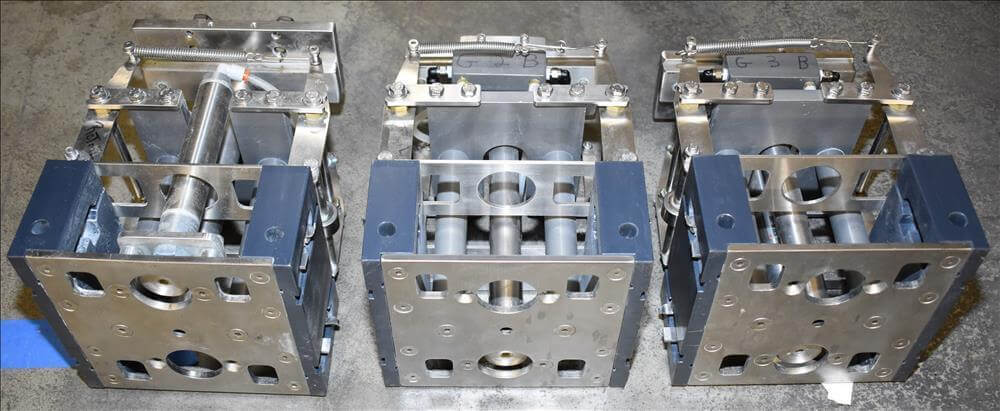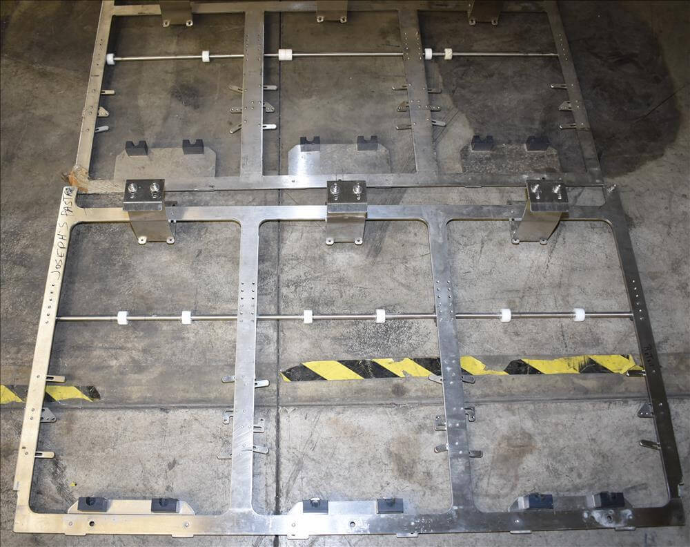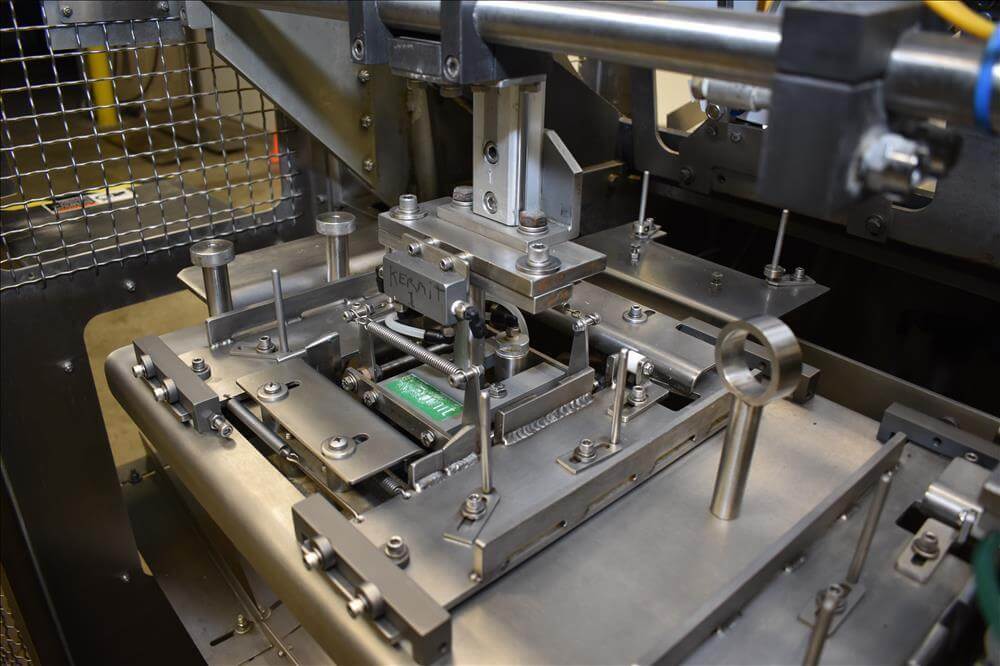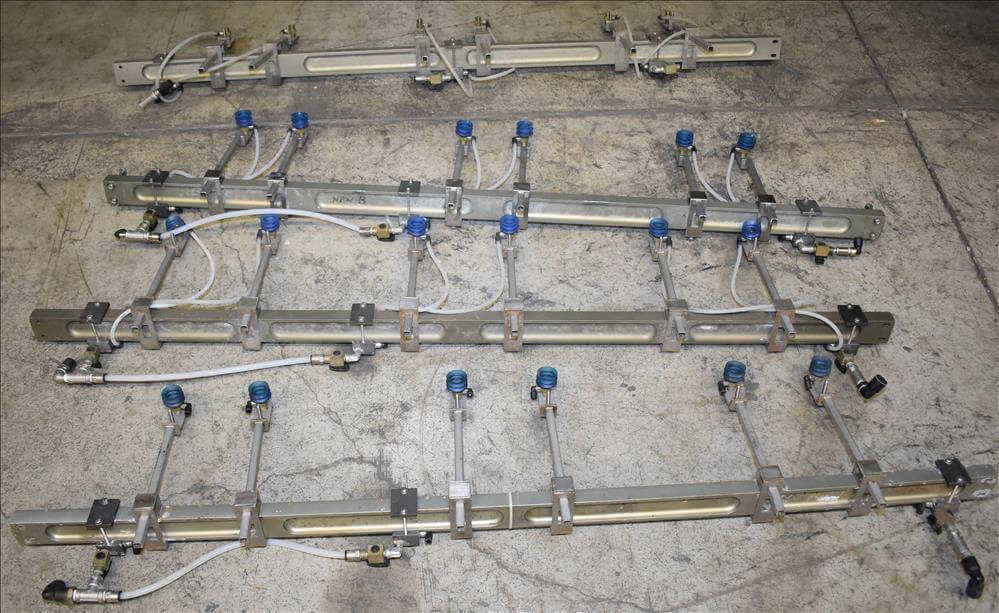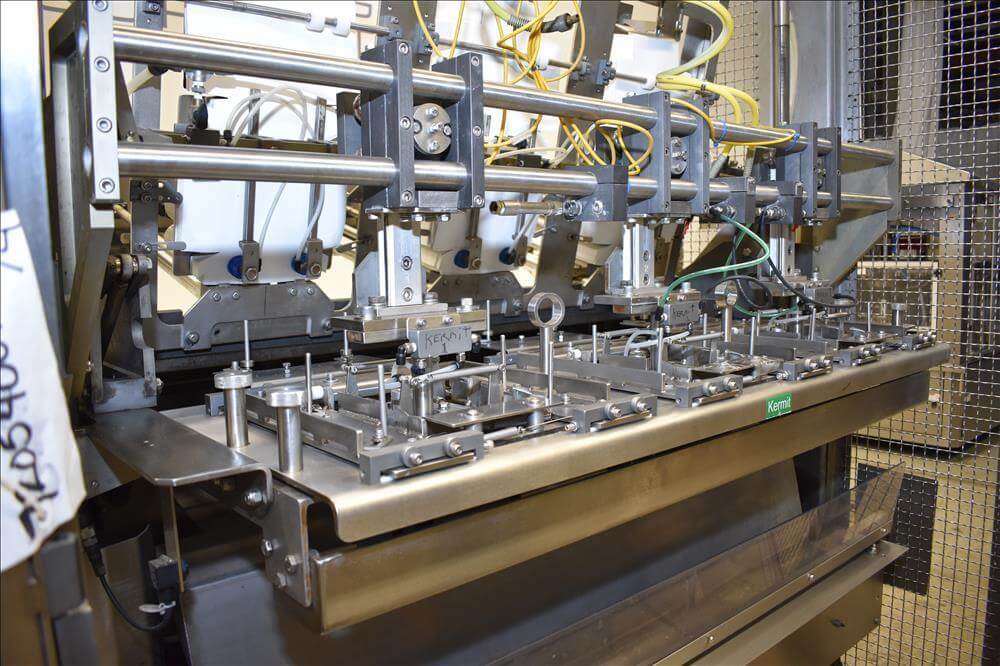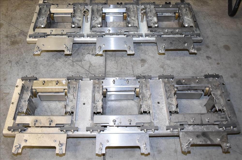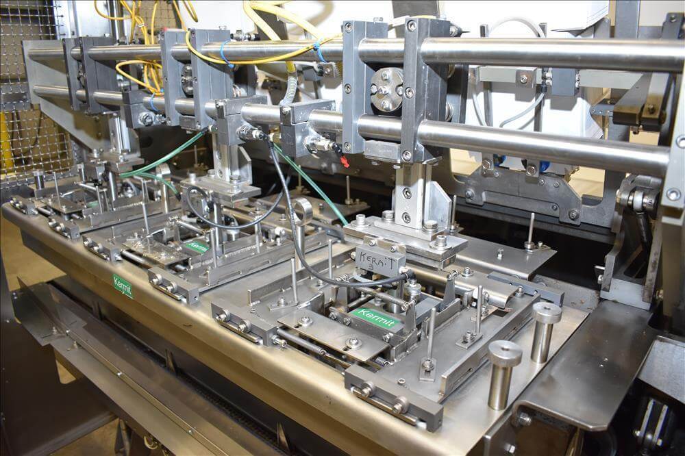 ADCO AFHXX-40-3-WD Triseal Carton Former. Three head former for tab-lock style hooded trays. All Stainless Steel construction Washdown Nema 4X. Top load carton / hooded tray size range: Length 3″ to 17″; Width 3″ to 8″; Depth 0.75″ to 4″ subject to tooling configuration. Now tooled for 3 trays: 6-7/8″ x 6-1/4″ x 2-1/4″. Additional tooling is available, contact AEK for more information. Equipped with vacuum generator blank pick and place. Controls are Allen-Bradley CompactLogix L32E PLC, an AB PanelView 600 HMI. 230V.-3PH.-60Hz.-20 AMPS. Comp air 90 psi, cfm.