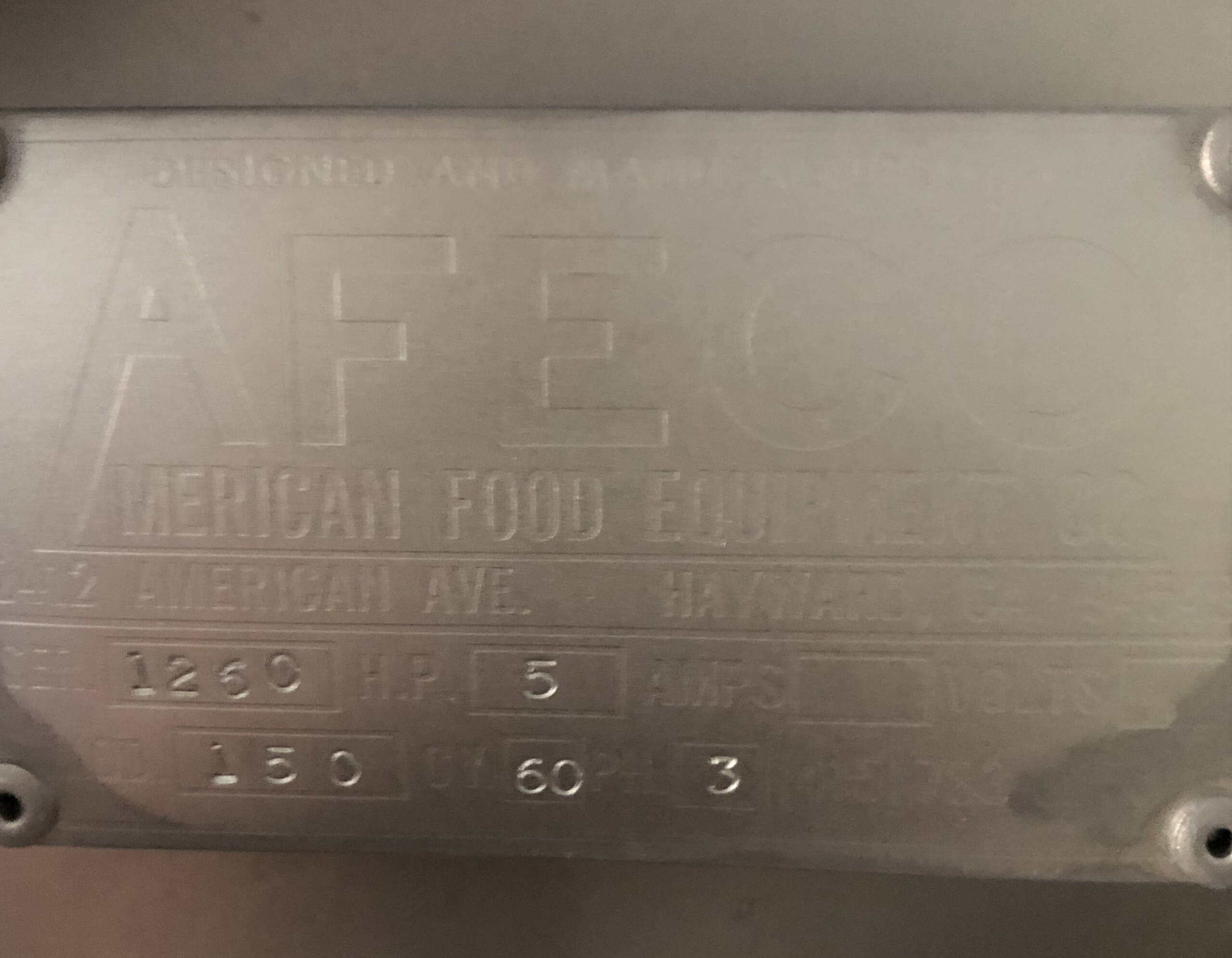 AFECO 150 Incline Screw Conveyor. Stainless steel construction. Full safety covers, 14″ x 18′ long auger, 59″ x 42″ hopper. Mounted on casters, with full safety covers and controls. 5hp chain drive gearmotor, 1700 RPM, 440V/3PH/60Hz.