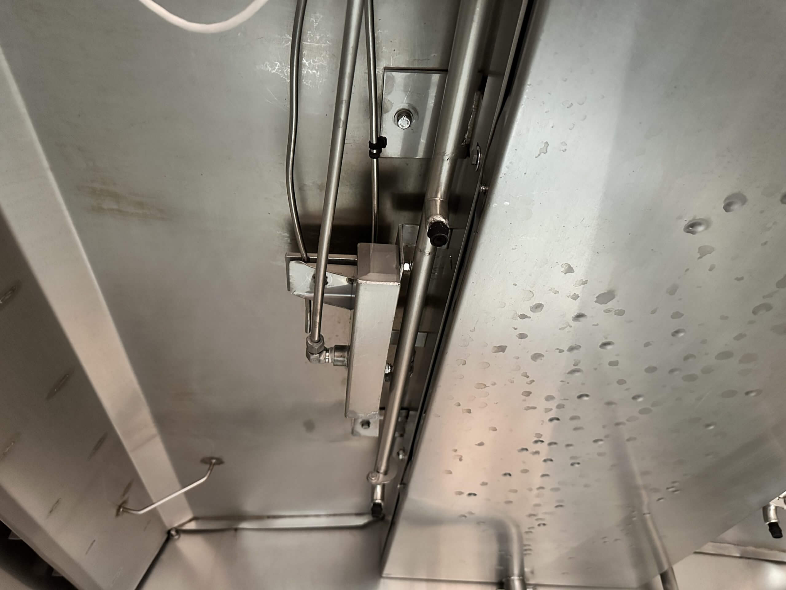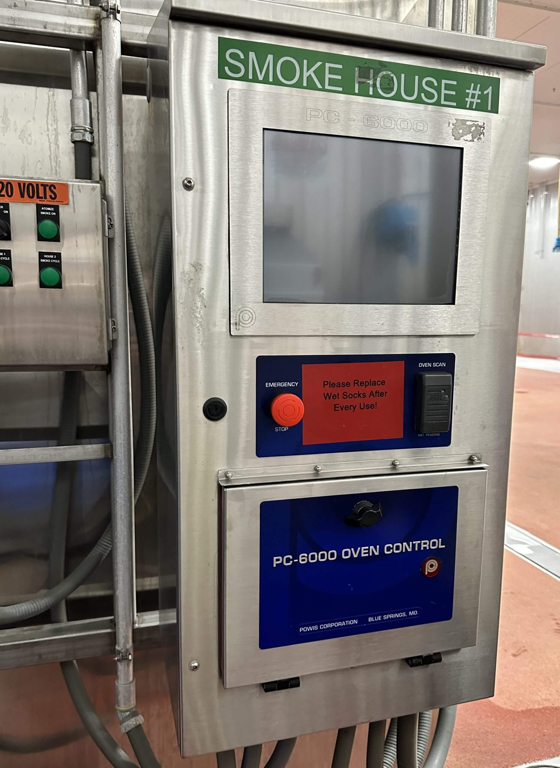 Alkar 1000 Smokehouse. One truck capacity, estimated 1,000 lbs. product capacity, Red Arrow liquid smoke system. Includes 1 42″ x 72″ Stainless steel smokehouse truck with 7 stations. Electric and Steam cook feature, Powis PC-6000 Control panel with touch screen. Top-mounted blower fan. 460V/3PH/60HZ, 31 Amps.