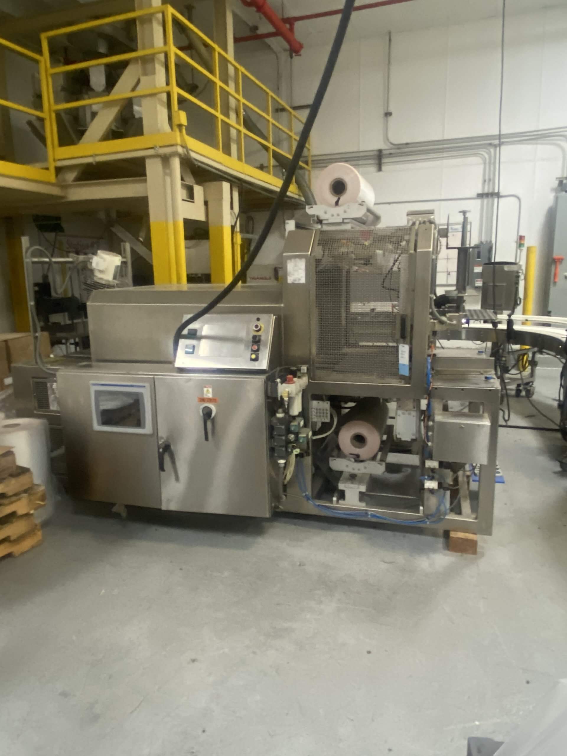 ALL PAC MACHINERY MAS -26 SS SHRINK BUNDLER. Allen Bradley PanelView Plus 1250 touchscreen control. Set up for a 90-degree product infeed. Intermittent motion cross seal bar, 27.5 in. wide, with 6 in. long x 14 in. wide product hold down. SS wire belt for heat tunnel 96 in. long x 24 in. wide x 37 in. tall. SS heat tunnel 48 in. long, aperture 28 in. wide x 13.5 in. tall. Ambient cooling fan after heat tunnel. Film rolls stand for top and bottom. 30 in. wide film feed rollers. Digital heat controls for tunnel and seal bar. Manual controls include cycle start, cycle stop, manual close, and e-stops. Light tree function indicator. Heavy duty SS tubular frame, on legs. 240V/3PH/60HZ.