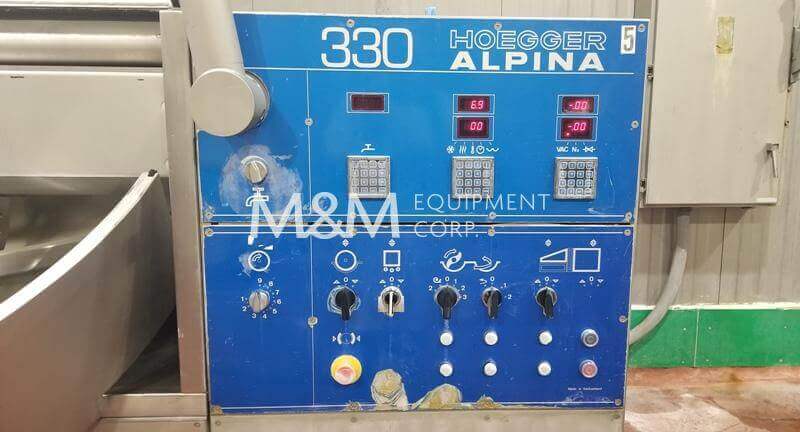 Alpina 330 Liter Vacuum Bowl Chopper. Stainless steel construction, 330 liter capacity. Self contained hydraulic system to operate vacuum cover. Includes built-in loader and unloader. 3 speed knife shaft. 480V/3Ph/60Hz.