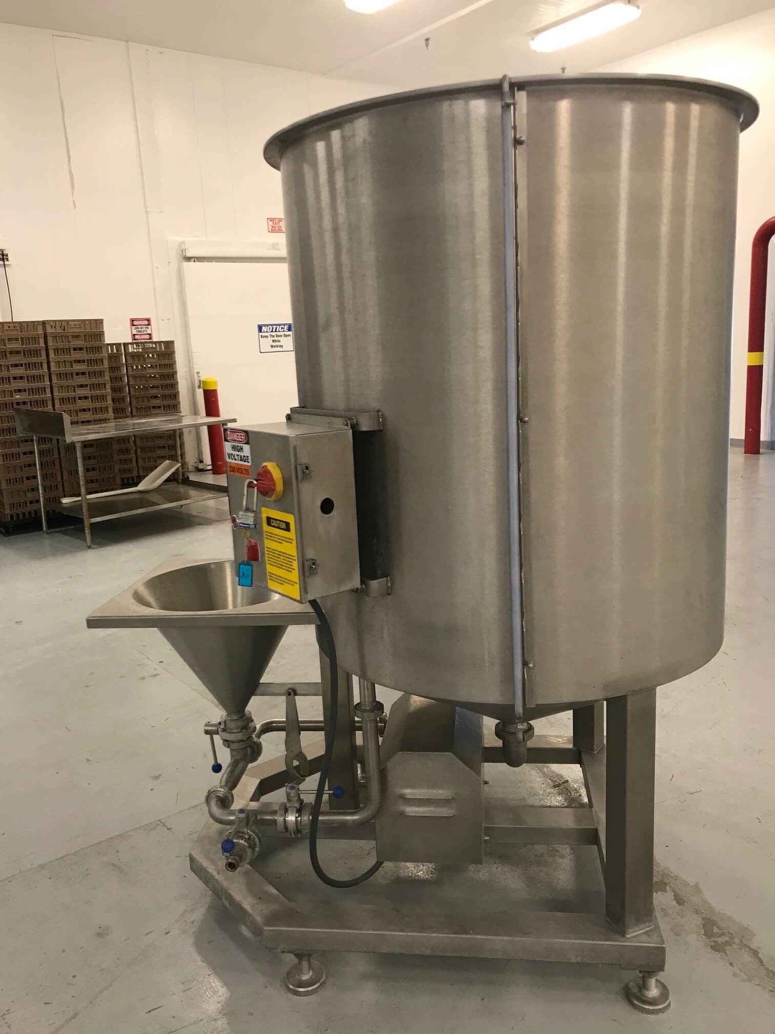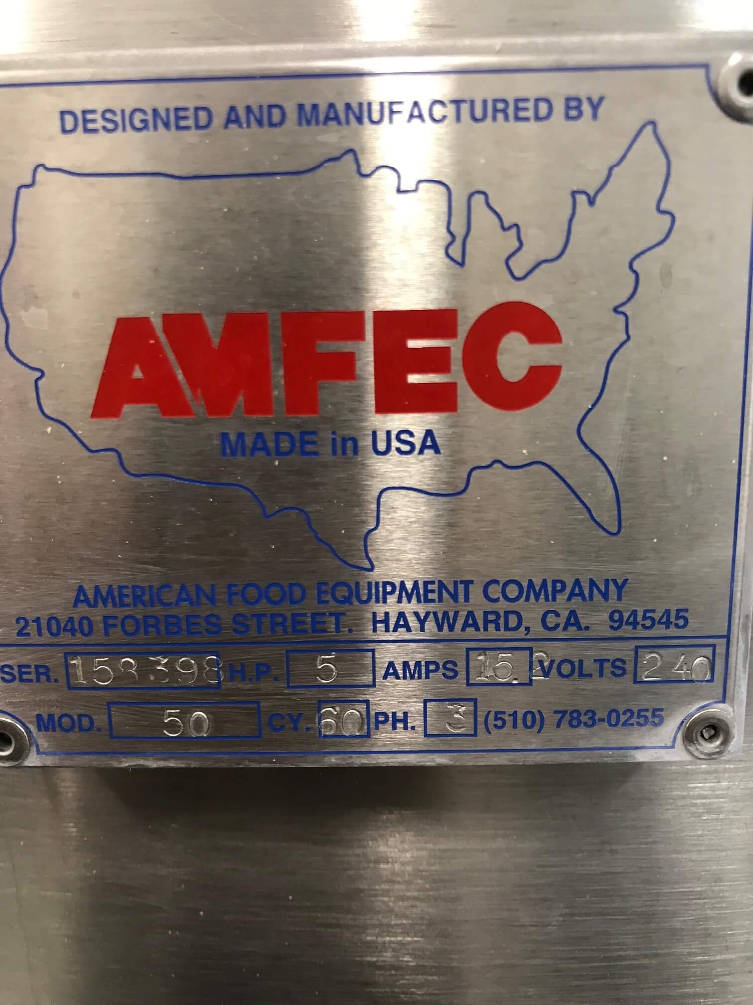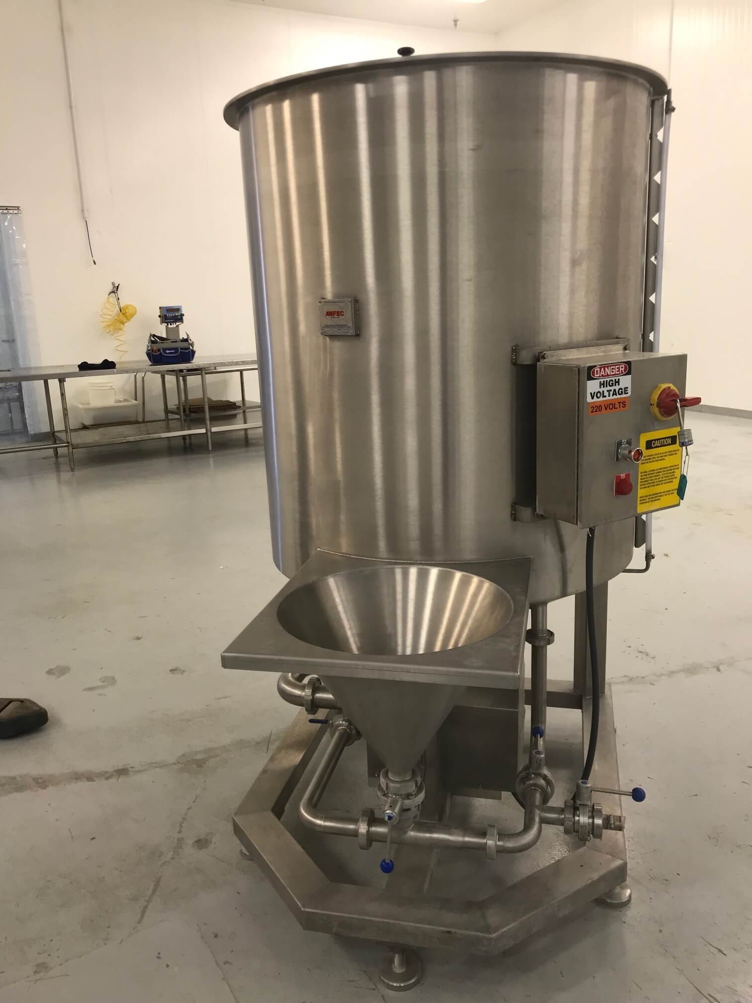 AMFEC 50 Brine Mix System. Automatic feed Brine Mix system, stainless steel construction, vertical tank with cone bottom, 80 lbs. induction hopper, 5 hp pump motor, 240V/3PH/60HZ, 15.2 Amps.
