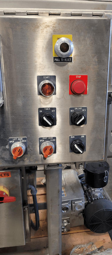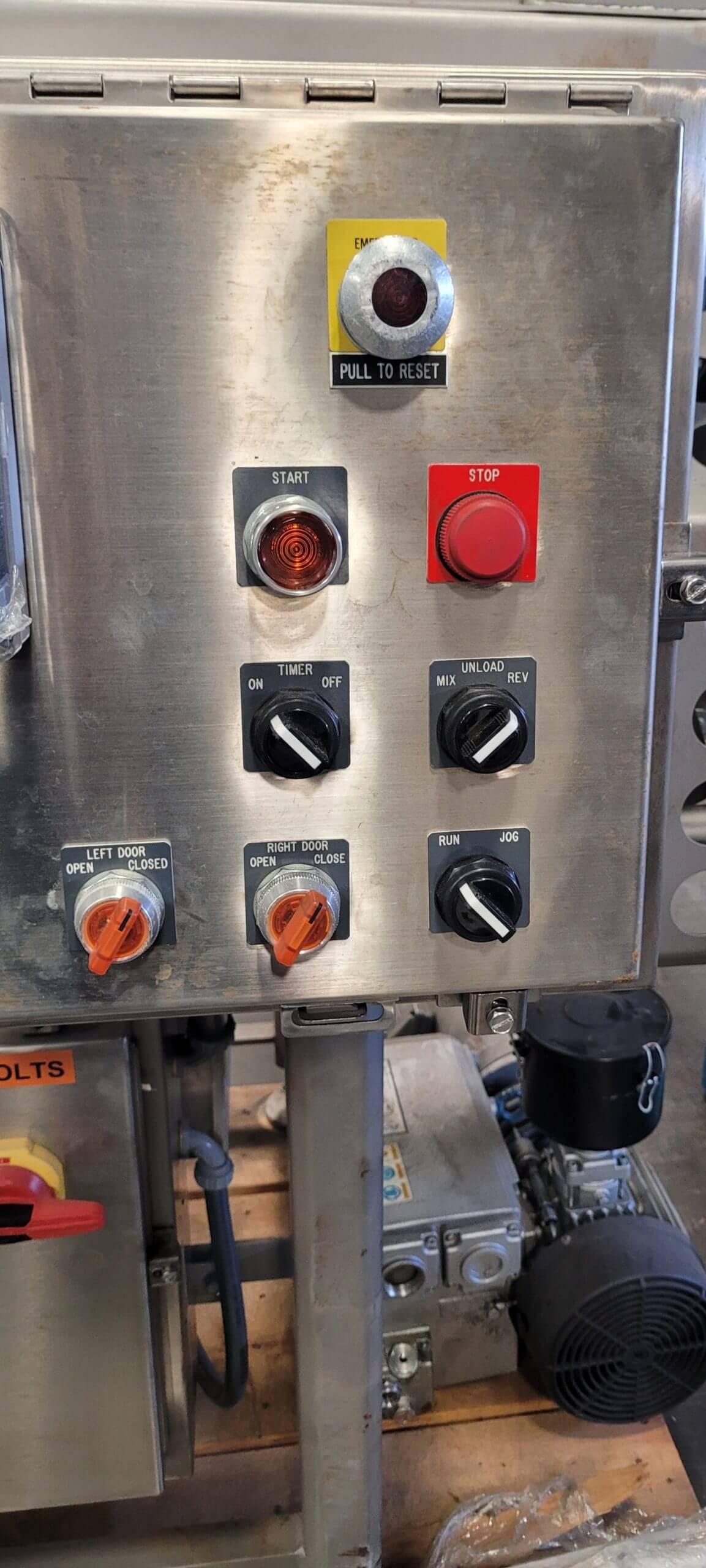 AMFEC 500 Lbs. capacity dual shaft paddle blender. Stainless steel construction. Includes control panel, Dual bottom end pneumatic operated discharge doors. Full top safety cover, dual 2 hp motors, 220V/3PH/60HZ, 13AMPS.