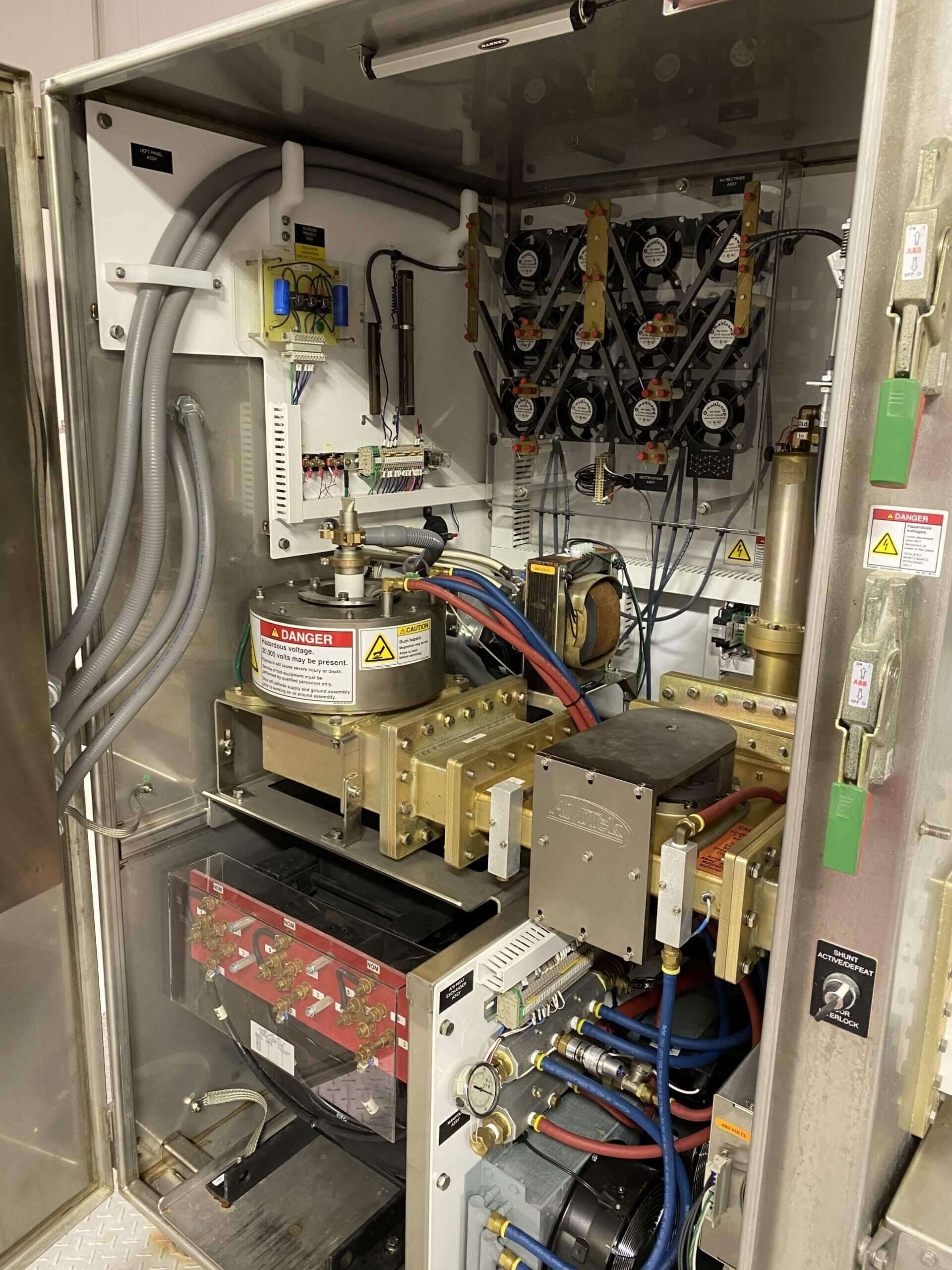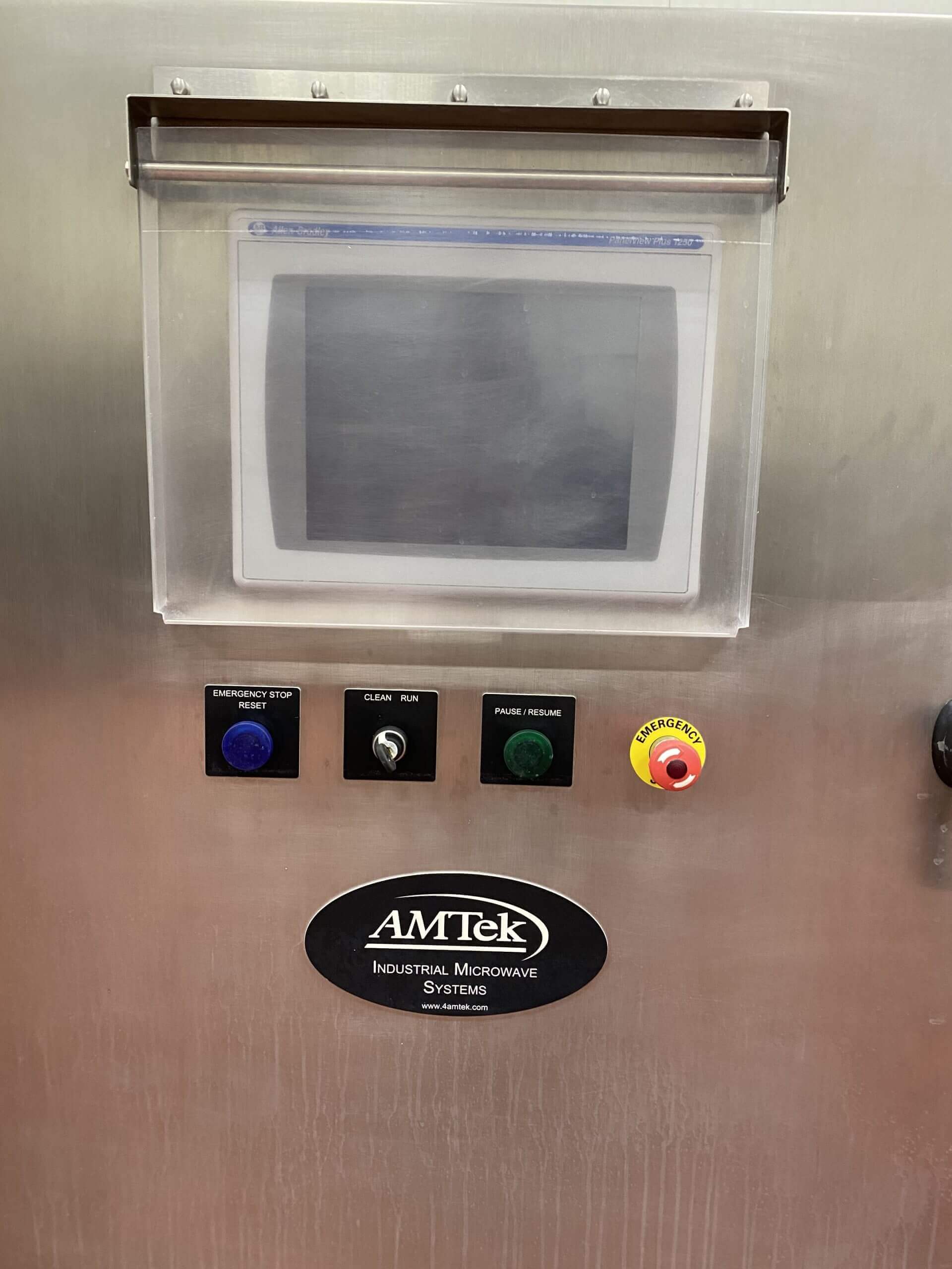 Amtek Microwave Cooking System. 36″ wide X 23′ long plastic conveyor belt, 3″ product clearance. 75Kw out put power transmitter, 915 Mhz frequency, 1 hp drive motor, 480V/3PH/60HZ, 150 Amps.