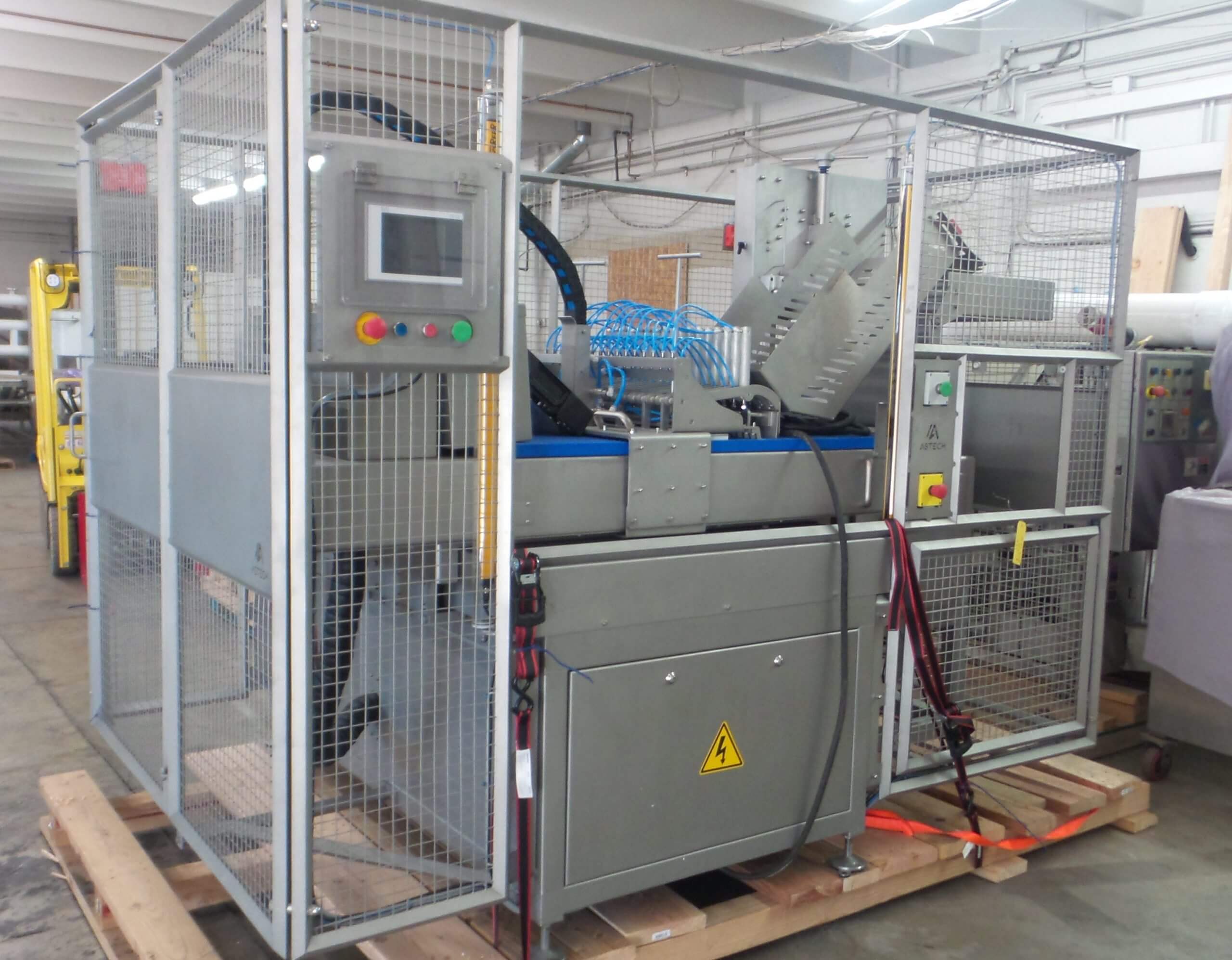Astech SRA1 Band Saw & Poultry Saw. Automatic Band Saw for cutting frozen bone-in or boneless meats. Include product loader, holding grippers, Removal belt, Protective guards and Touchscreen Control panel. 440V/3PH/60HZ. Requires 80PSI @ 60CFM.