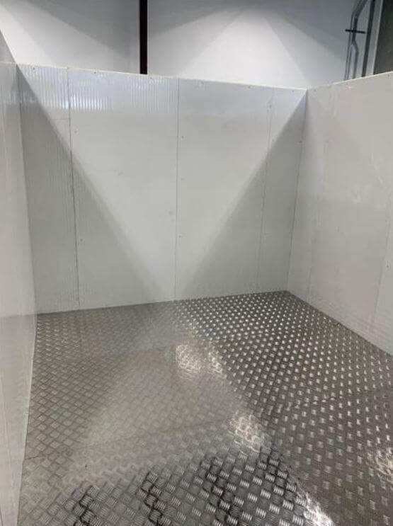 Walk-In Freezer & Cooler. 9”10″ x 14’10” x 8’H. Cam-lock wall & ceiling panels with 4″ urethane insulation. White interior/exterior finish. Includes (1) 36″ x 78″ left-hand swinging door (can be installed on either side) with new easy to install vinyl strip curtain kit, new floor with aluminum diamond plate. 3 HP Low temp system 0 to -5 degree storage. 220V/1PH/60HZ.
