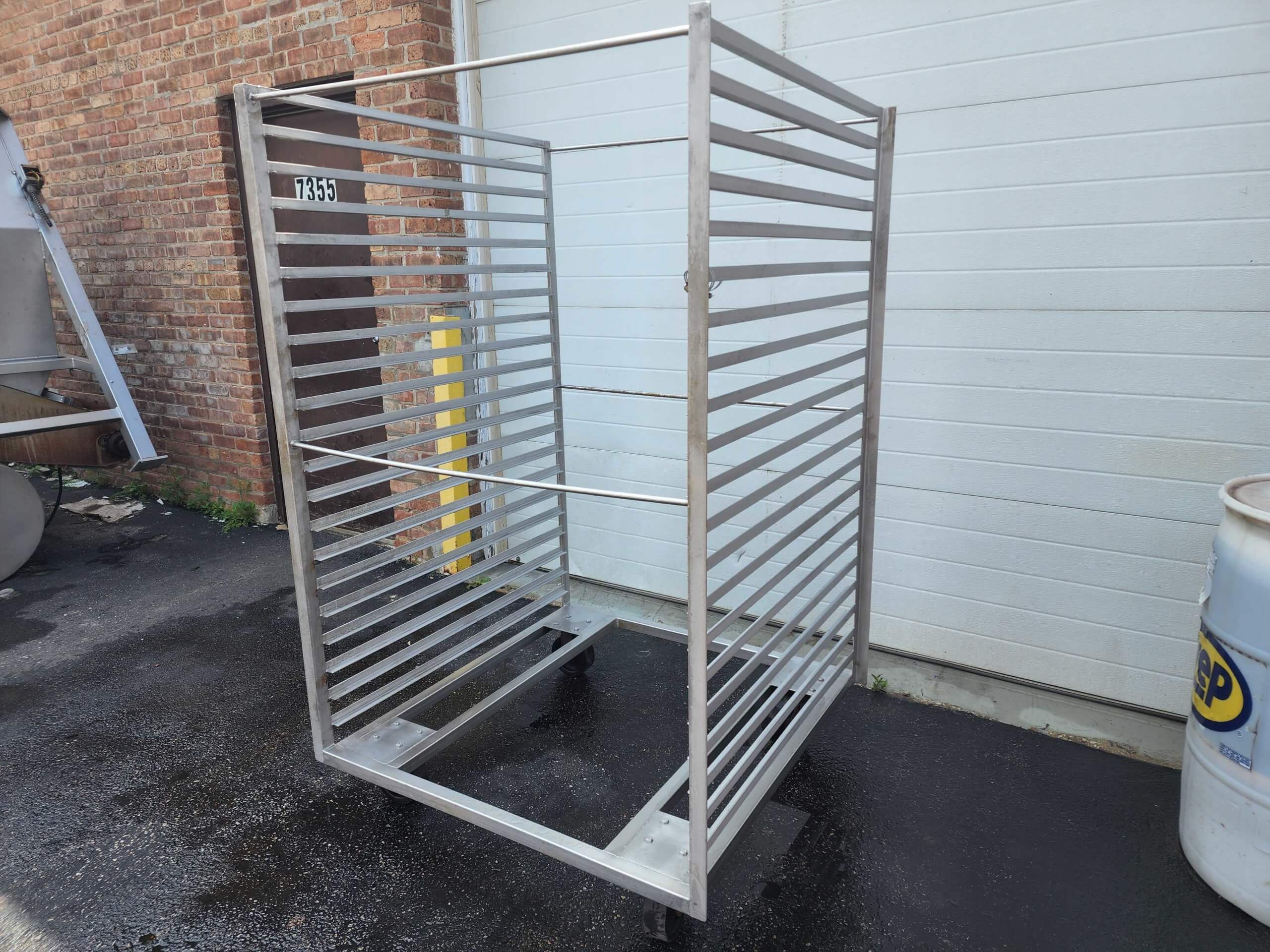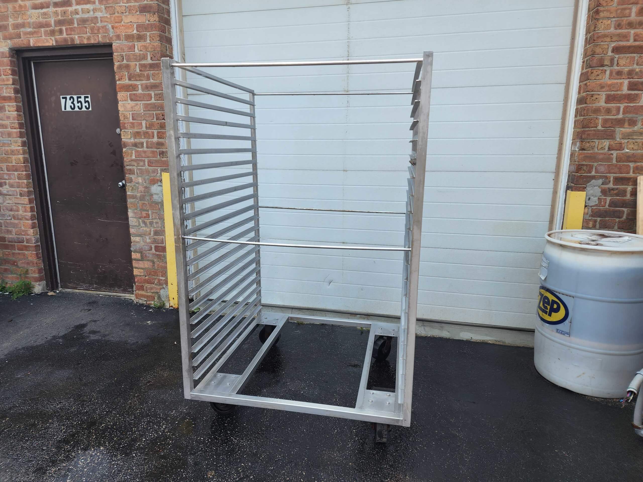 BEACON SMOKEHOUSE TRUCK. All stainless steel construction, overall dims 45.5″ x 44″ x 71″, 21 levels spaced 3″ apart, set to fit a 42″ x 42″ screen, mounted on 6″ casters.