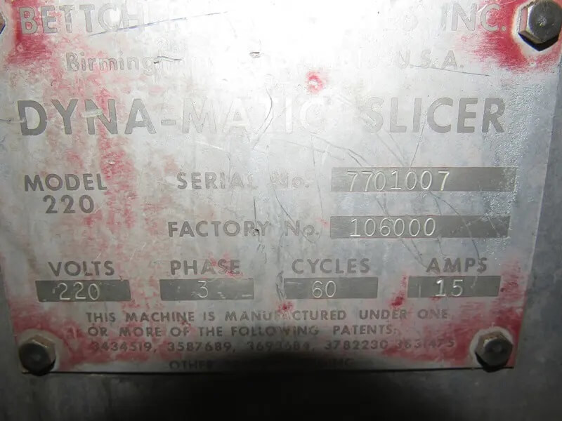 Bettcher 220 Tempered Meat Slicer. Tripe Turret hopper, slice rate of 2,400 to 24,000 portions per hour. 220V/3PH/60HZ, 15 Amps.