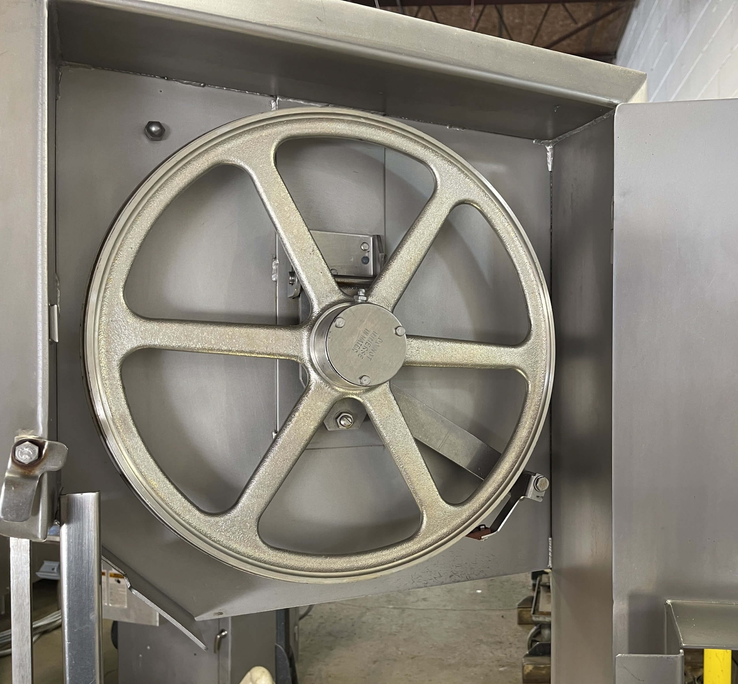 BIRO 3334-4003FH Band Saw. Stainless steel base with stainless steel head and removable door. 3 HP TEFC motor, non slip V-belt drive, 124″ X 5/8″ X .02 Blade, 3,200’/min., 16″ diameter blade wheels, roller product carriage 18″ X 25″, 220V/3PH/60Hz.