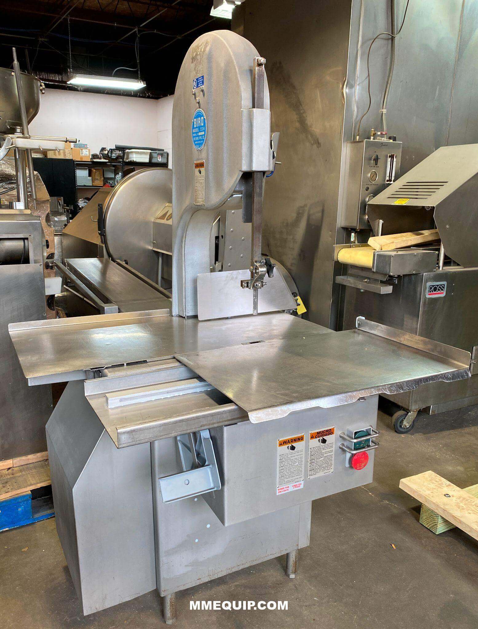 BIRO 3334 Band Saw. Stainless steel base with aluminum head and removable door. Ratchet arm blade tensioner. 2 HP TEFC motor, non slip V-belt drive, 124″ X 5/8″ X .02 Blade, 3,200’/min., 16″ diameter blade wheels, roller product carriage 18″ X 25″, 220V/3PH/60Hz.