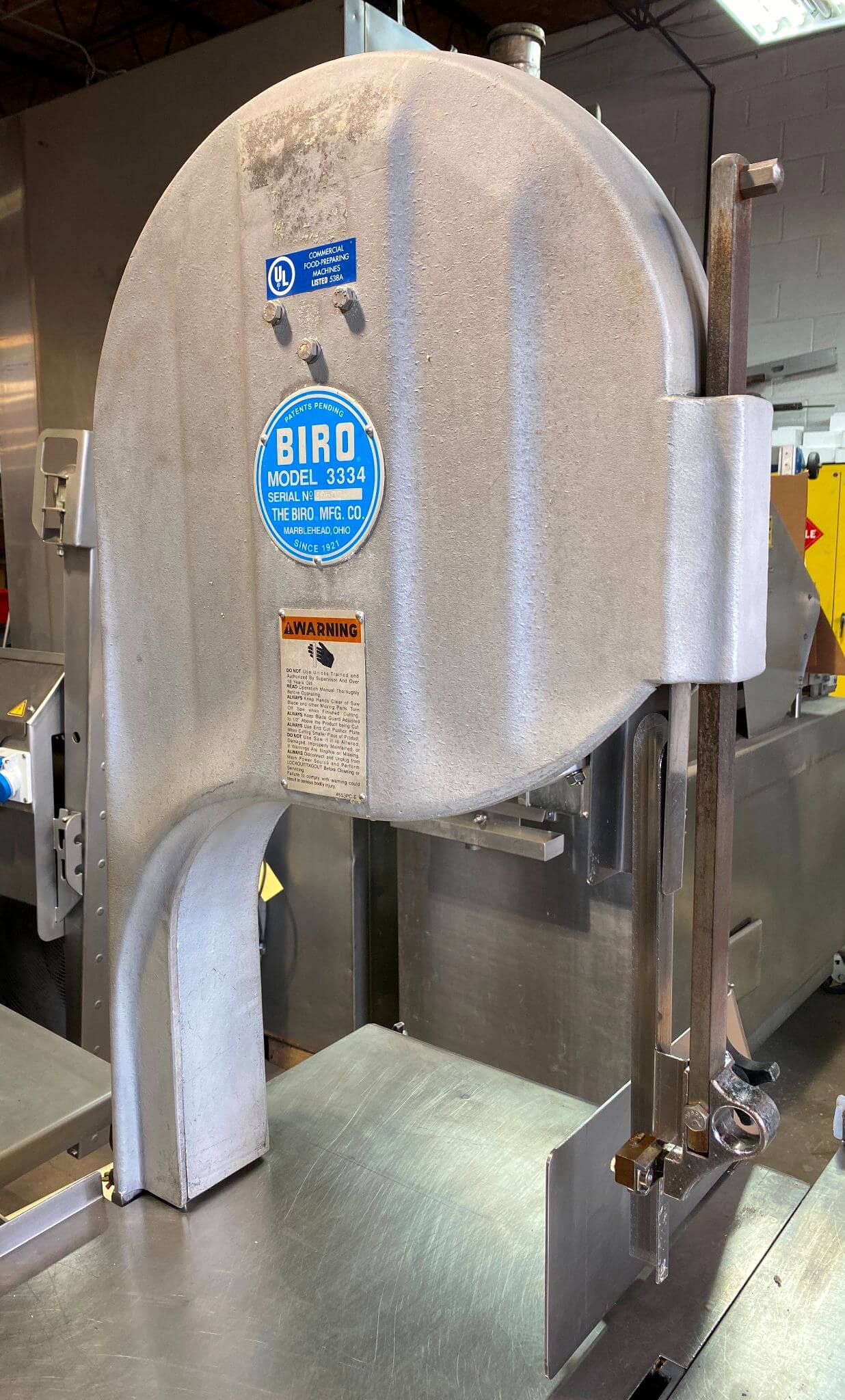 BIRO 3334 Band Saw. Stainless steel base with aluminum head and removable door. Ratchet arm blade tensioner. 2 HP TEFC motor, non slip V-belt drive, 124″ X 5/8″ X .02 Blade, 3,200’/min., 16″ diameter blade wheels, roller product carriage 18″ X 25″, 220V/3PH/60Hz.