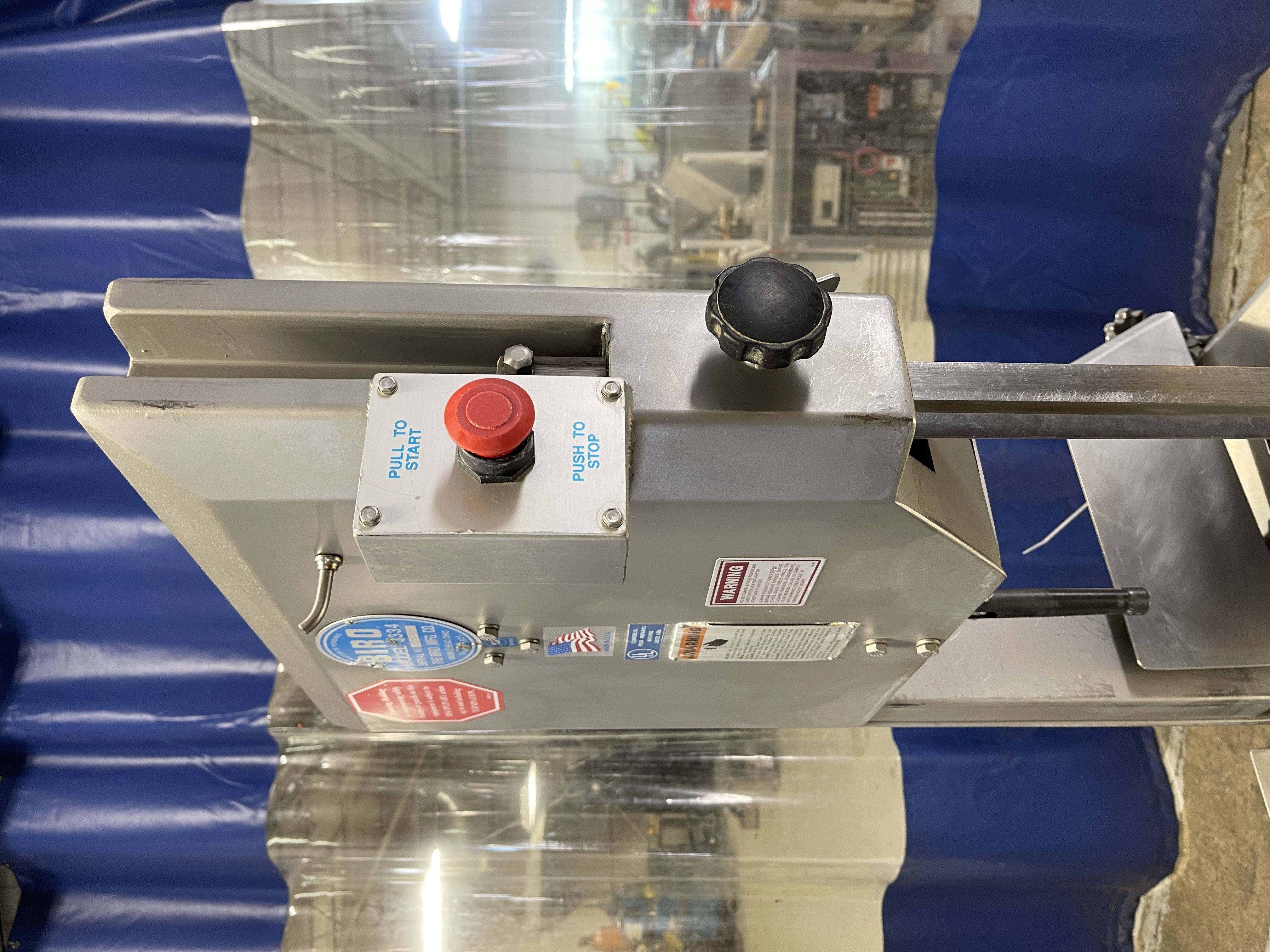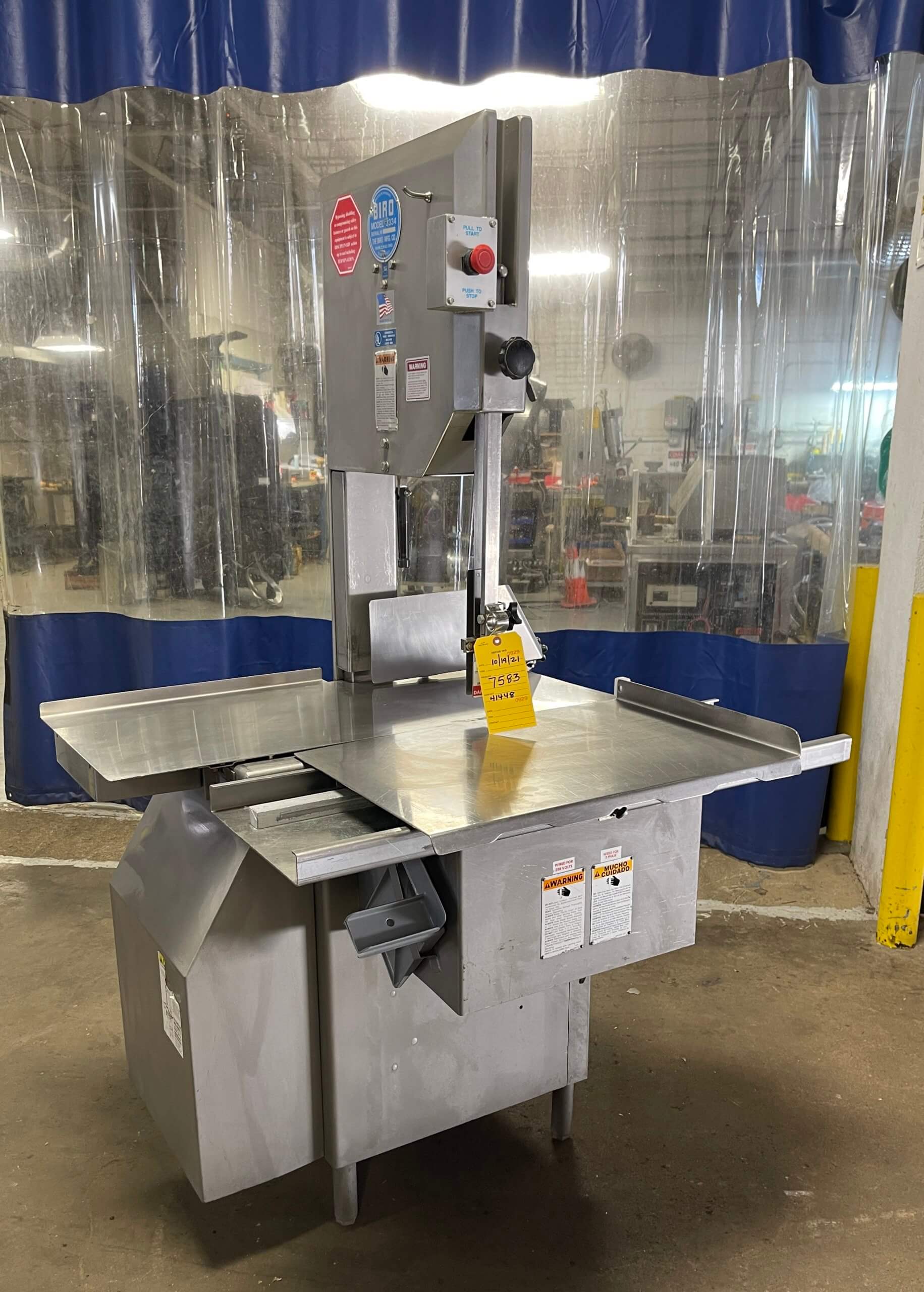 BIRO 3334 Band Saw. All stainless steel construction, 2 HP TEFC motor, non slip V-belt drive, 124″ X 5/8″ X .02 Blade, 4,000’/min., 16″ diameter blade wheels, roller product carriage 18″ X 25″, 220V/3PH/60Hz.