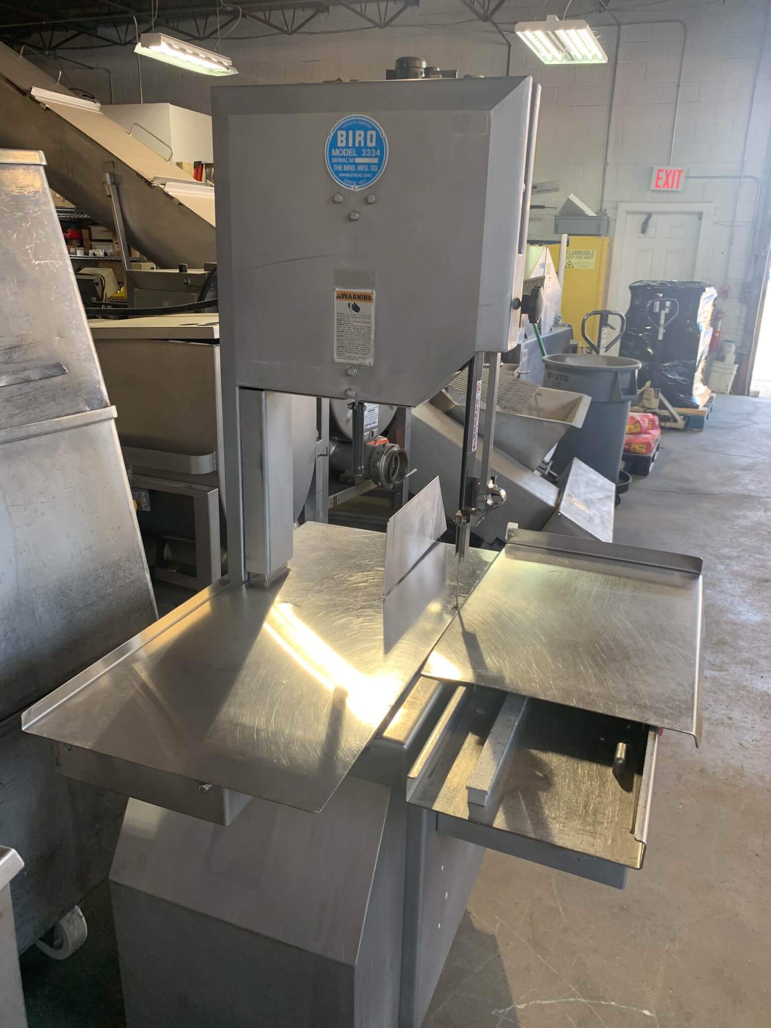 BIRO 3334FH Band Saw. Fixed Head design, all stainless steel construction, 3 HP TEFC motor, non slip V-belt drive, 124″ X 5/8″ X .02 Blade, 4,000’/min., 16″ diameter blade wheels, roller product carriage 18″ X 25″, 220V/3PH/60Hz.
