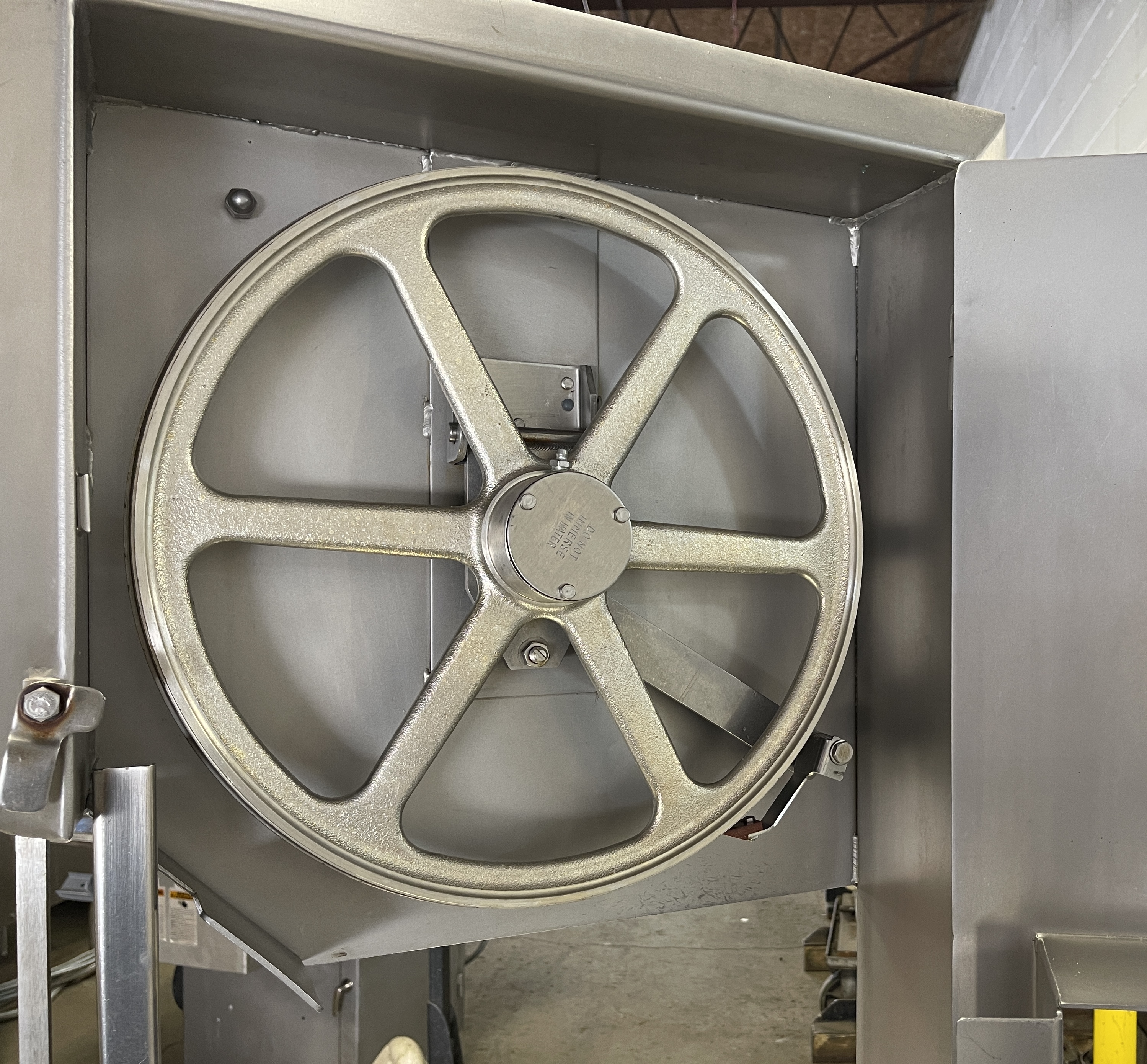 BIRO 3334SS Band Saw. Stainless steel base with aluminum head and removable door. Ratchet arm blade tensioner. 2 HP TEFC motor, non slip V-belt drive, 124″ X 5/8″ X .02 Blade, 3,200’/min., 16″ diameter blade wheels, roller product carriage 18″ X 25″, 220V/3PH/60Hz.