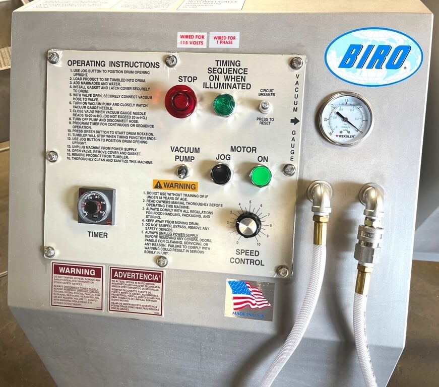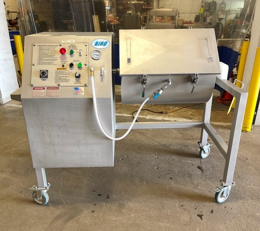 BIRO VTS-100 Vacuum Tumbler. Stainless steel construction, built-in 3/4 hp vacuum pump, 100 Lbs. drum capacity, 12″ x 24″ drum opening, 22″ discharge height in 6 O’clock position, 3/4 hp DC variable speed drive, 0-50 minute Interval mode timer, 5″ casters. 110V/1PH/60HZ.