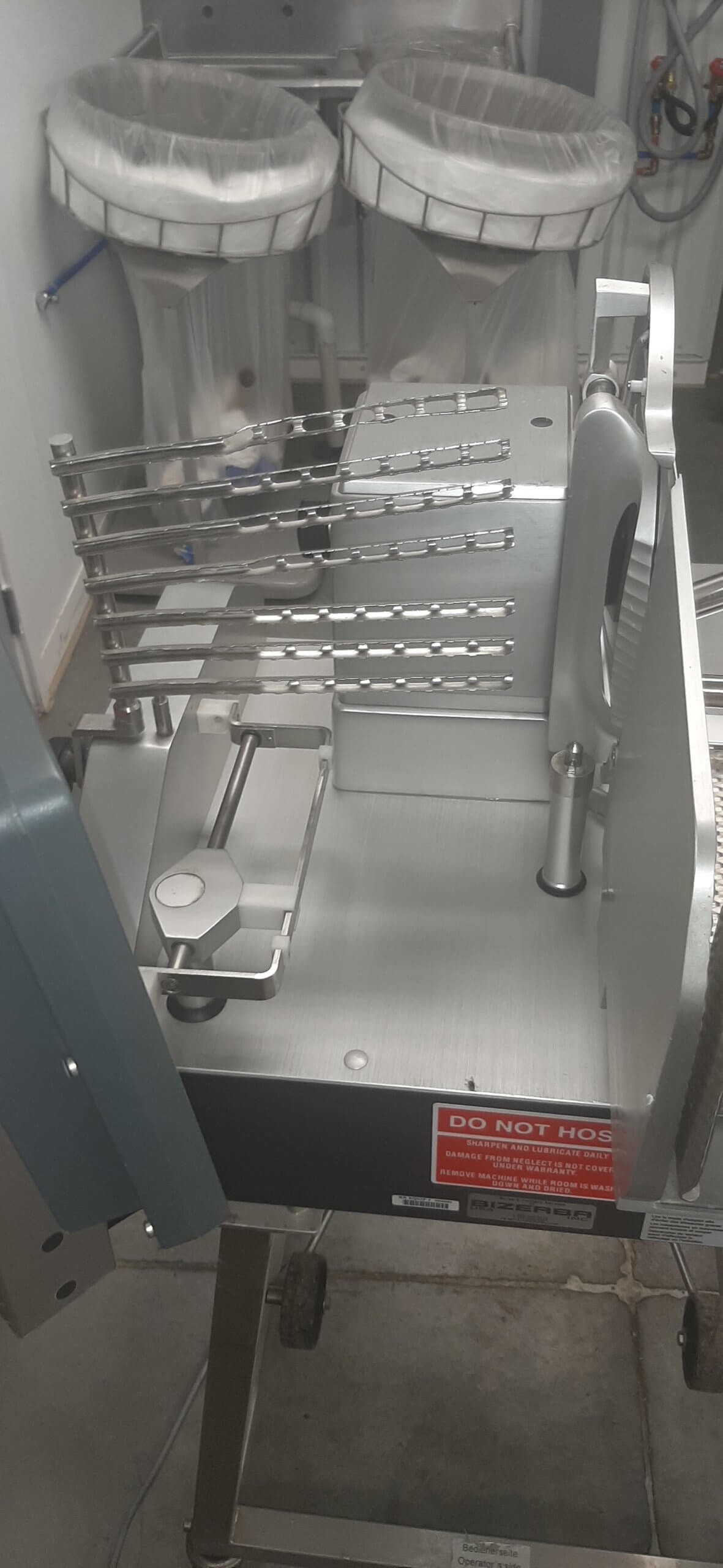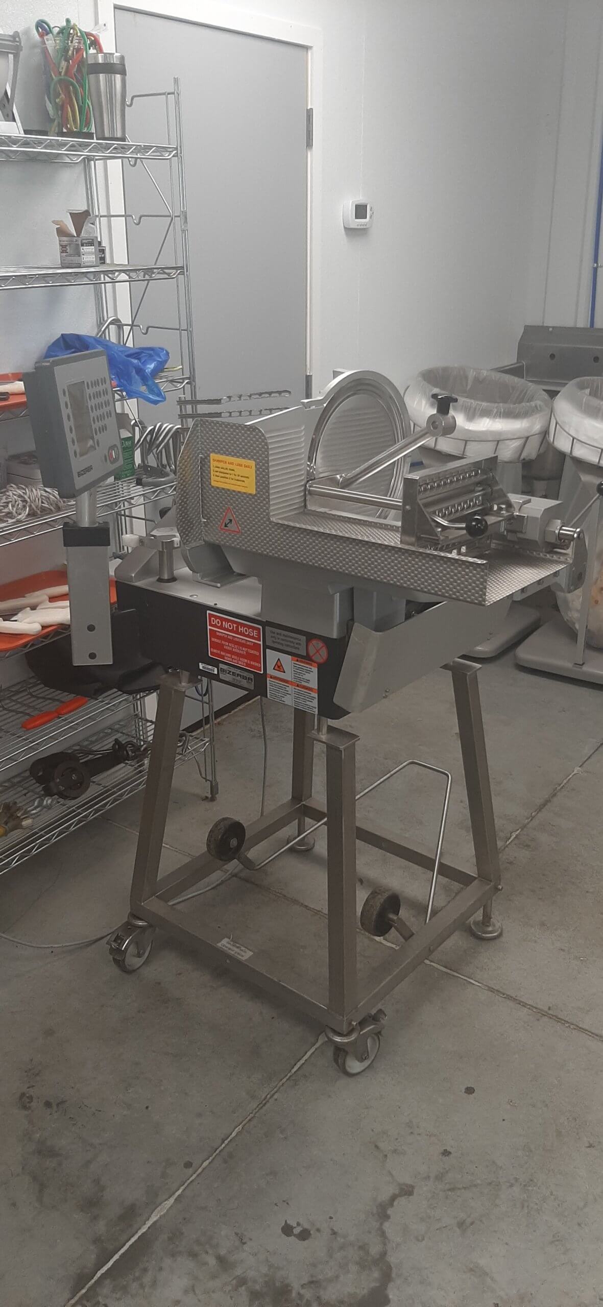 TREIF Zebra CE Slicer. Setup for 1/8″ slice thickness, minimum product temp. 2...