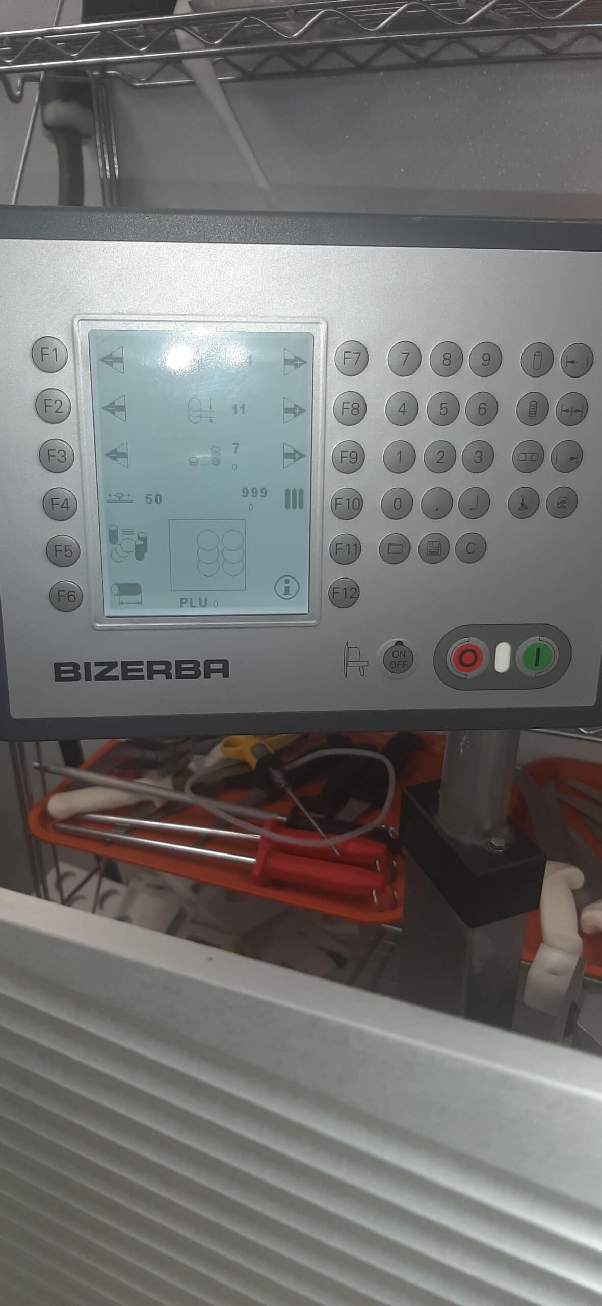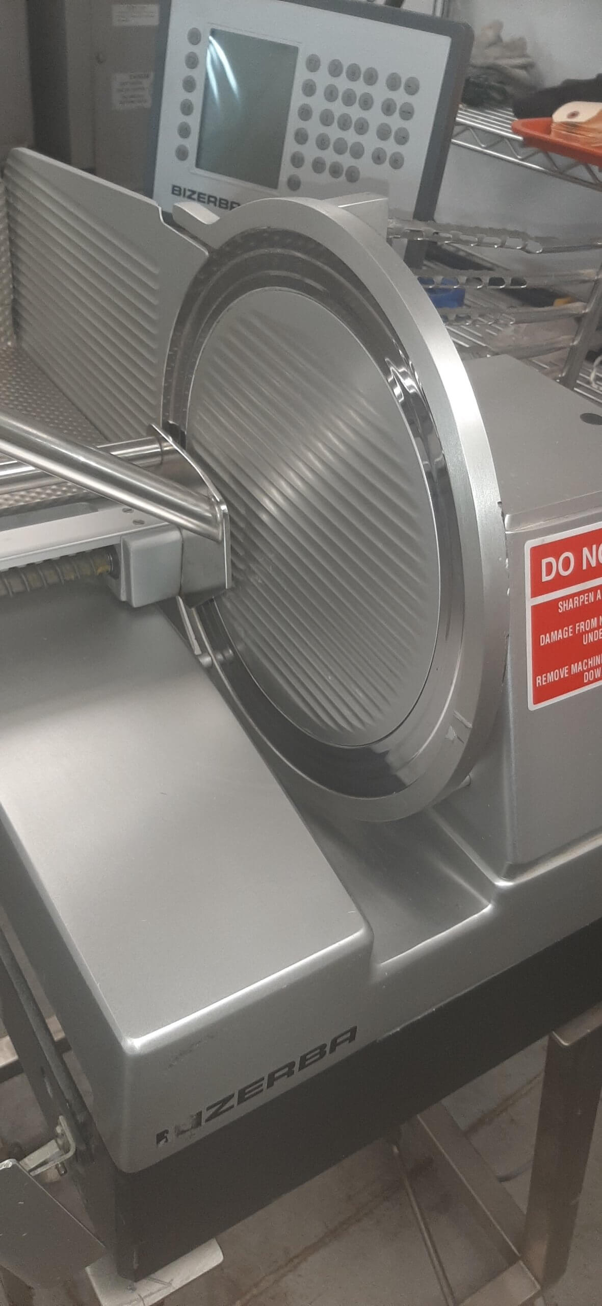 Bizerba Automatic gravity slicer. Anodized aluminum housing. 13″ diameter slic...