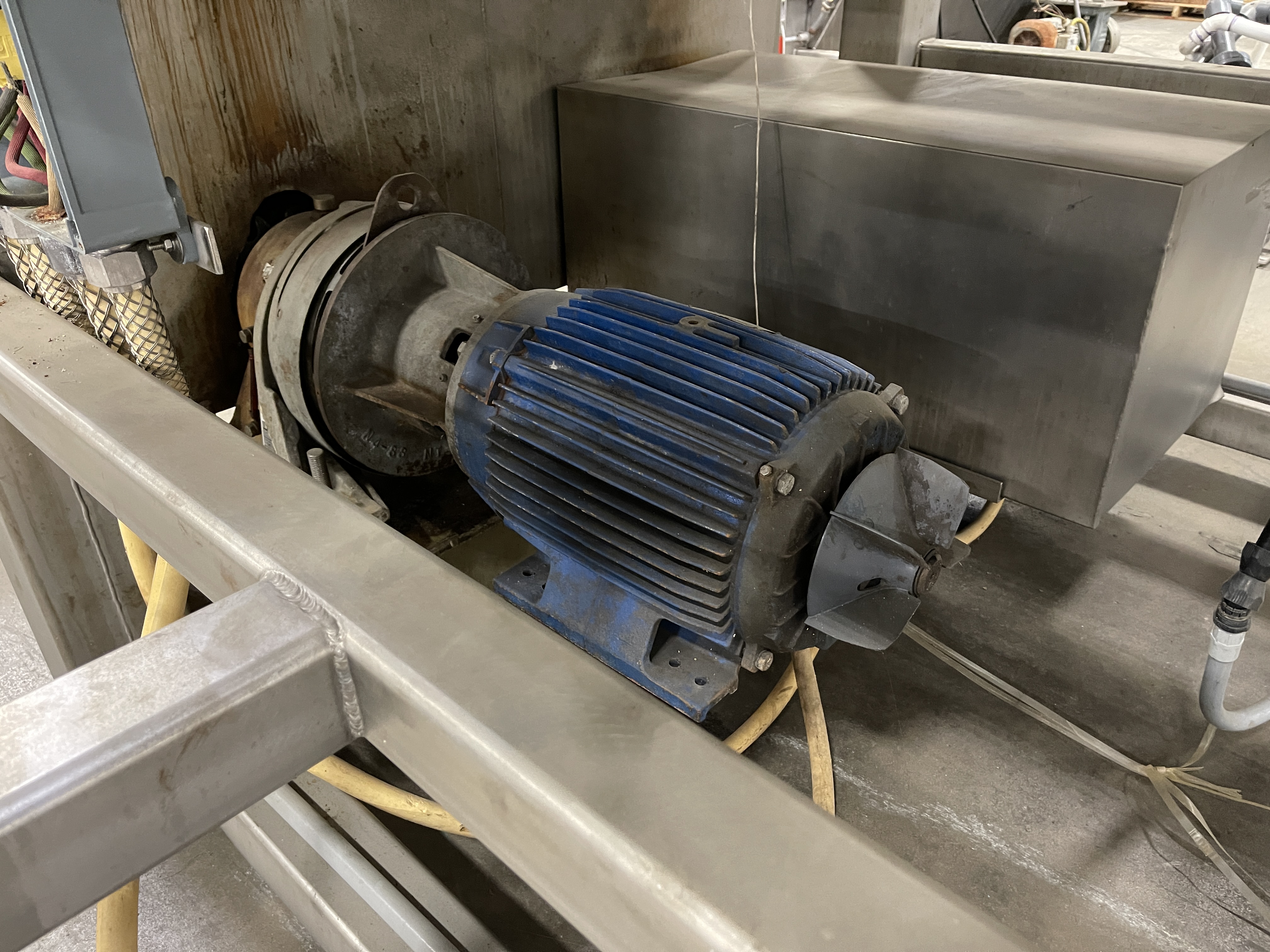 Blentech DM 34080 Paddle Blender. Twin Shaft Ribbon Mixer. Stainless steel construction, dual trough paddle mix action. Hopper dimensions: 72″ in Length; 69″ in Width; 45″ in Depth. Equipped with (8) CO2 injection ports, dual pneumatic discharge doors, Mounted on (4) leg base frame. (2) 20 Hp motors, 440V/3PH/60HZ.