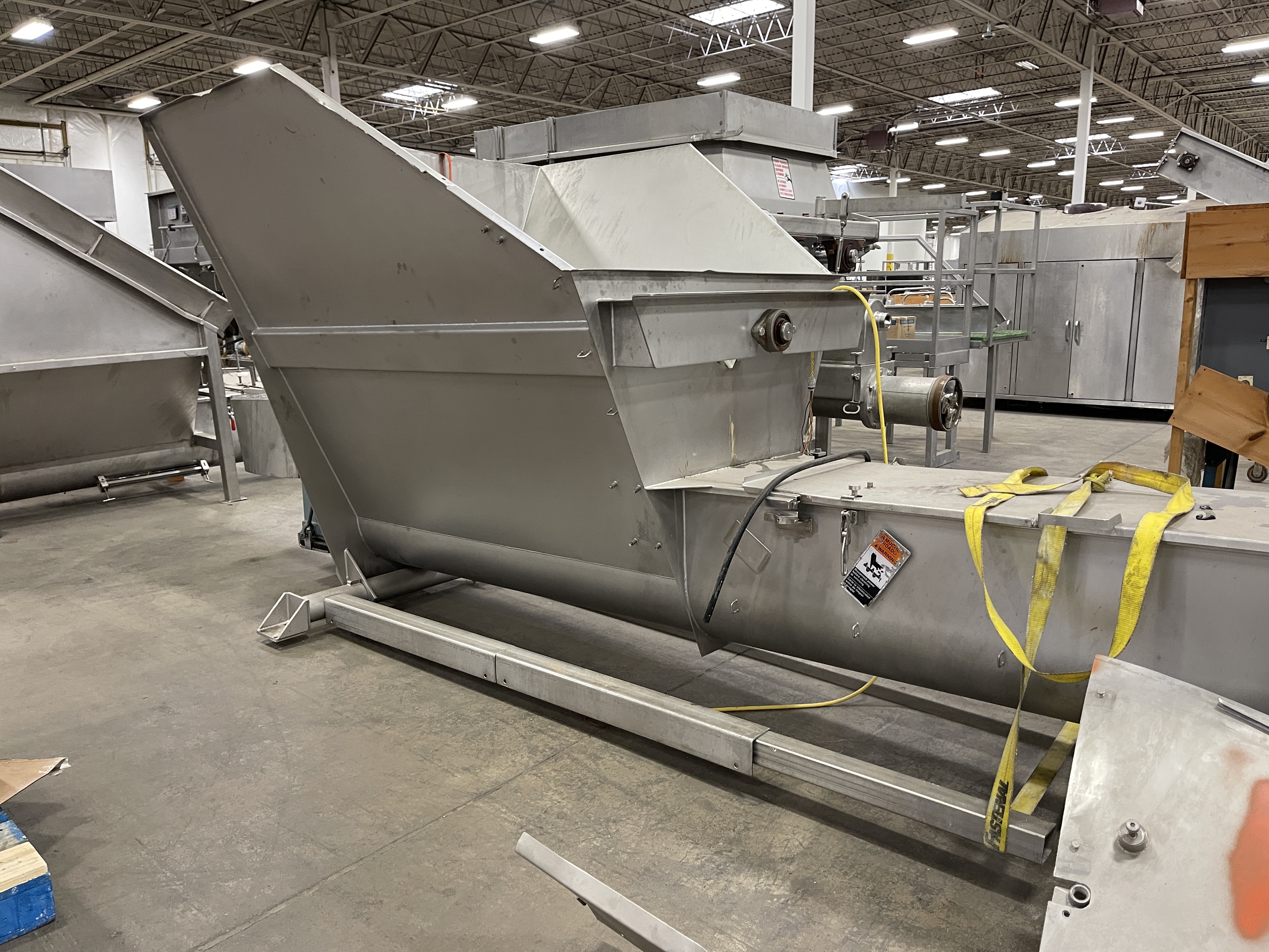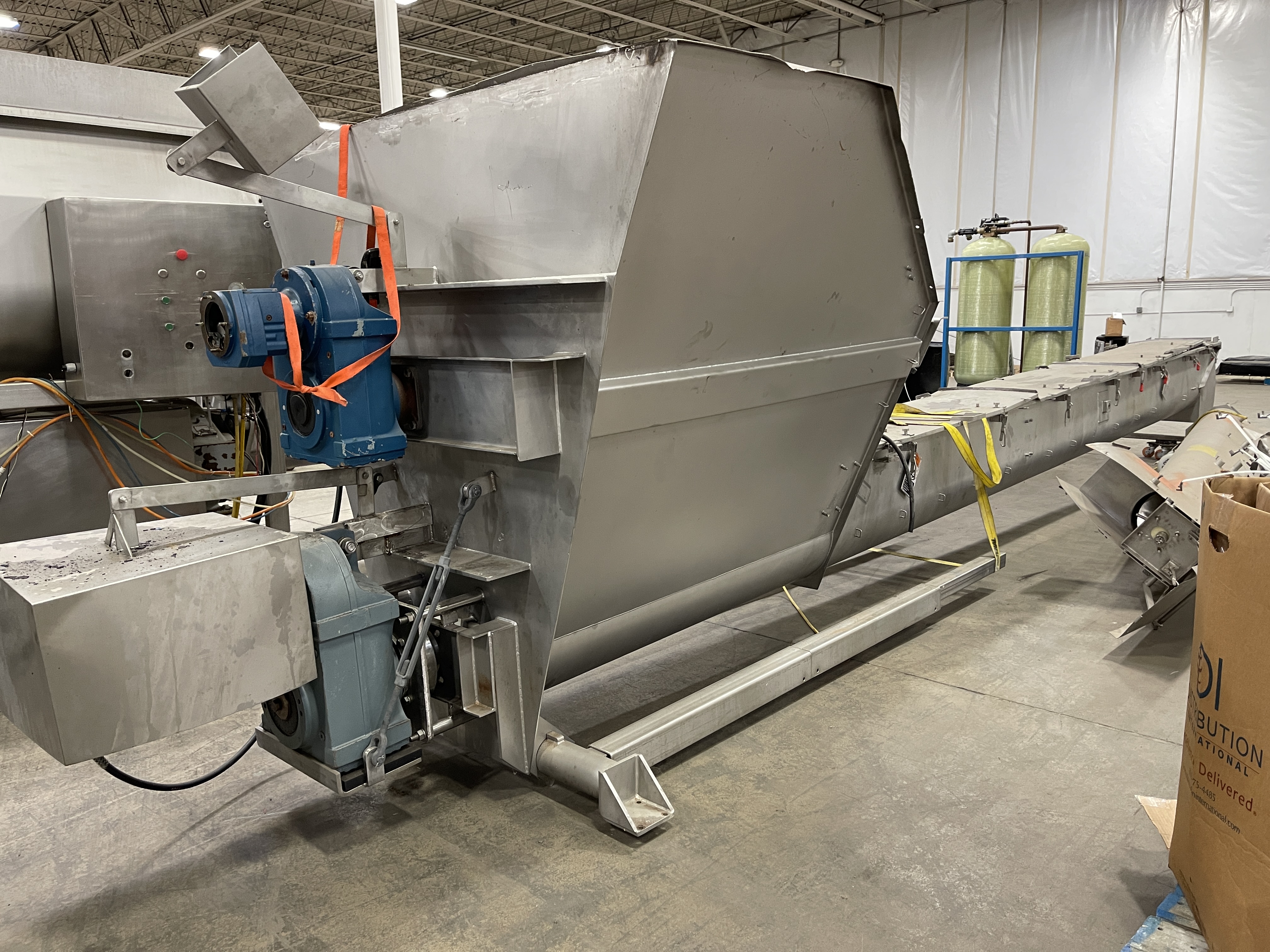 Blentech SC2027-L Screw Conveyor. Stainless steel construction. 14″ X 32′ long auger, 71″x 55″ x 75″ Hopper with paddle-type agitation, full safety covers, 440V/3PH/60Hz.