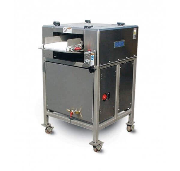 BRIDGE CON-VEY CUBER CC-24 Tenderizer. 24″ wide stainless steel infeed and discharge conveyor belts, Adjustable depth control on knives, Scores top and bottom of formed patties and whole muscle products, Stainless steel construction, 3.75″ Diameter tenderizing blades with 1.5″ diameter shaft, Drip tray for product loss reclamation, Interlock safety switches, Single speed 3/4 hp drive motor. New.
