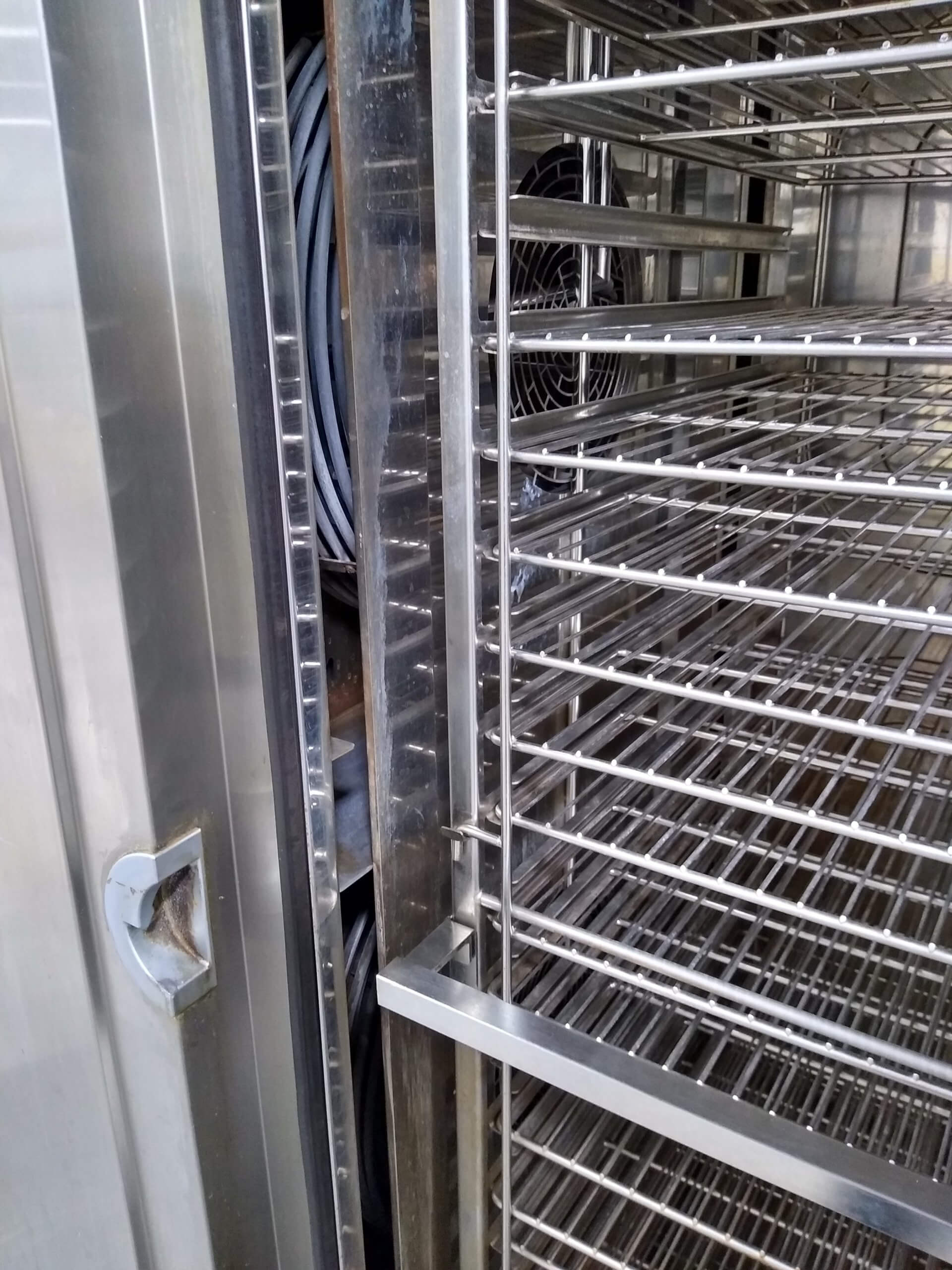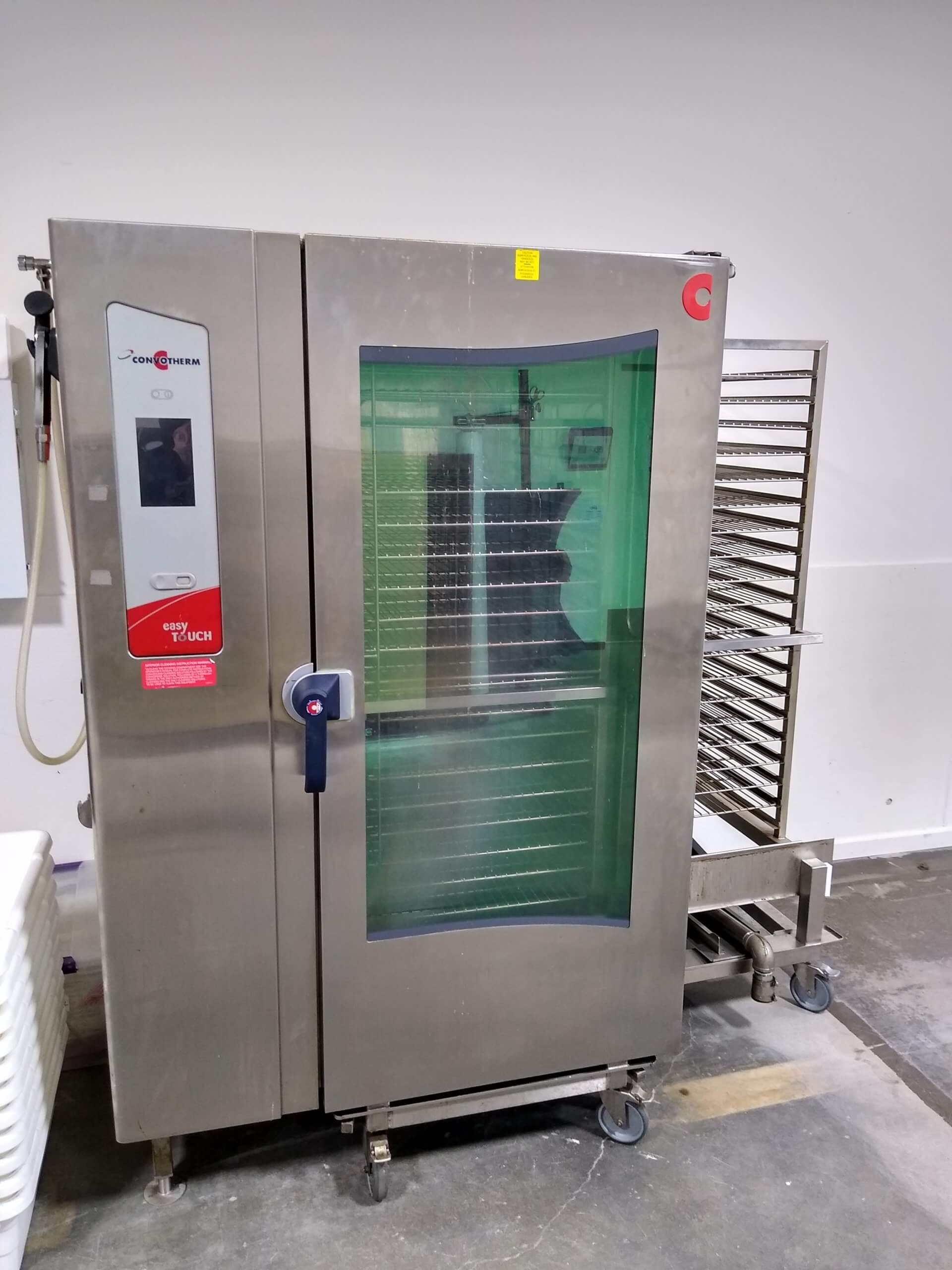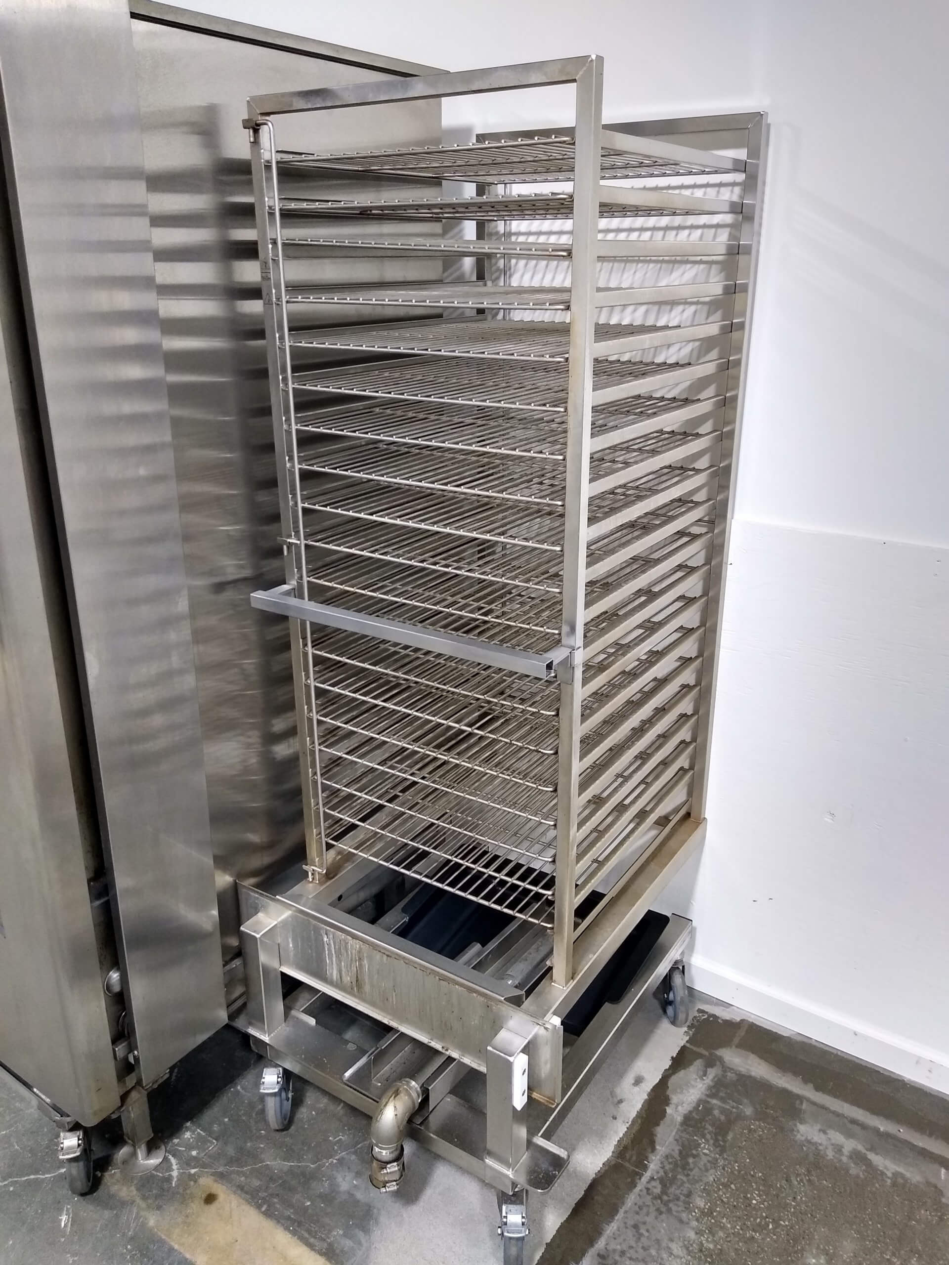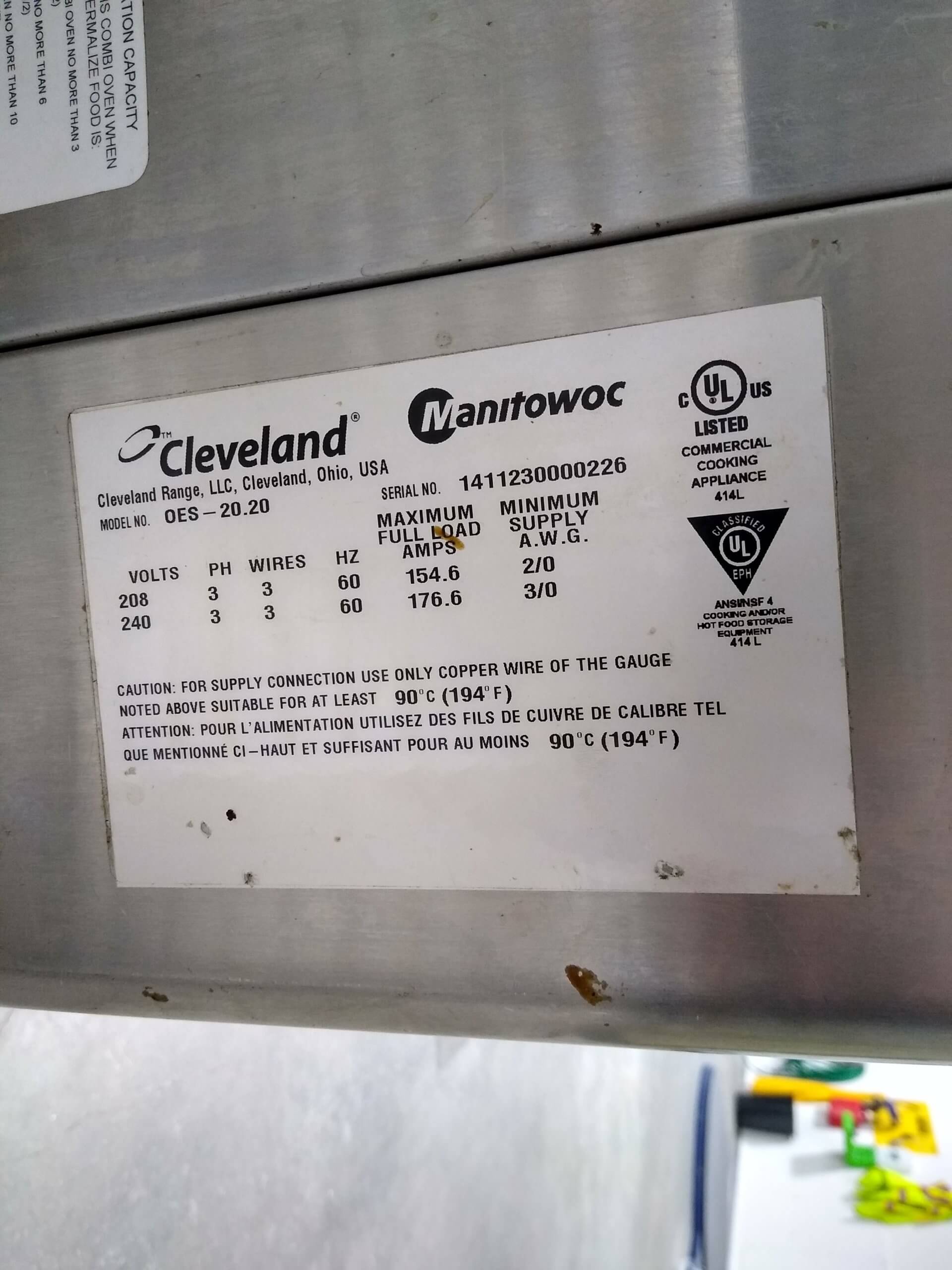 Cleveland OES 20.20 Convotherm Combi Oven-Steamer. Includes (2) Correctional Roll-in Alto-Shaam Oven Racks with Ten (20) 26″ x 20″ wire shelves, Two (2) speed auto-reversing convection fan for even heat distribution. 240V/3PH/60Hz, 176 Amps.