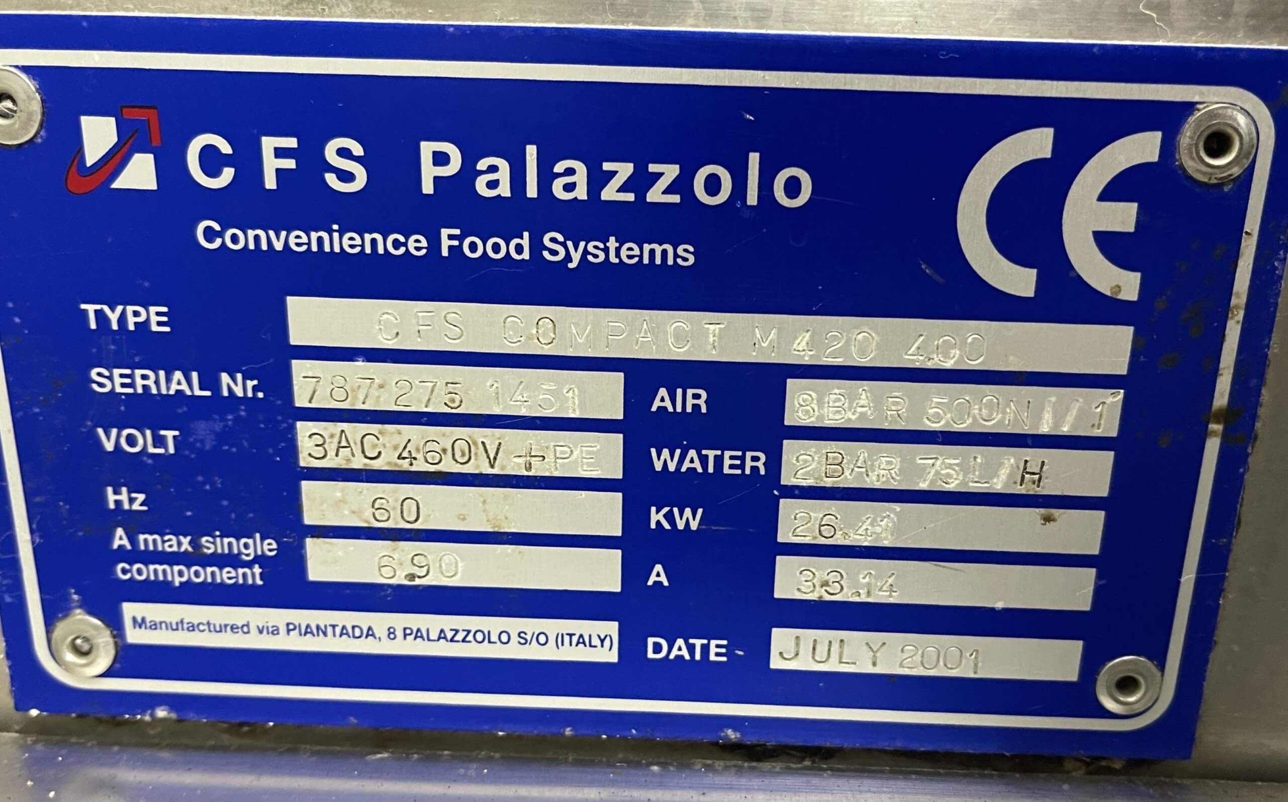 420mm web width x 400 mm advance. Includes 2 sets of inserts to produce 2 and 4 up packages. Equipped with Film rewind system, cut knife system, vacuum pump and trim canister. Requires compressed air and water supply. 460V/3PH/60HZ. 33.14 Amps.