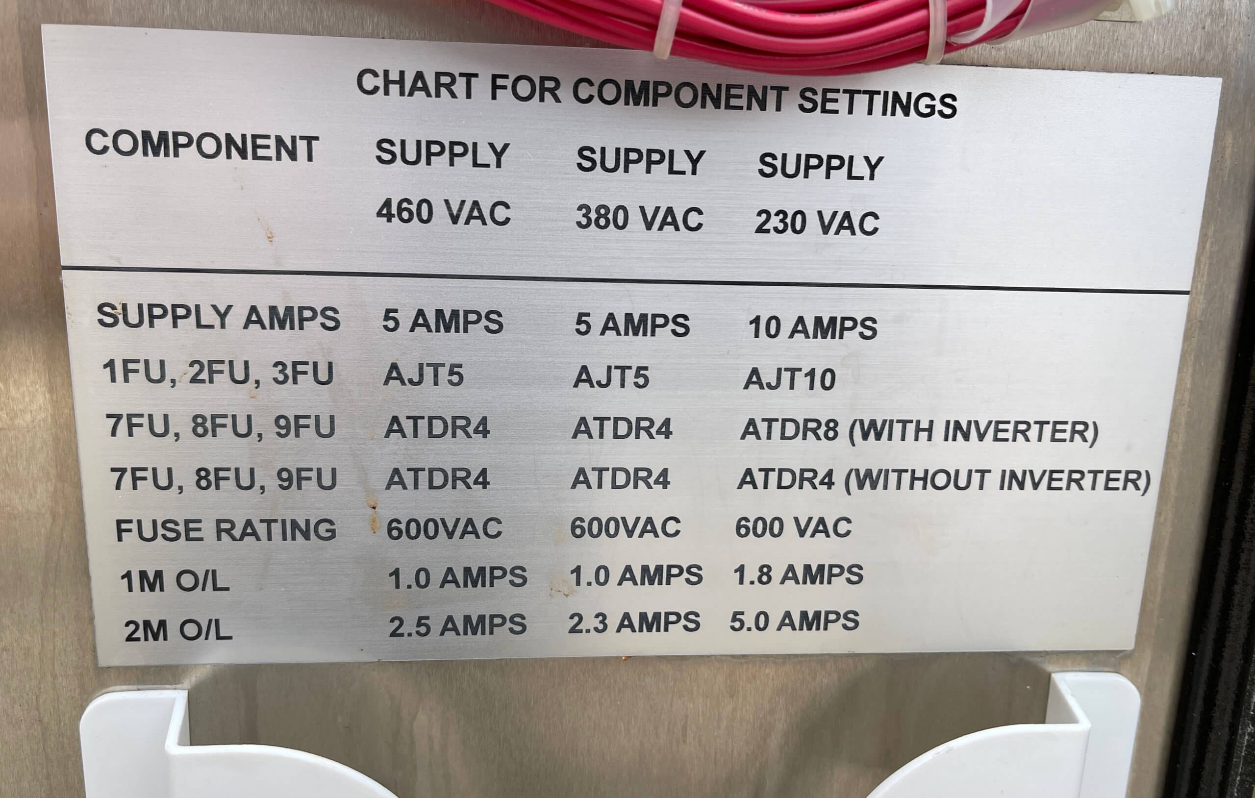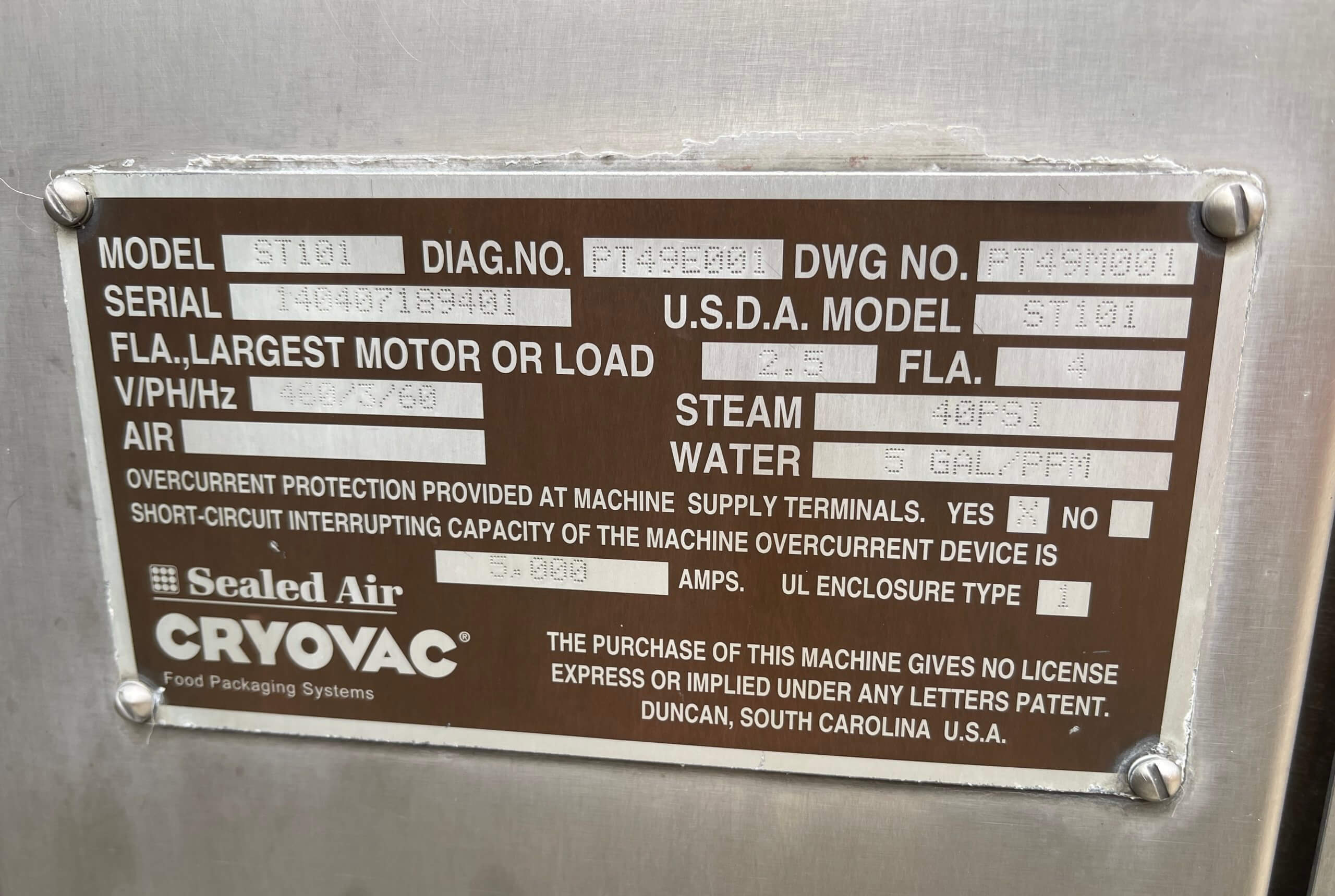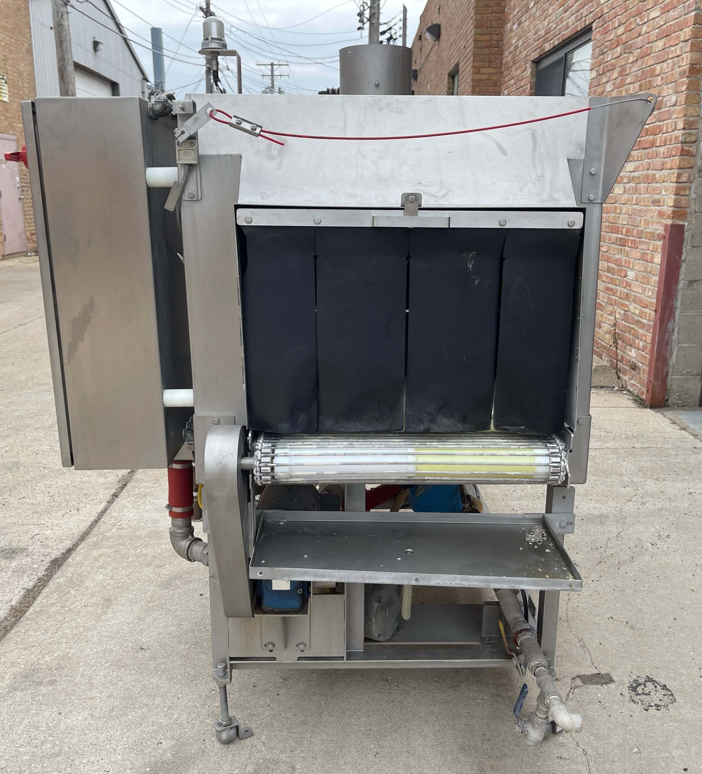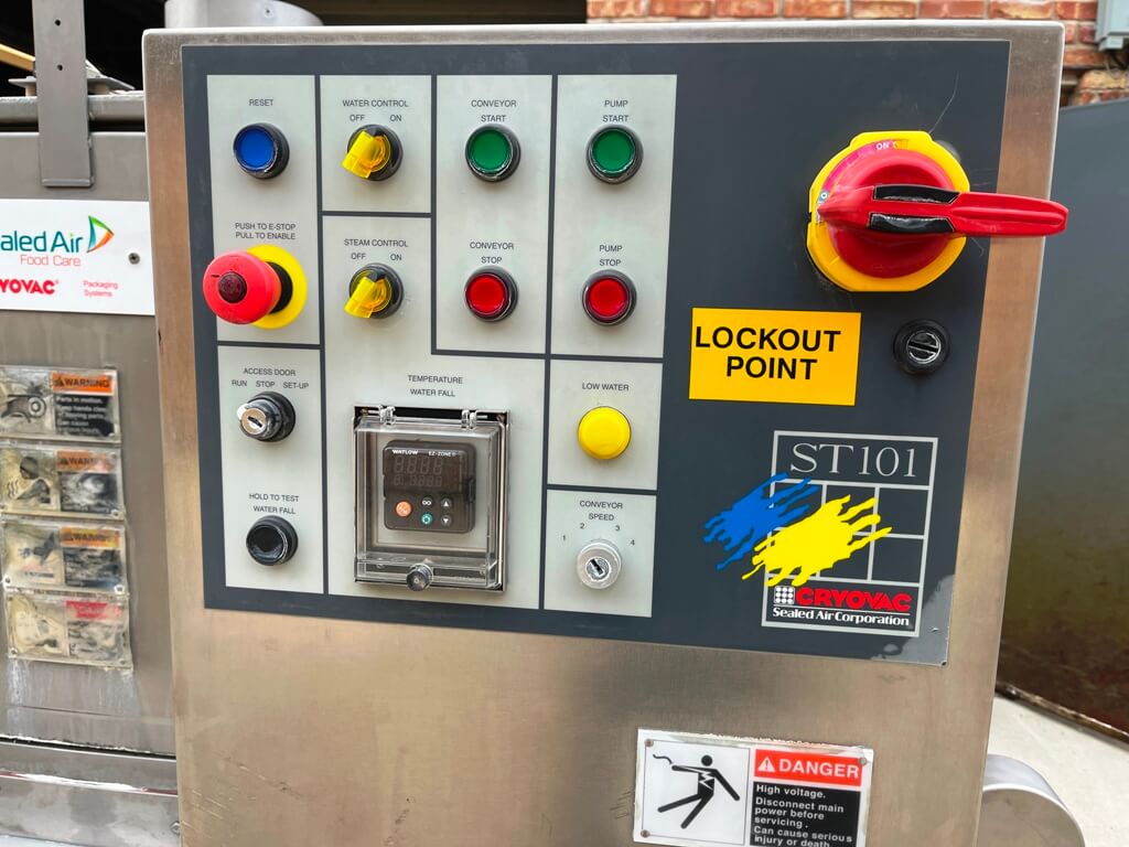 Cryovac Hot Water Shrink Tunnel. Accomplishes optimum shrink at water temperature 185-200 F. 24″ wide stainless-steel Flex grid conveyor belt. Operates at 54’/minute. Watlow digital controller. ¼ hp drive motor. Bottom water spray utilizing a 2 hp Leeson Washguard motor water re-circulation pump. 460V/3PH/60HZ, 4 Amps. Requires ½” water line, 5 GAL/PPM, Live steam injection, 40 PSI. 8” diameter exhaust, 200-300 CFM.