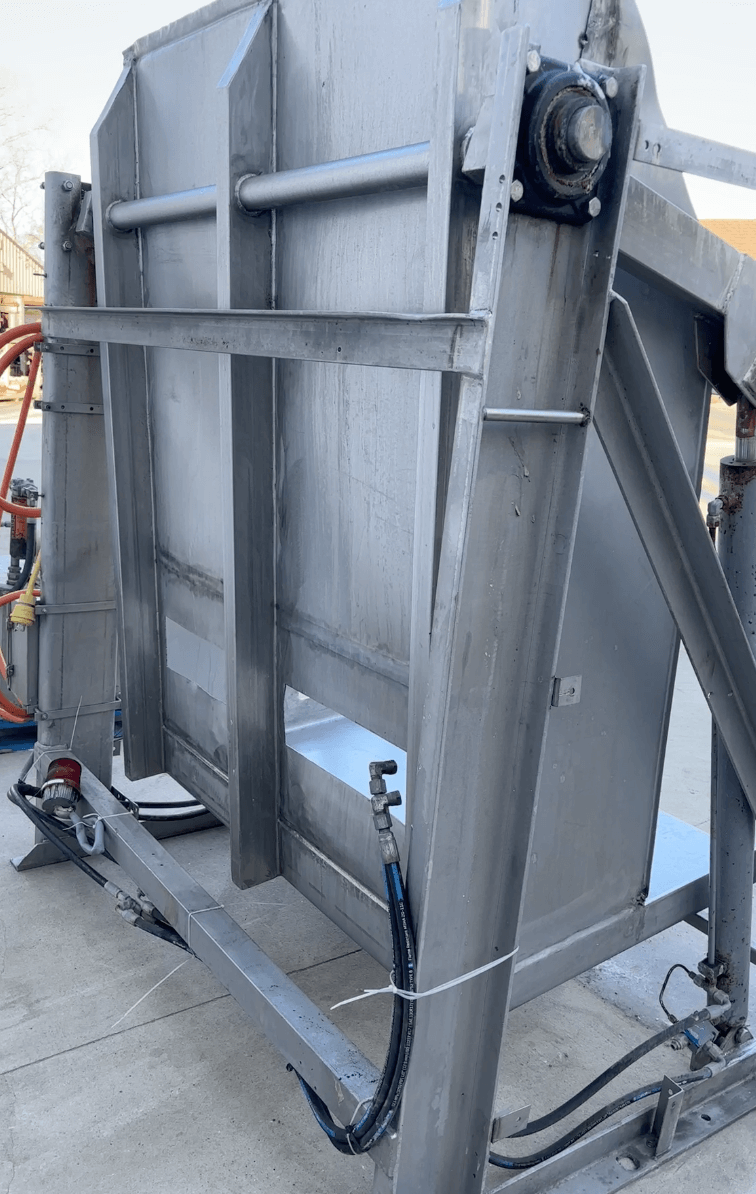 CUSTOM STAINLESS Combo (vat) Dumper. Includes hydraulic power pack, 78″ width including mounted controls, 71″ with controls off, 68″ basket depth, 54″ basket width, includes hold downs, 5PH Baldor motor, 208-230V/460V, 3ph, 60Hz.