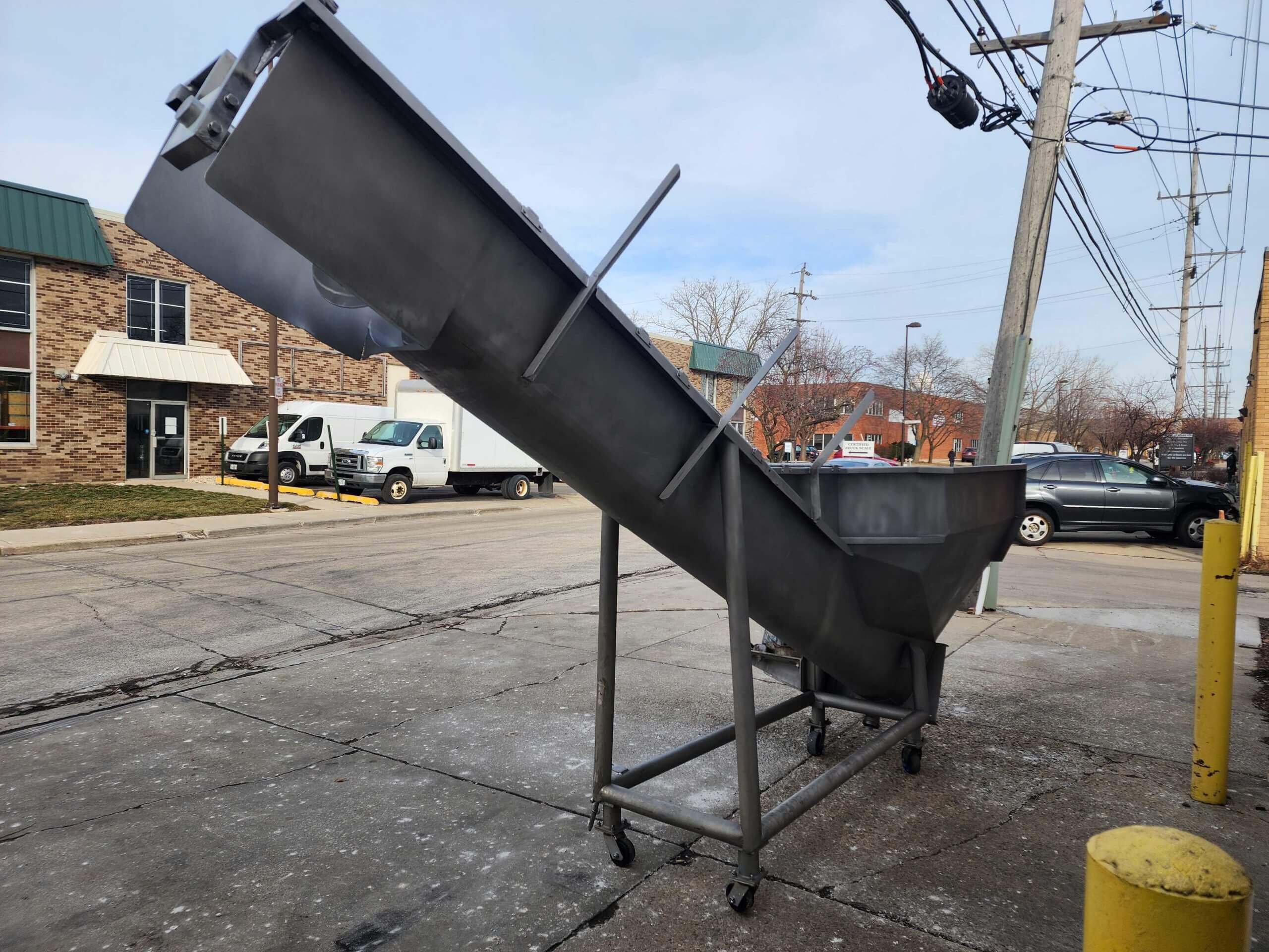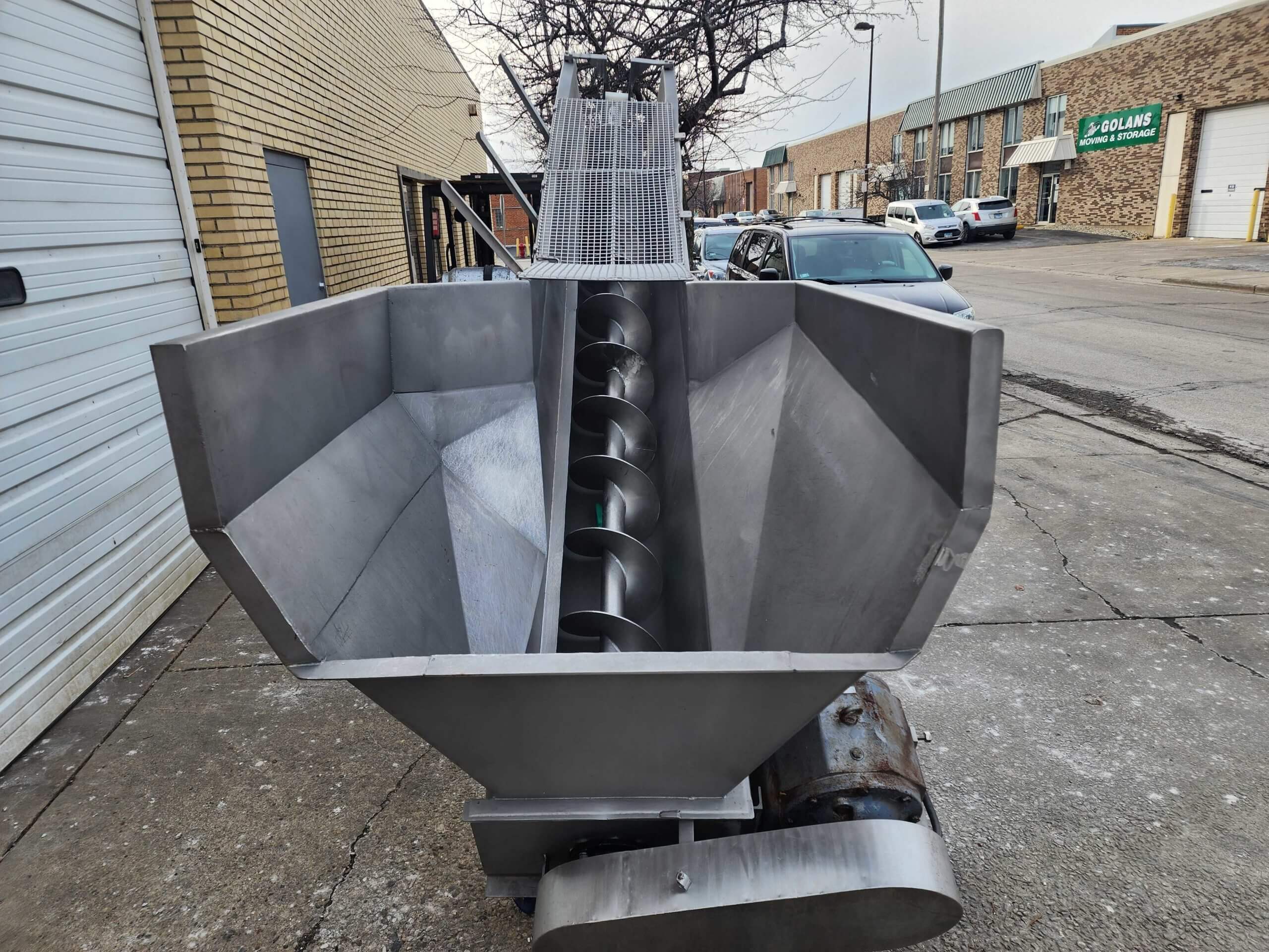 Custom Stainless Screw Conveyor. 11′ long x 14″ diameter auger, 14′ overall length, 42″ infeed, 76″ discharge, 48″ x 53″ x 27″ hopper, 1.5HP motor, 230V/460V/3PH/60HZ.