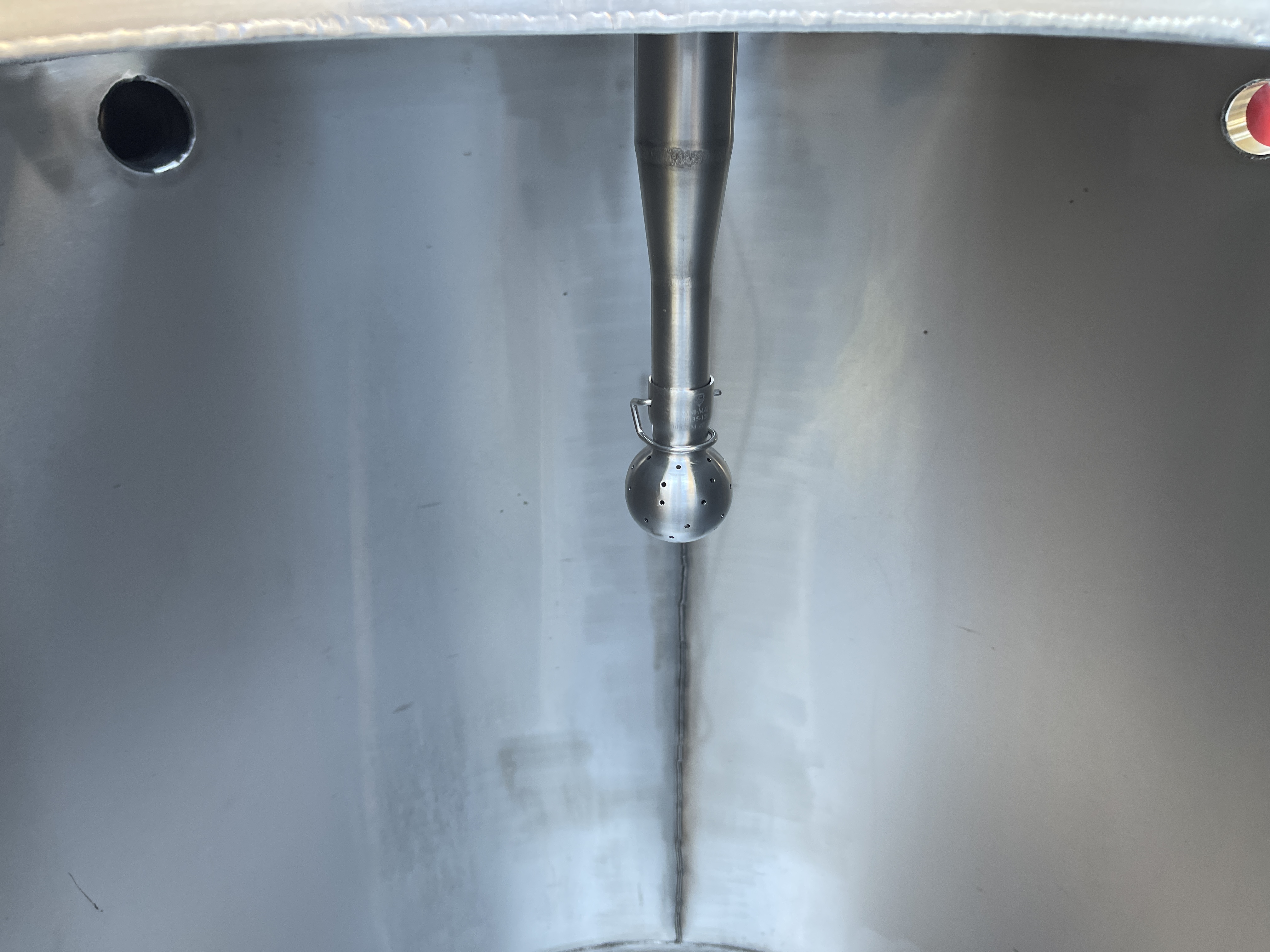 CUSTOM STAINLESS Storage Tank. New 335 Gallon vertical fermentation tank, stainless steel construction, 51″ tall x 44″ diameter. On top is a 18″ diameter hinged access door, (1) each 3″, 2.5″ and (2) 1.25″ tri-clover clamp fittings, (1) 1.25″ center spray nozzle. (1) 3″ x 58″ long overflow pipe. Bottom has (1) 3″ bottom drain outlet, (3) 2″ tri-clover clamp fittings mounted 2″ above tank bottom. Mounted on (4) 17″ tall legs with 6″ diameter pads.