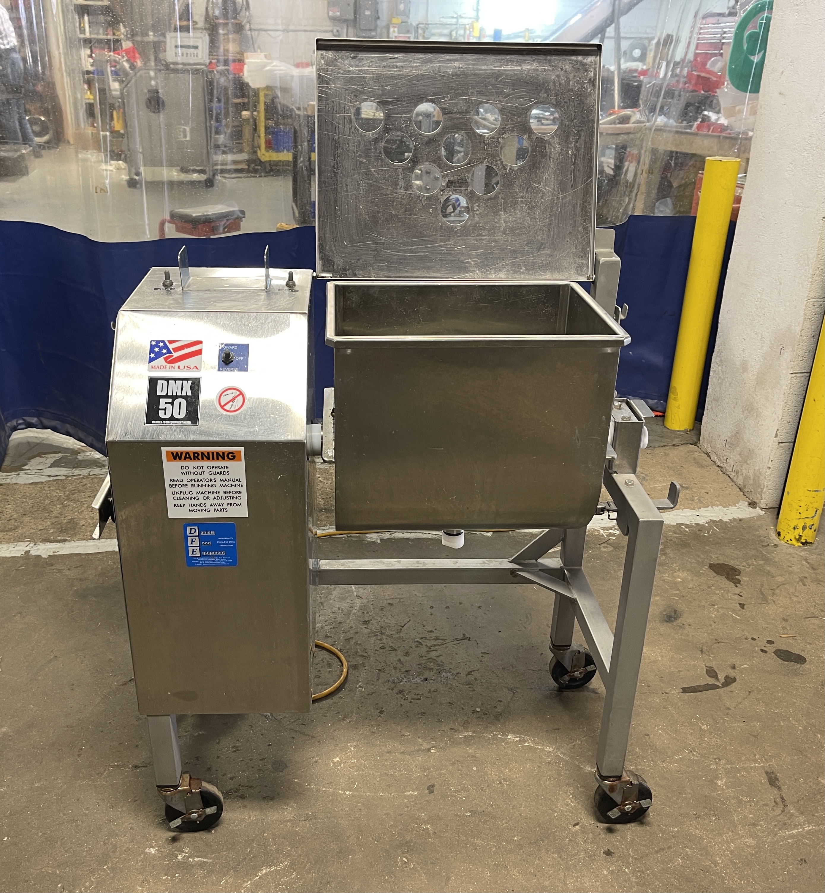 DANIELS DMX 50 Mixer. 50# capacity, forward & reverse paddle mixing, stainless steel construction, four Swivel Locking Casters, removable paddles, safety lockout under stainless hopper, 115V/1PH/60HZ, 10.1 AMPS, 16-5/8″ dump height.