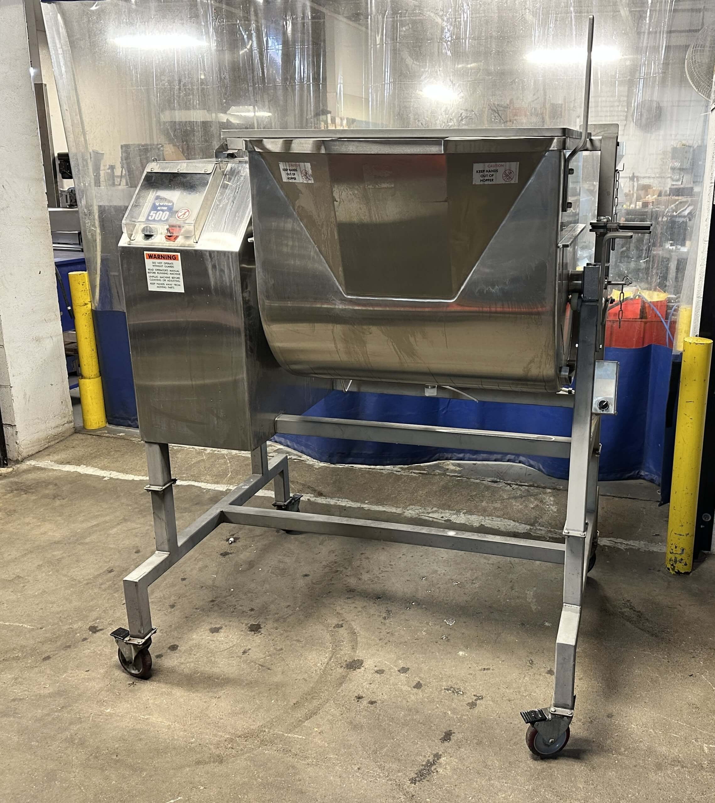 DANIELS DMX 500 Mixer. Forward & reverse mixing, four position dump, stainless steel construction, mounted to a lift kit raising the blender by 14″. Mounted to four swivel locking casters, hopper drain plug, 3hp drive motor, 220V/3PH/60HZ.