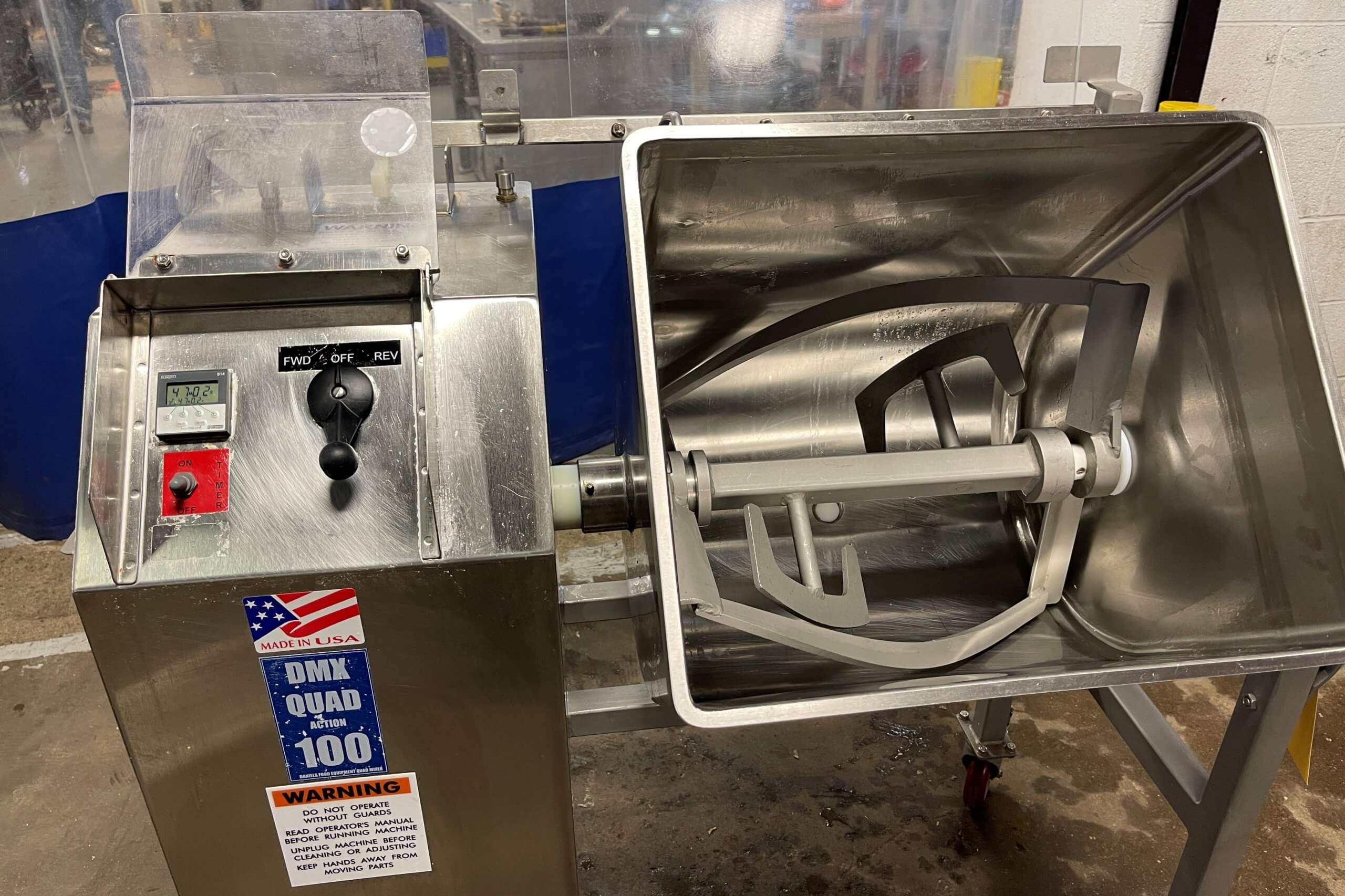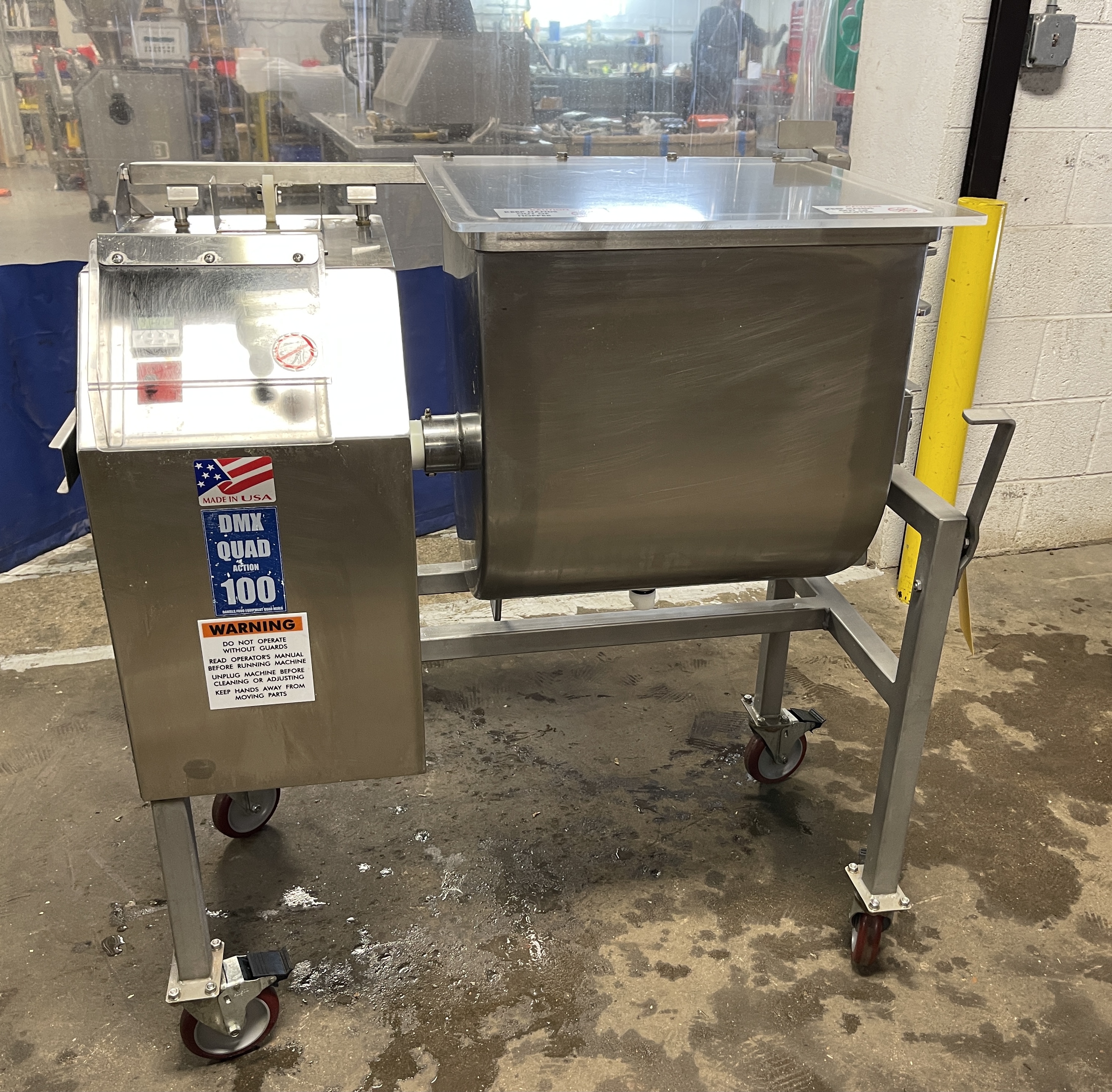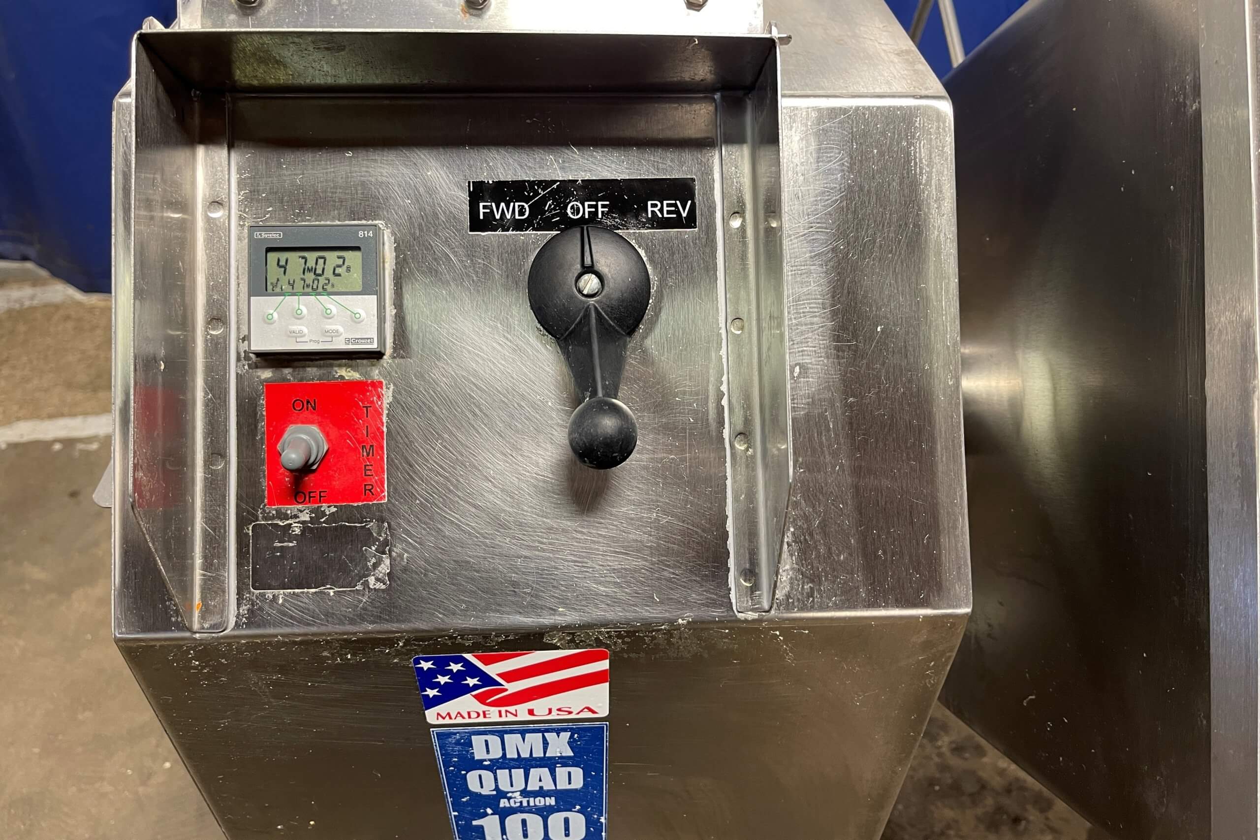 DANIELS DMX QUAD 100 Mixer. Double action mixing with forward & reverse. Four position discharge, stainless steel construction, four swivel locking casters, full cover with safety switch and timer. 110V/1PH/60HZ.