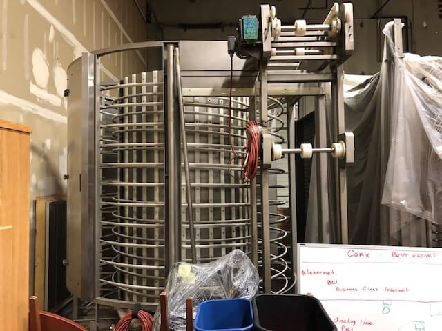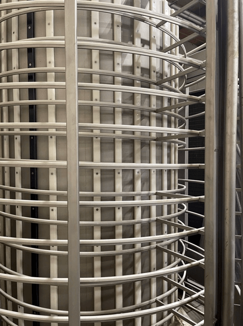 Dantech Arctic Flow EXP-2630-101 Spiral Freezer. 345′ of total 15.7″ wide wire mesh belt, Capacity up to 350 to 500 pounds per hour depending on product size and temperature. Self-contained enclosure 13′ tall X 13′ 7″ wide. Includes control panel, floor, door and insulated walls. Requires a 75 – 100hp 404 Freon compressor (not included). Professionally dismantled with all components numbered and labeled.
