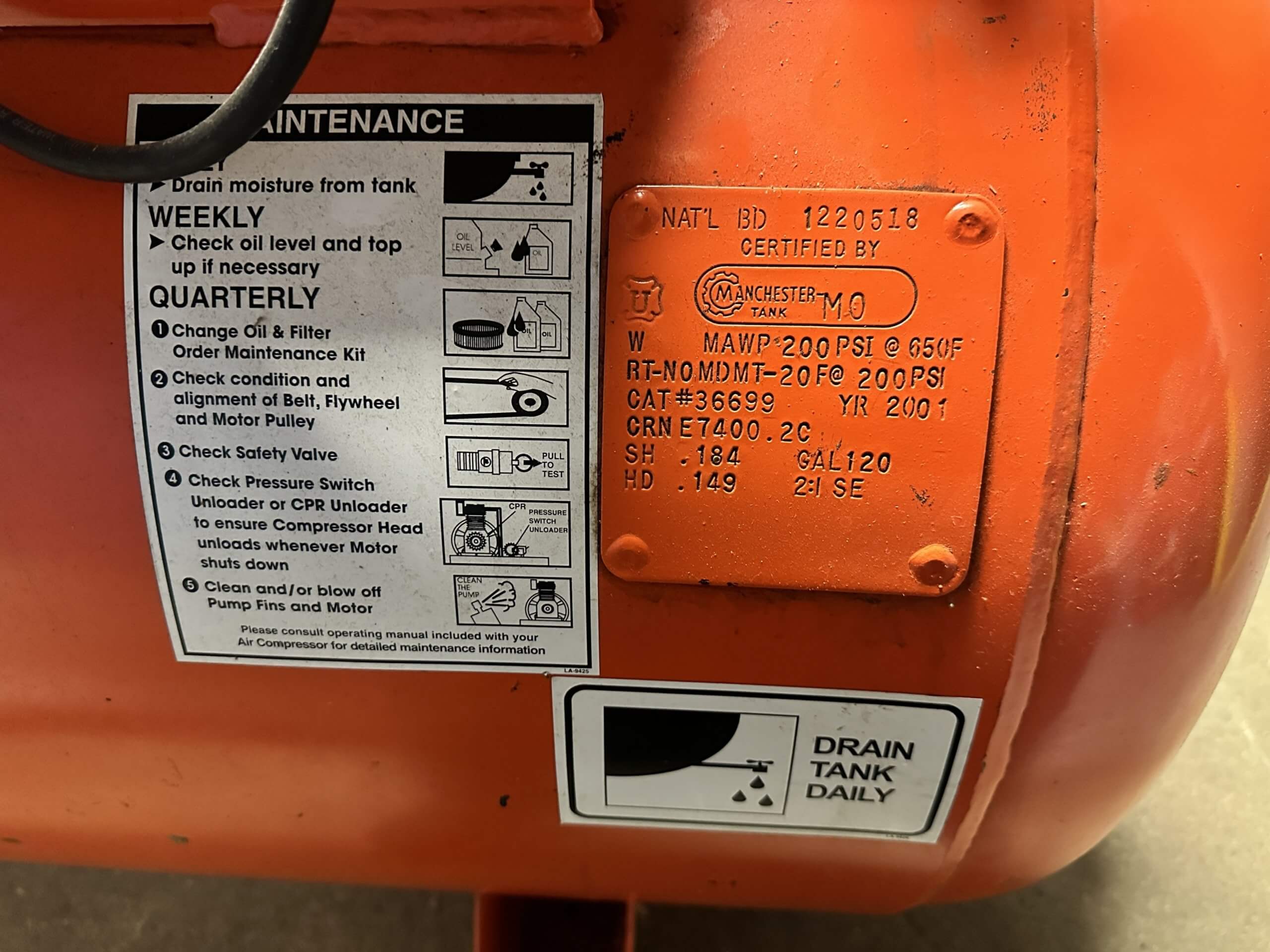 DEVAIR VAT-5063 Horizontal Air Compressor. National Board 1220518, MAWP 200 PSI, 120...