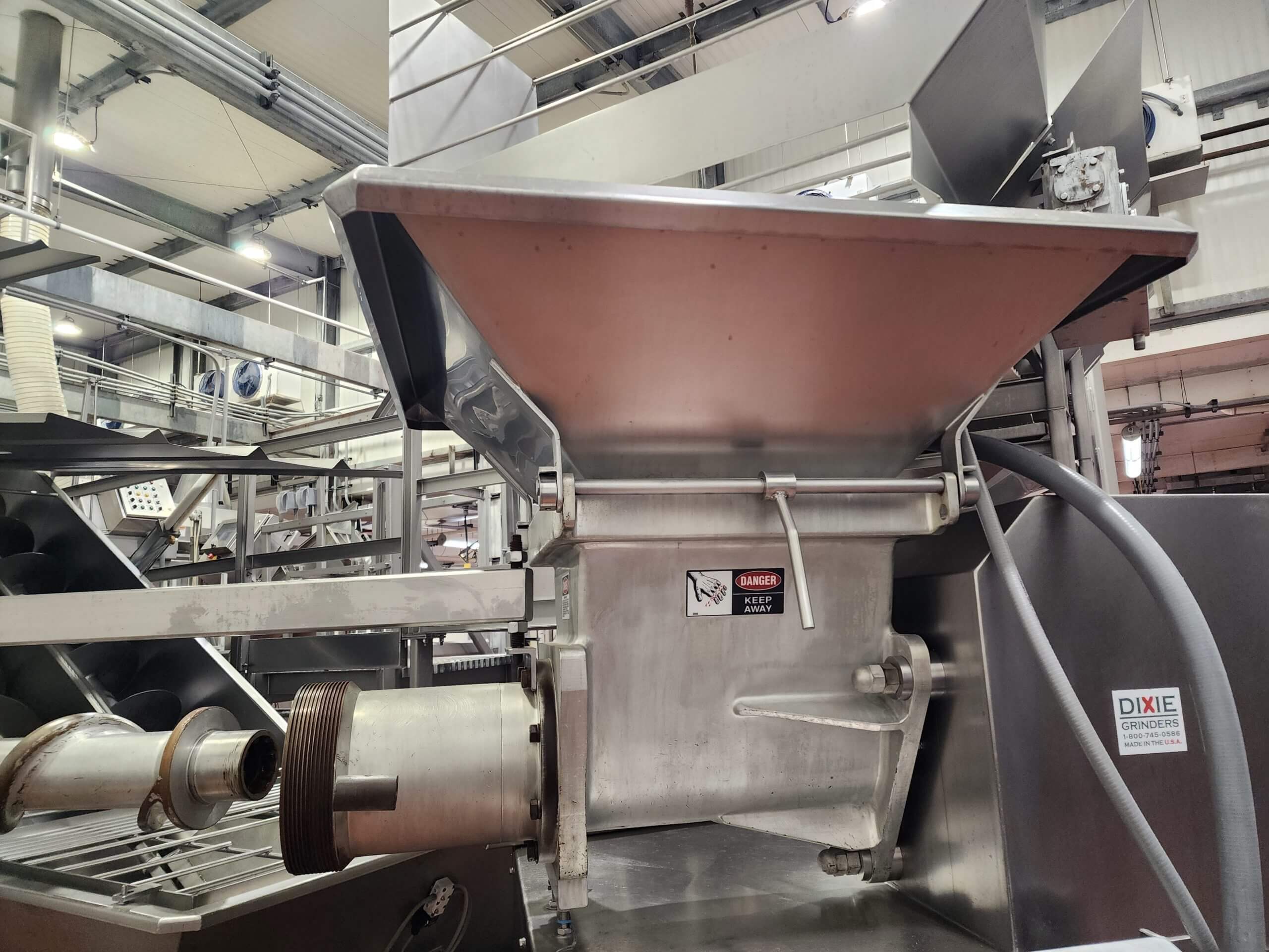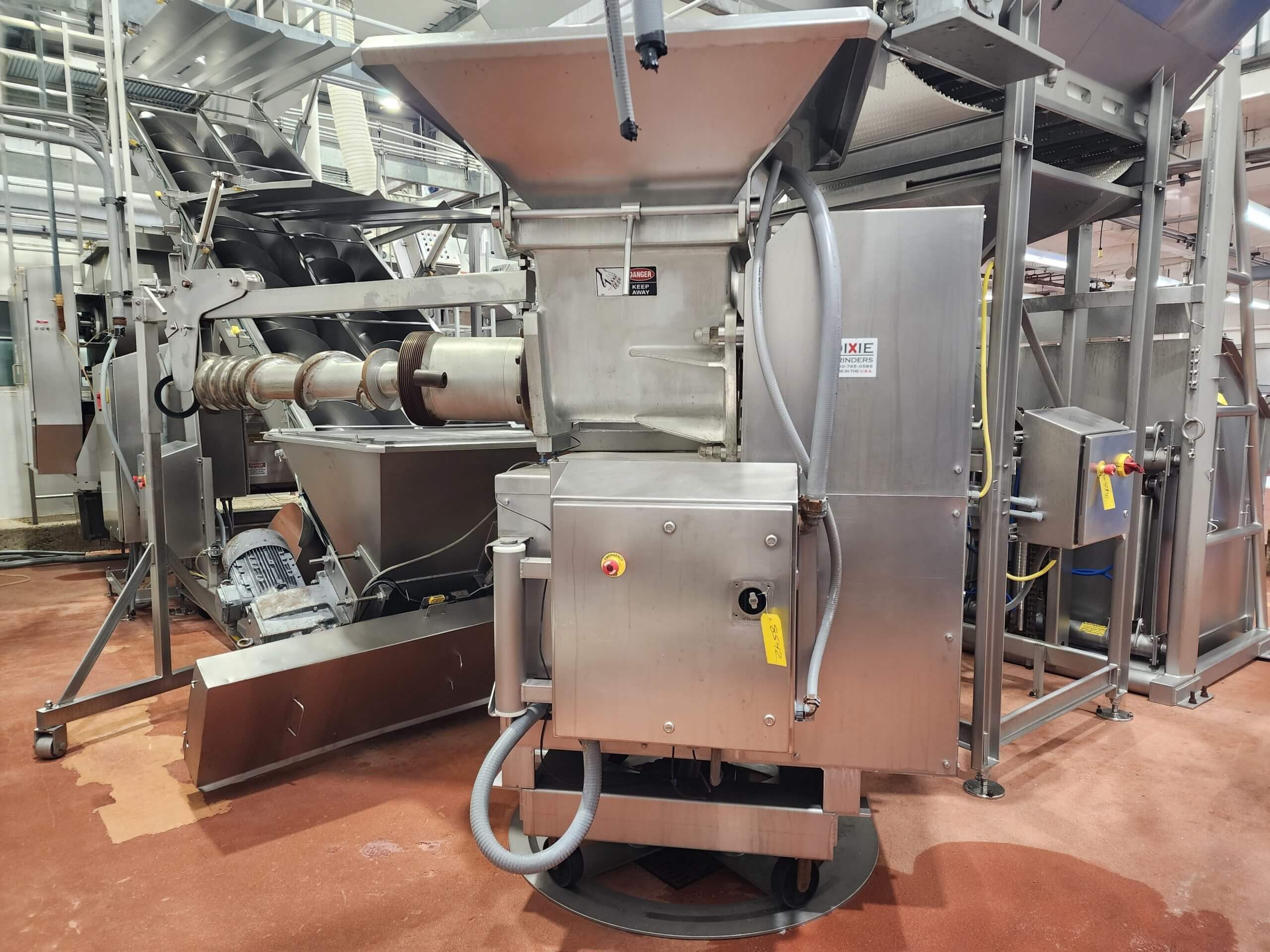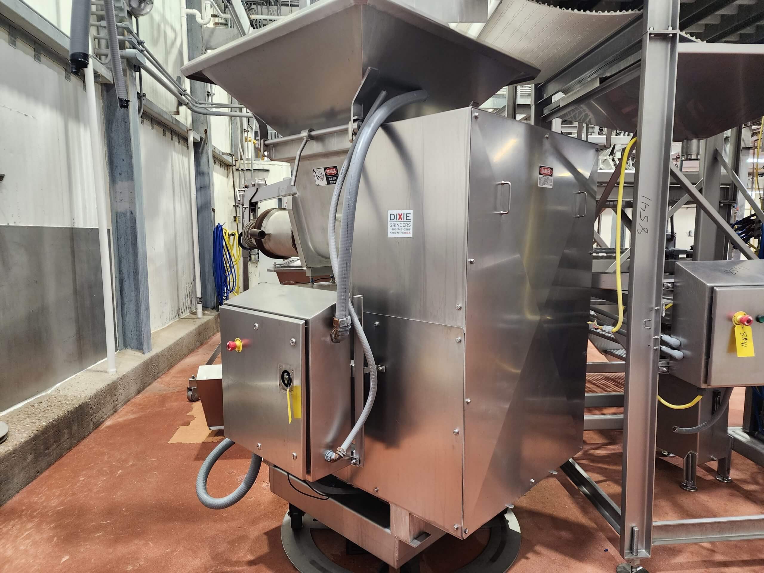 Dixie 11-B Grinder. Grinding capacity 12,000 to 72,000 Lbs./hour. Includes an 11-9B auger, Stainless steel frame, 3 point gearbox flange, Includes Extension hopper and controls. Bottom mount motor. 75 hp TEFC Motor, 460V/3PH/60HZ, 90 Amps.