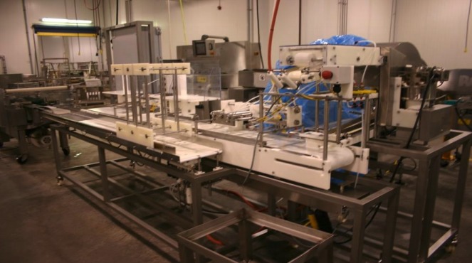 DMP Industries 60690 Pack Table. Automatic sausage loader. Feed sausage or hotdog from your vacuum stuffer through to clip the links and places product neatly into a row for automated package assembly. The tray holding area stacks and de-nests trays which slide forward and load with product for packaging.