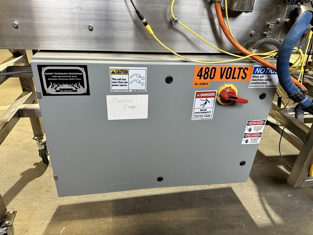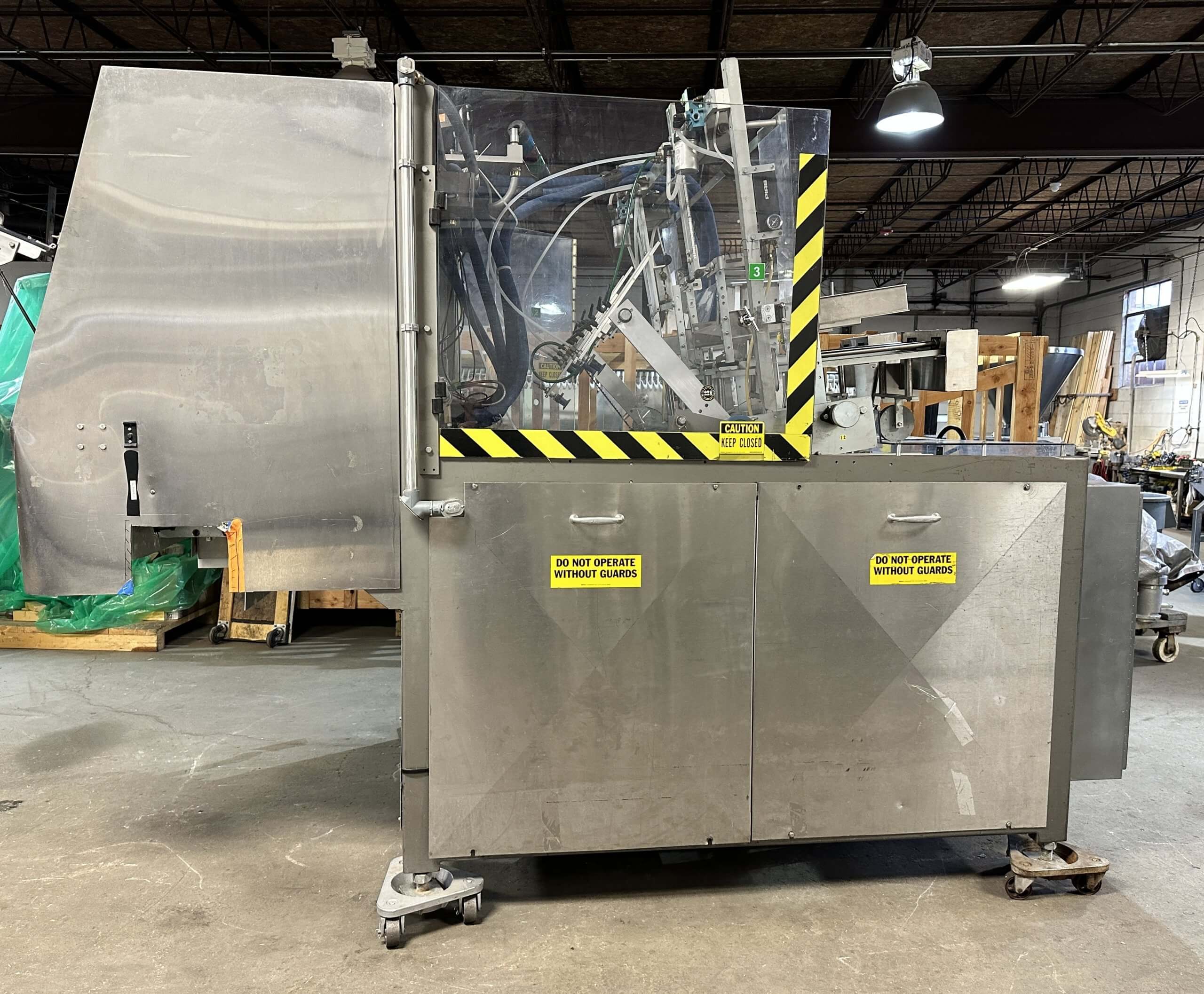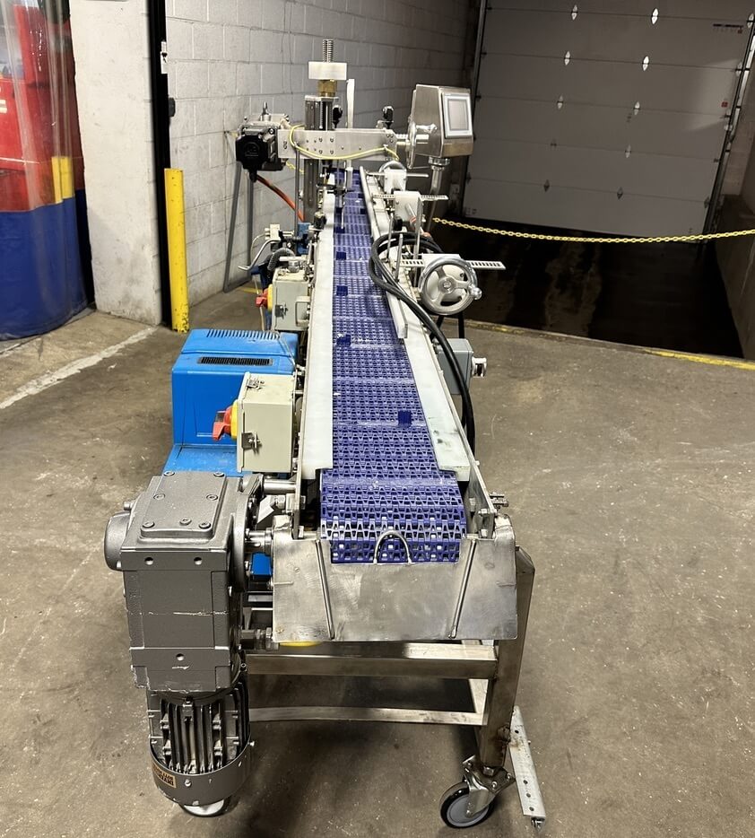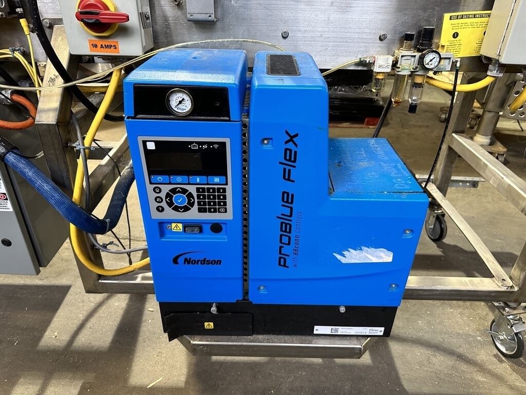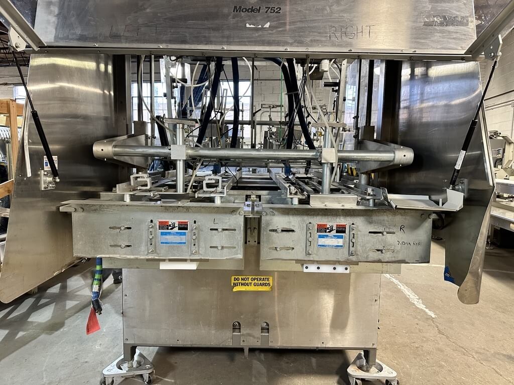 Doboy 752 Dual Head Glue Carton Tray Former. SN’s 96-18484 & 96-18485. Automatic, S/S, dual head, glue, tray former capable of up to 70 cycles per minute (2 trays per cycle). Dual power-feed magazines, 2-cup reciprocating vacuum blank pick & place, adjustable female forming head, Nordson Problue Flex hot melt glue applicator. Controls: LCD display, E-stop, status indicator lights, low blank magazine sensor, production counters and barrier guarding. Includes conveyor carton closer system with a second Nordson Problue hot glue applicator with controls. 480/230V/3PH/60HZ.