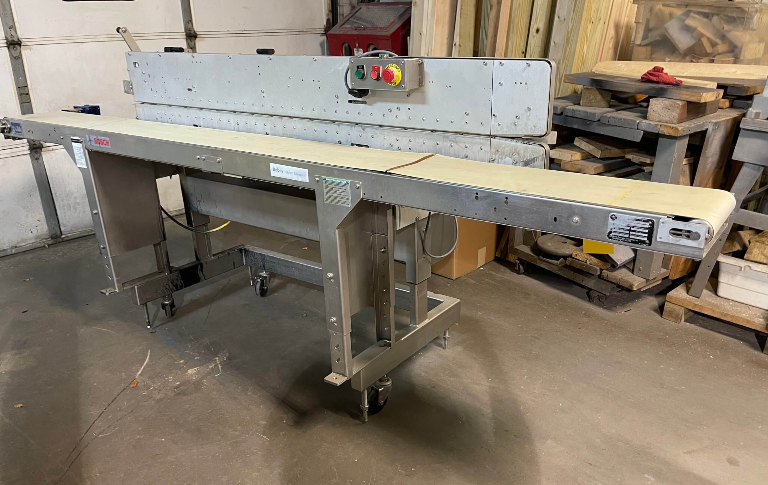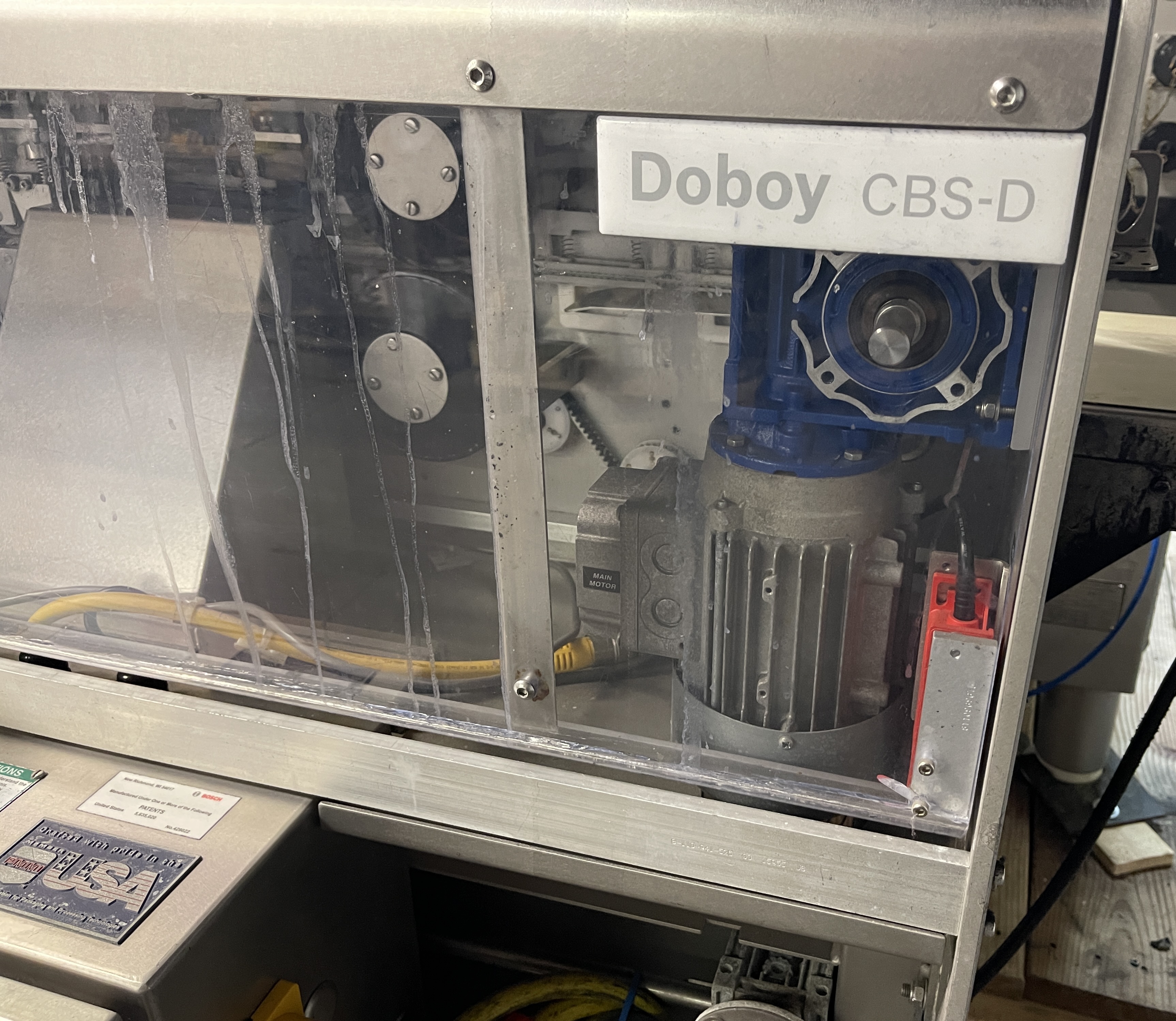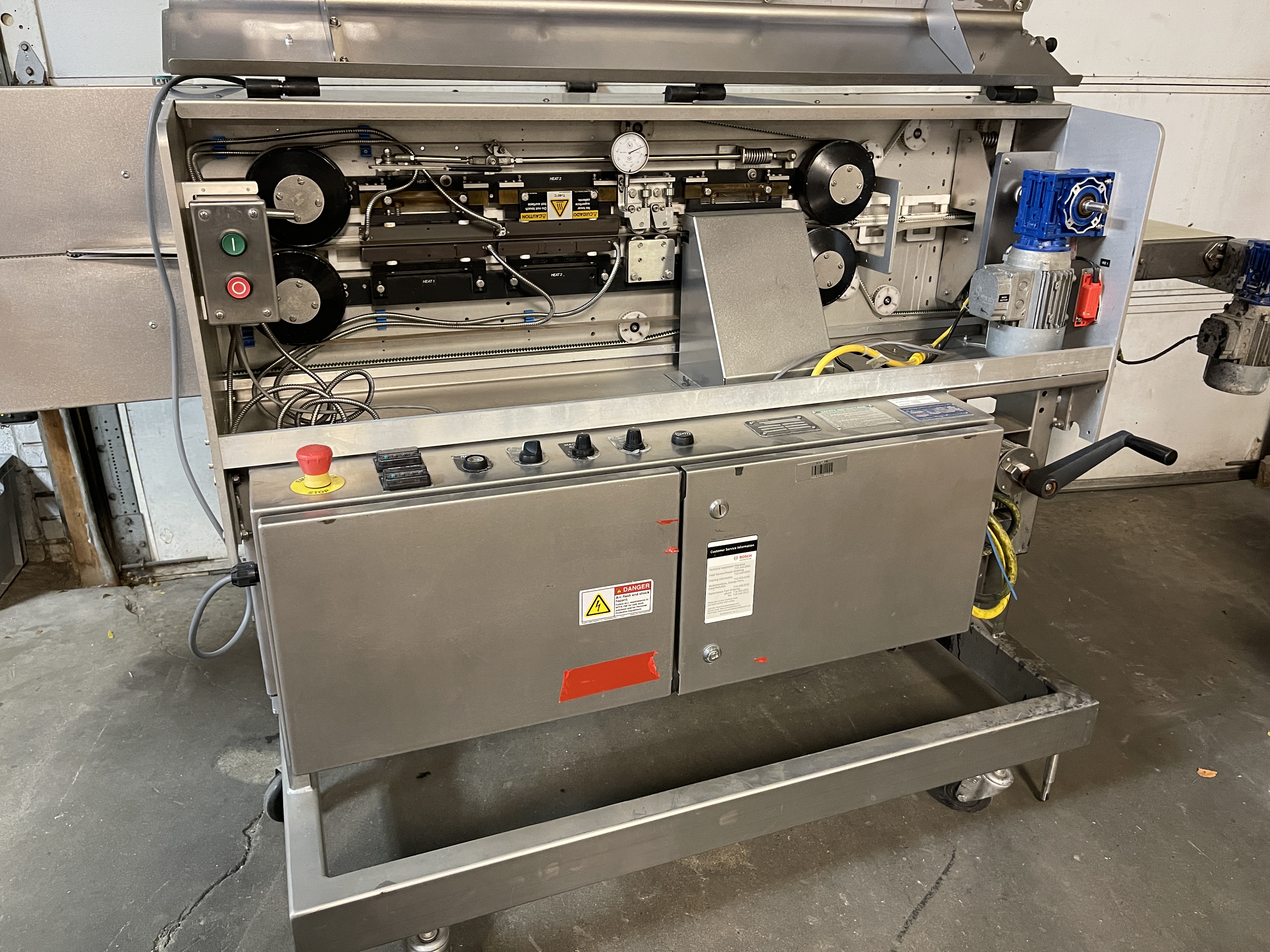 DOBOY CBS-D Band Sealer. Two pairs of 7.5˝ long heat bars produce a 1/4˝ seal width. One pair of adjustable, spring-loaded compression wheels create the pressure needed to seal gusseted bags, One pair of 5“ long air-cooled cooling bars. Integrated conveyor transfer conveyor. Speeds of 350″ to 1200″/minute. 220V/1PH/60HZ.
