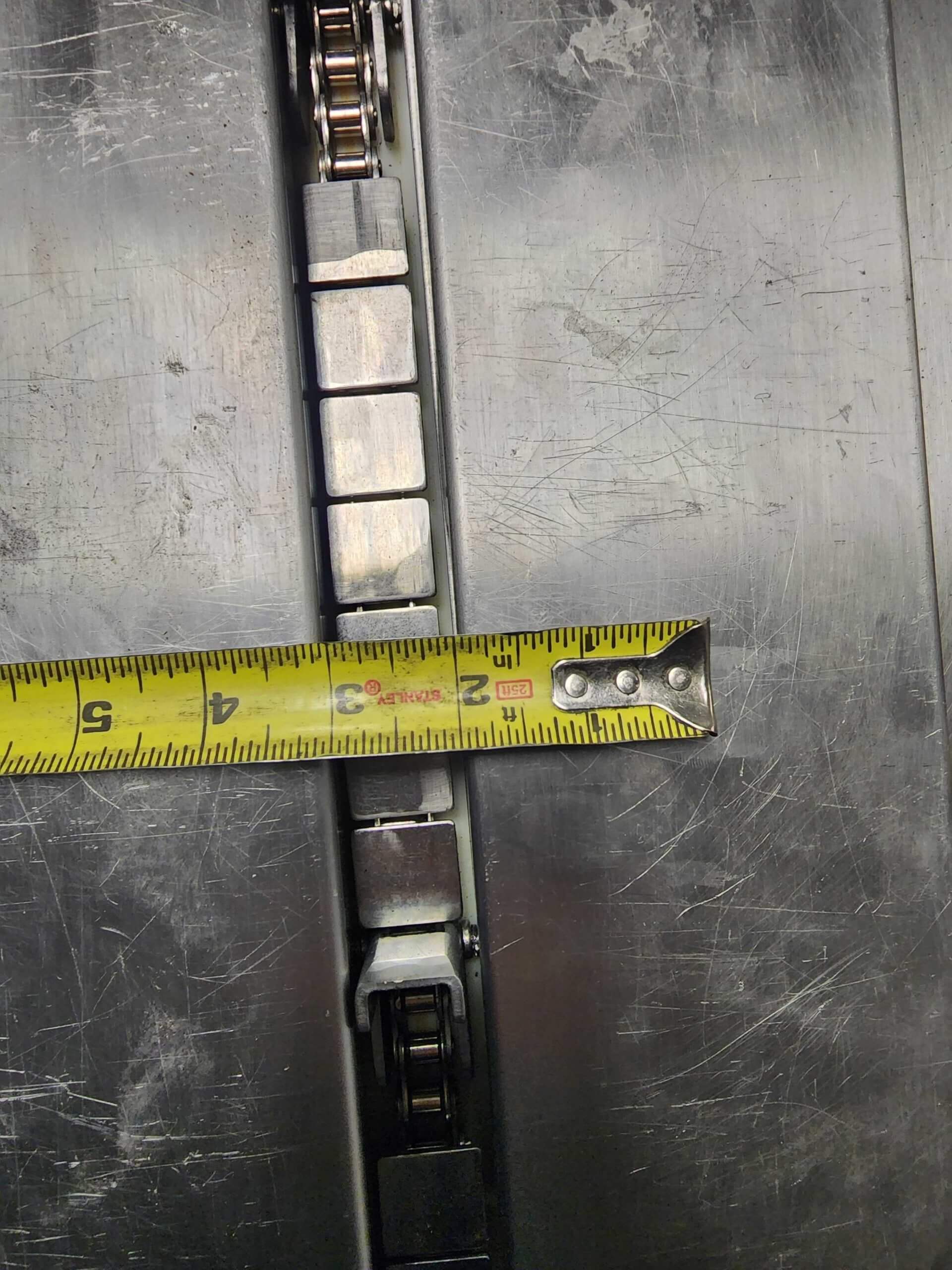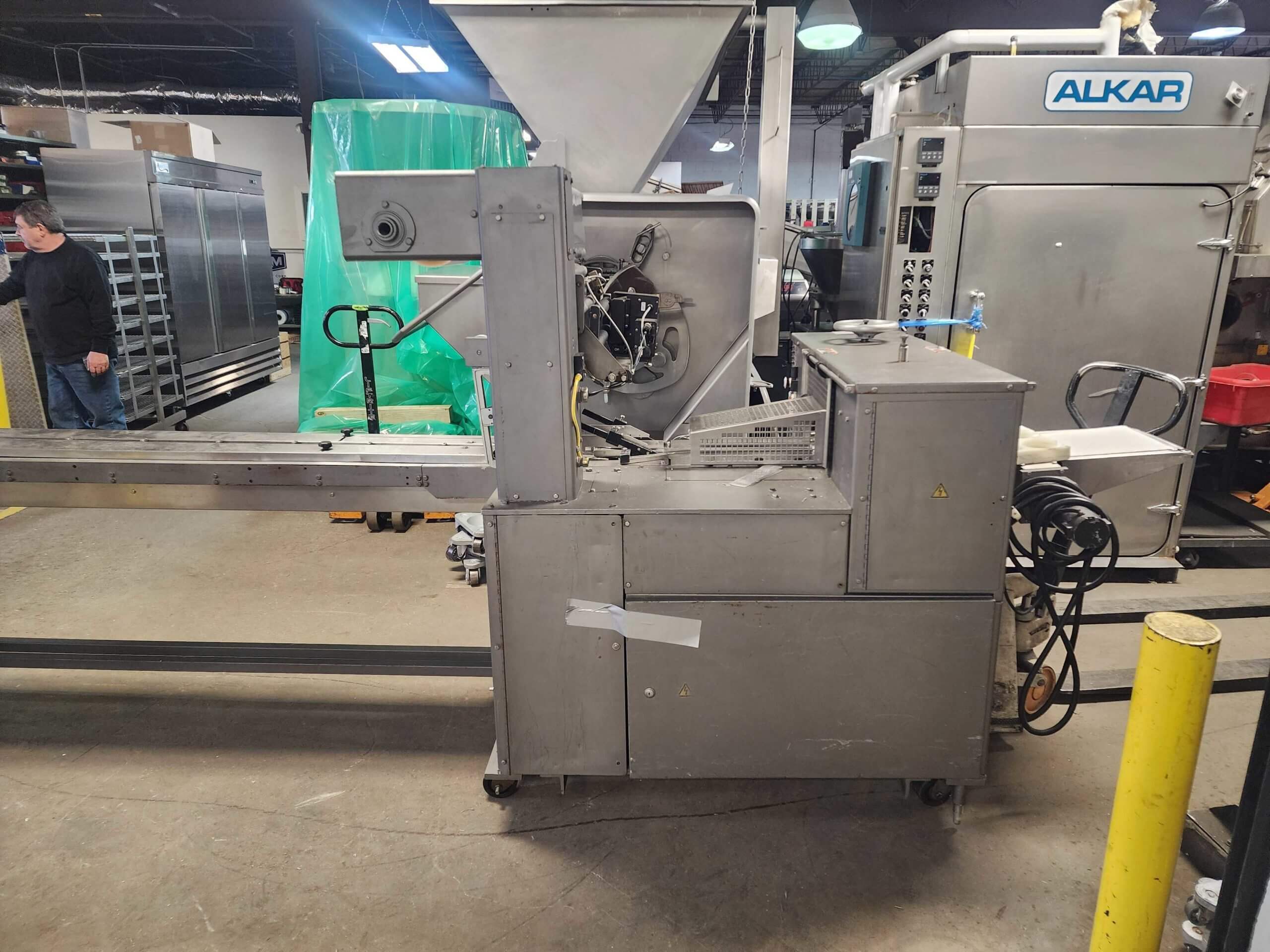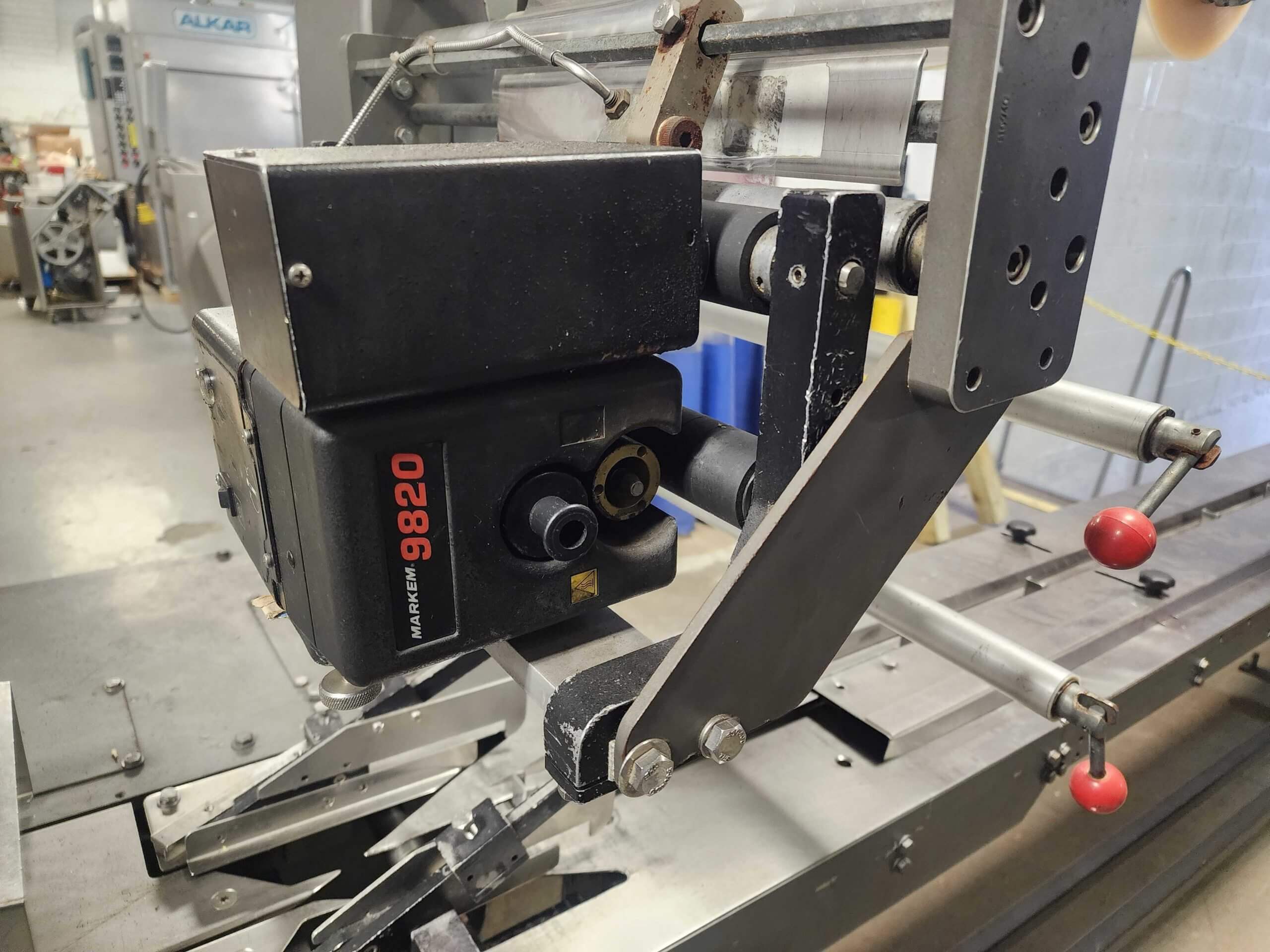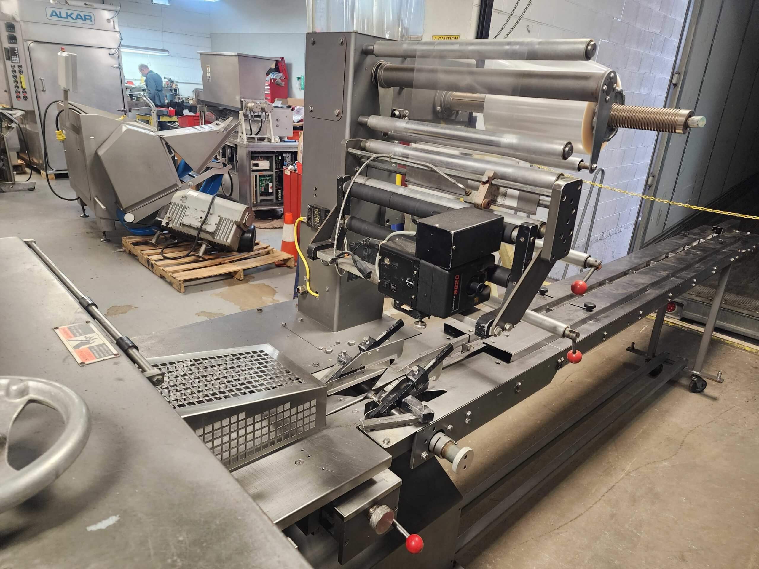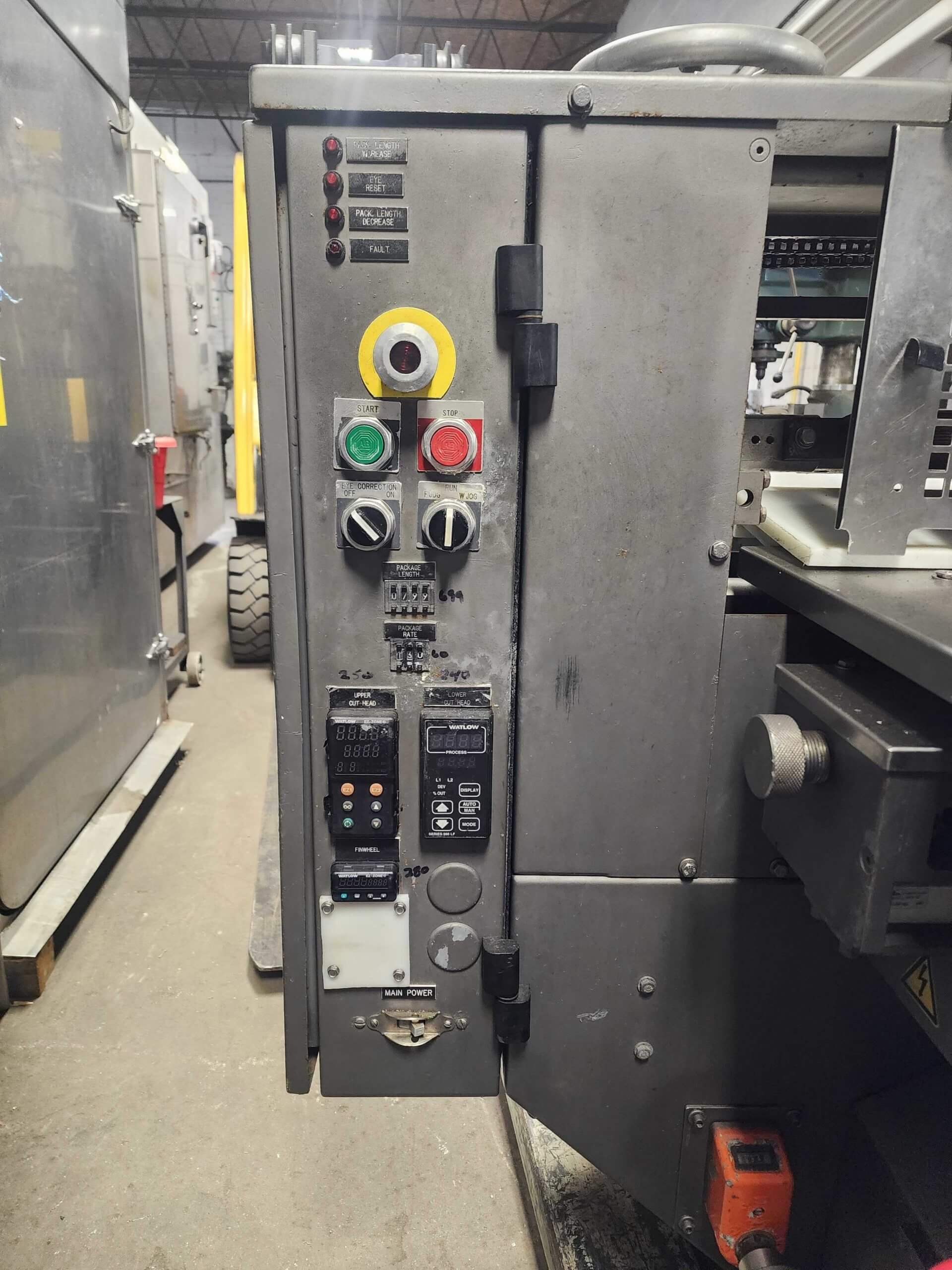 Doboy Mustang IV Wrapper. Horizontal Flow Wrapper with Markem 9820 Coder. Machine is capable of speeds up to 90 CPM. 1 up unit with film registration. Package size range: length up to 15″; height up to 2-1/4″; width up to 6-1/2″. Has 7″ wide crimp seal jaws. Approximate 8′ long lugged chain infeed on 9″ centers, mounted on casters. 208V/3PH/60HZ.