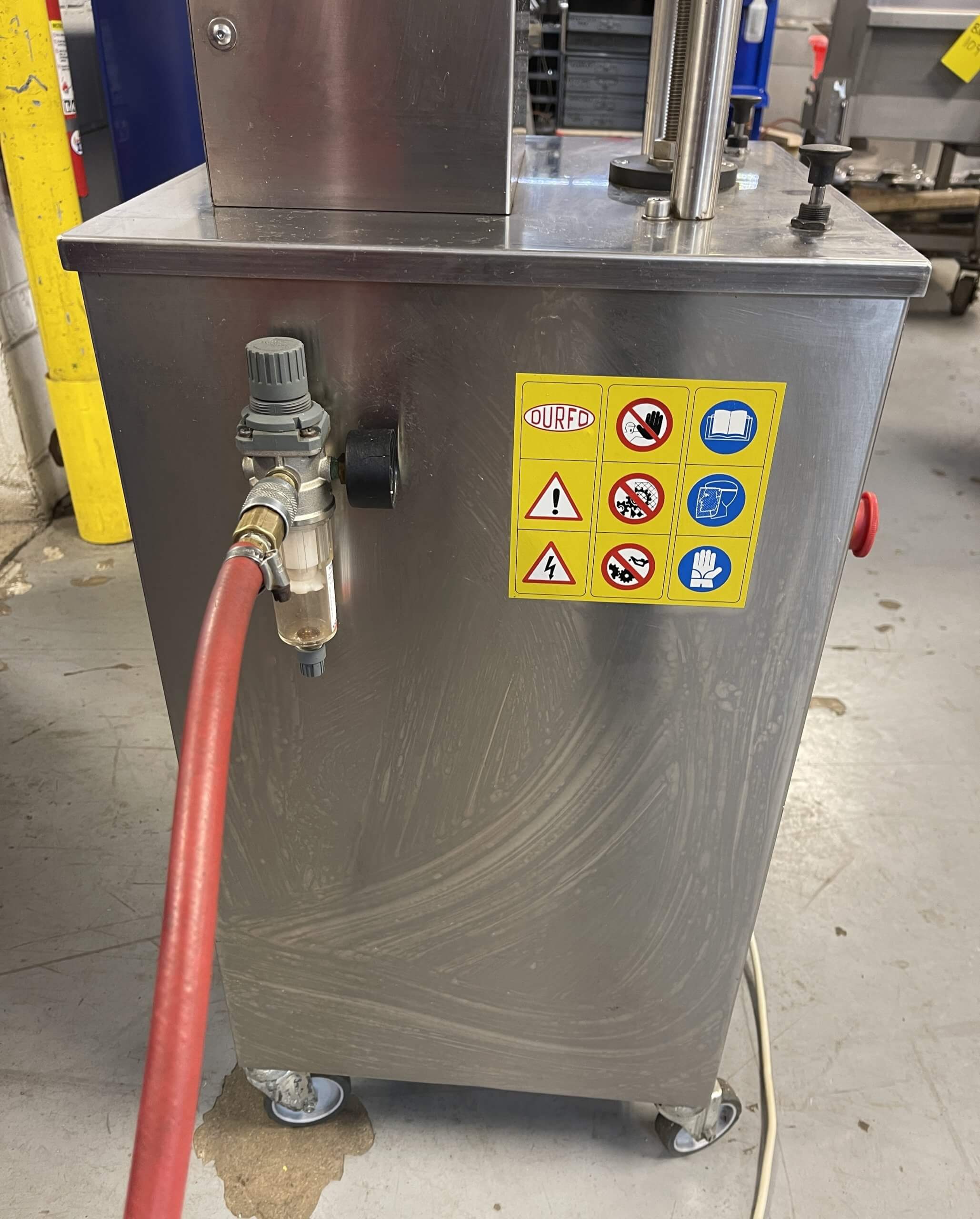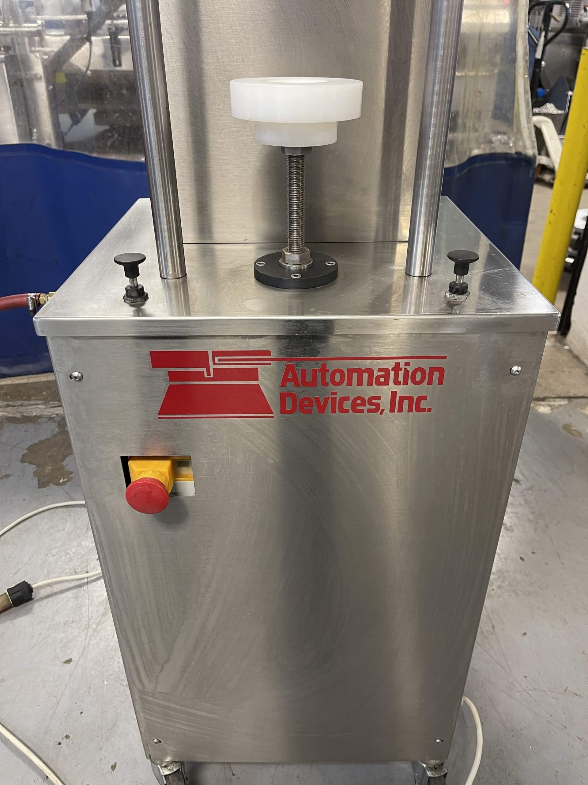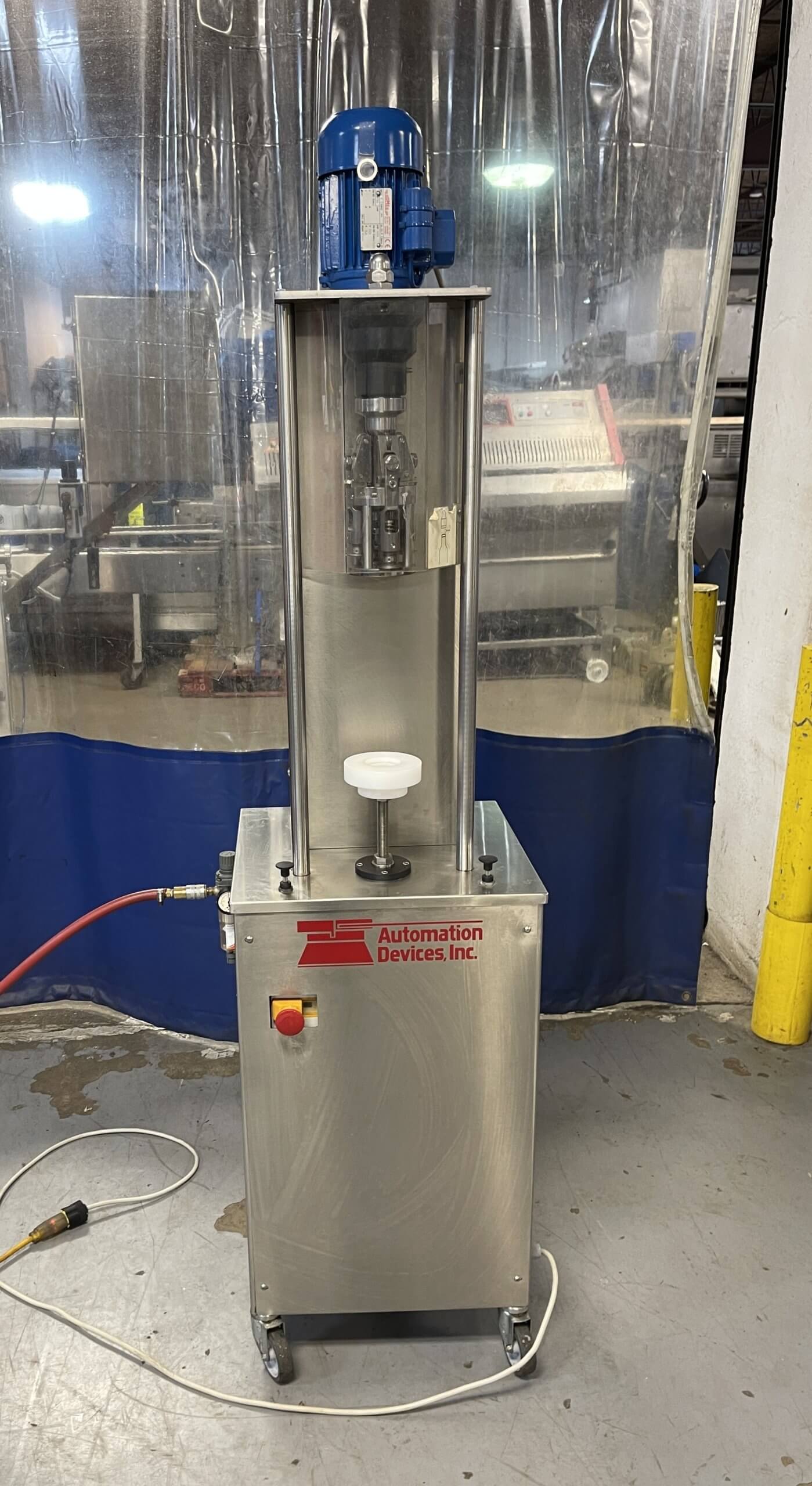 Durfo pneumatic capper for twist off-closures. Operator places the jar in its proper holding-plate and when two start-up side buttons are pressed, the capping head is lowering down and closes the cap in just a few seconds. Universal capping head. 110V/PH/60HZ, requires 6 bars of compressed air.