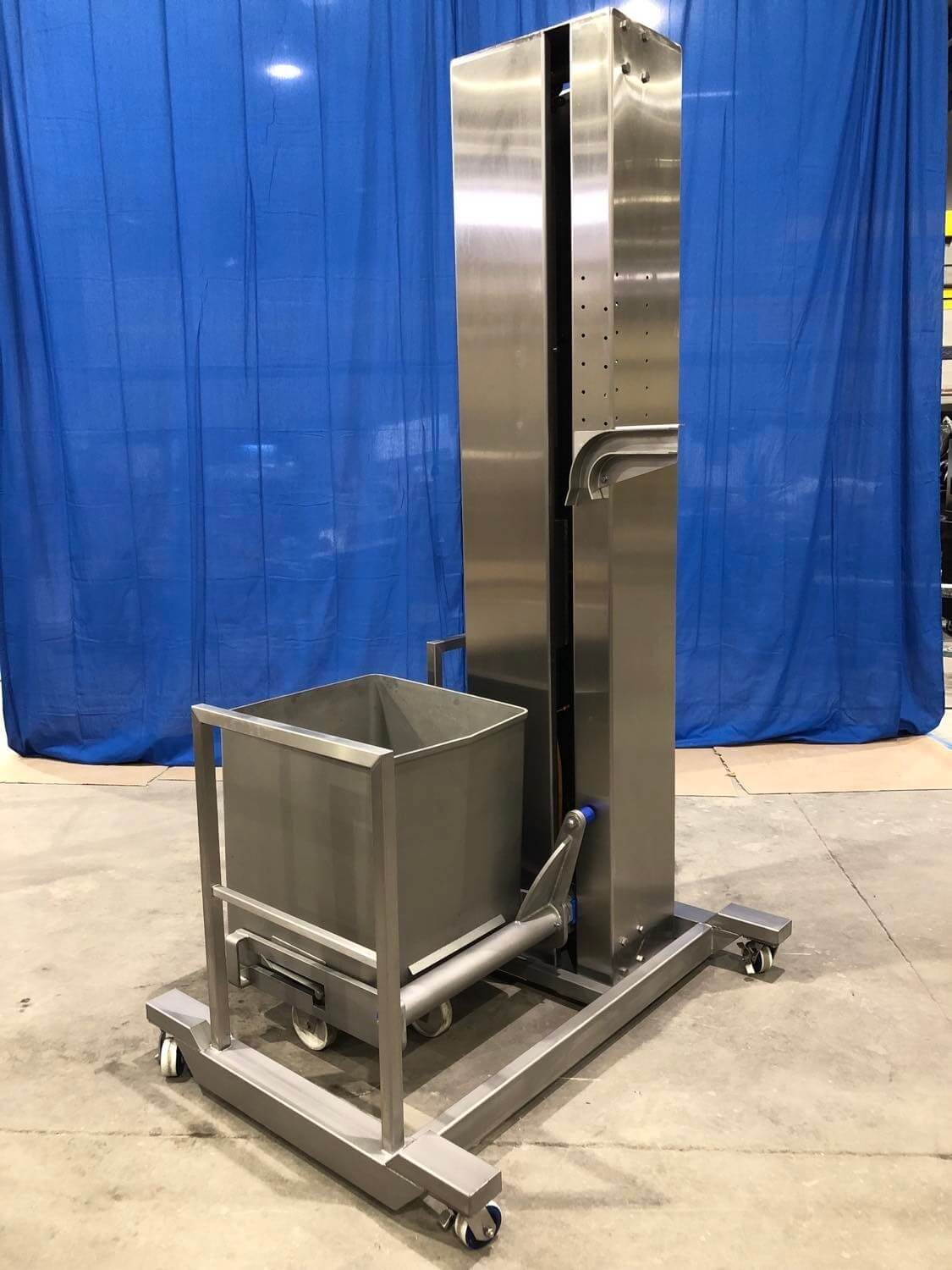 Amfec 2-3K Cart Lift Machine. With portable base, right hand dump, stainless steel c...