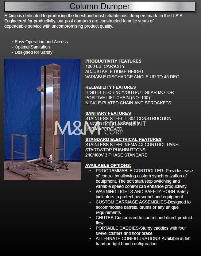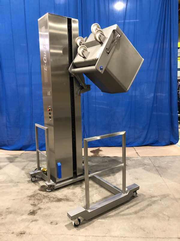 New E-Quip, Model 322 Cart Lift, stainless steel construction, 10′ overall height, 1,000# lift capacity, adjustable dump height up to 96″, Right hand or Left hand discharge, Portable base, 1.5 hp brake motor, 220/480V/3PH/60HZ.