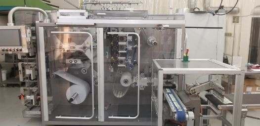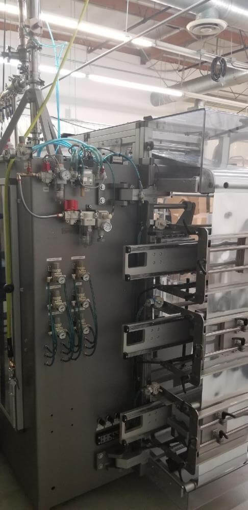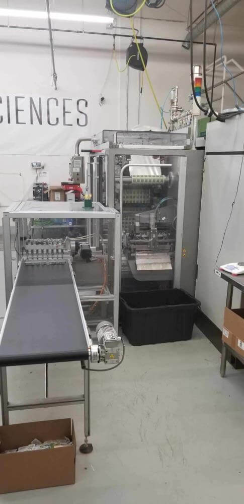 EASYSNAP Pulsar 351 Vertical Form Fill Seal Machine for liquids. Currently set up in 8 lane configuration with speeds up to 320 pouches per minute. Last running pouches of hand sanitizer. 3/50/400V.