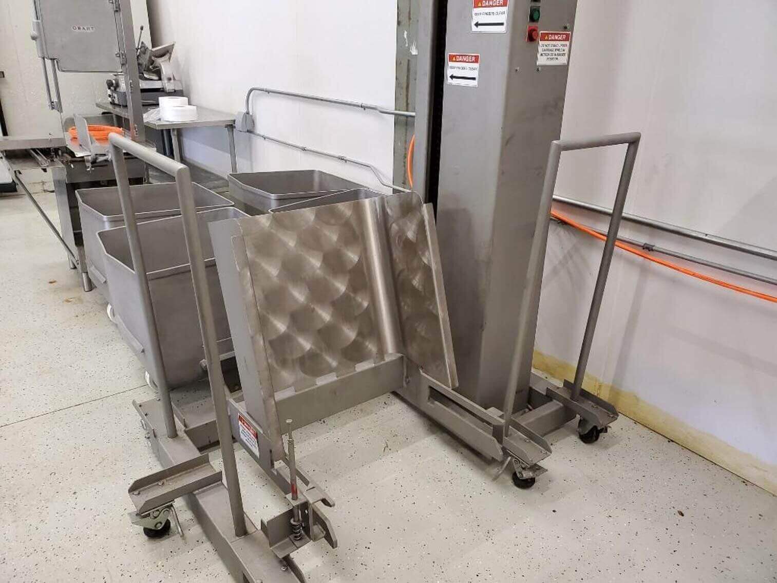 ENSIGHT CD 600 Portable Cart Lift. Stainless steel construction. 121″column height, dump height up to 90″. 2HP motor with brake, 24V DC control voltage, 220V/3PH/60HZ. Left hand discharge. Total lifting weight 800#, chain lift with safety brake. Includes Portable base for mobility.