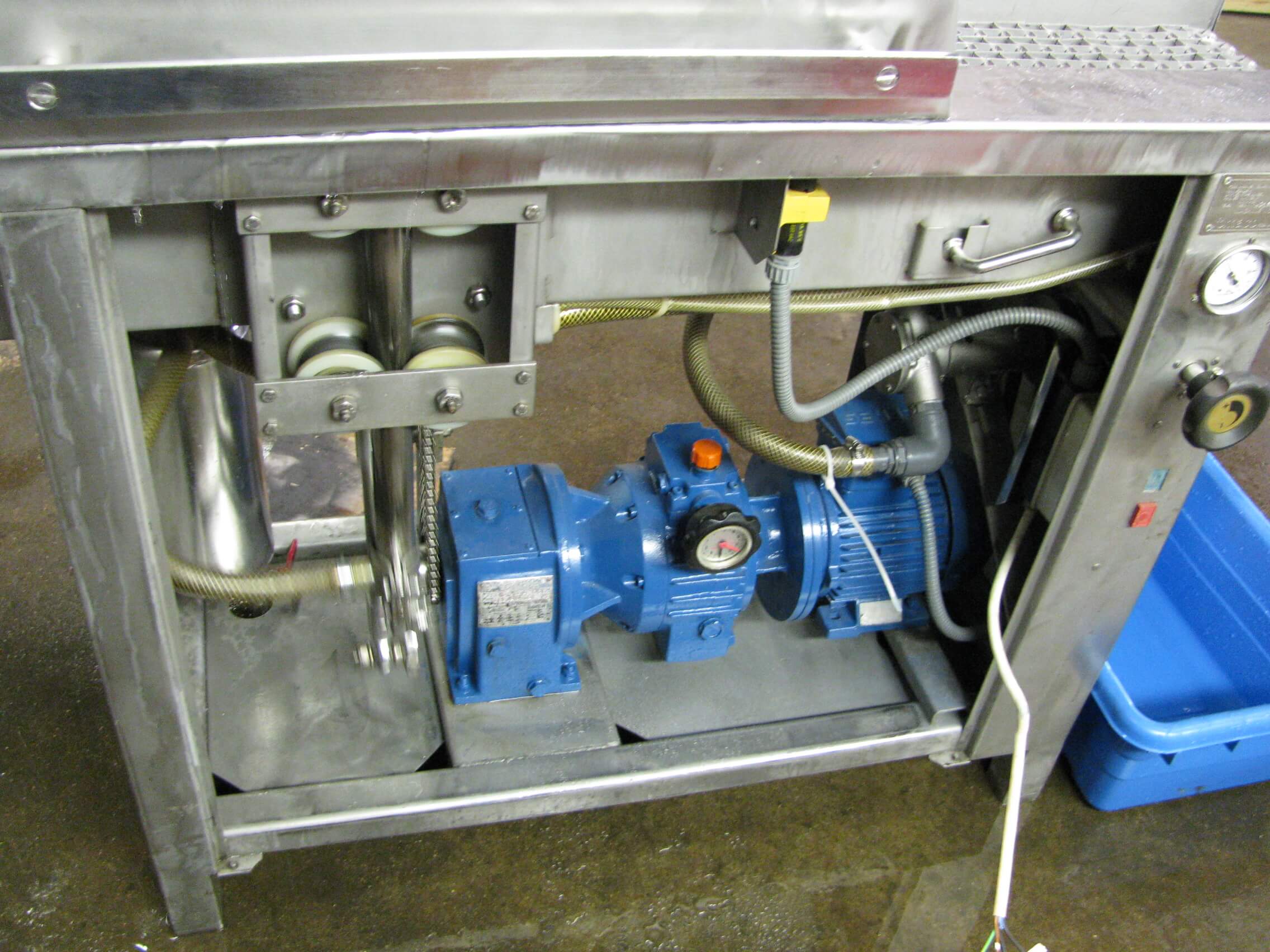 FOMACO 20/40 Pickle Injector. 10″ wide plastic conveyor belt. Set up with 20 double needles. 1.1 kW conveyor drive motor. 2.5 kW Jabsco PFLO brine pump motor. 31 l/minute. 220V/3PH/60HZ, 5.3 Amps.